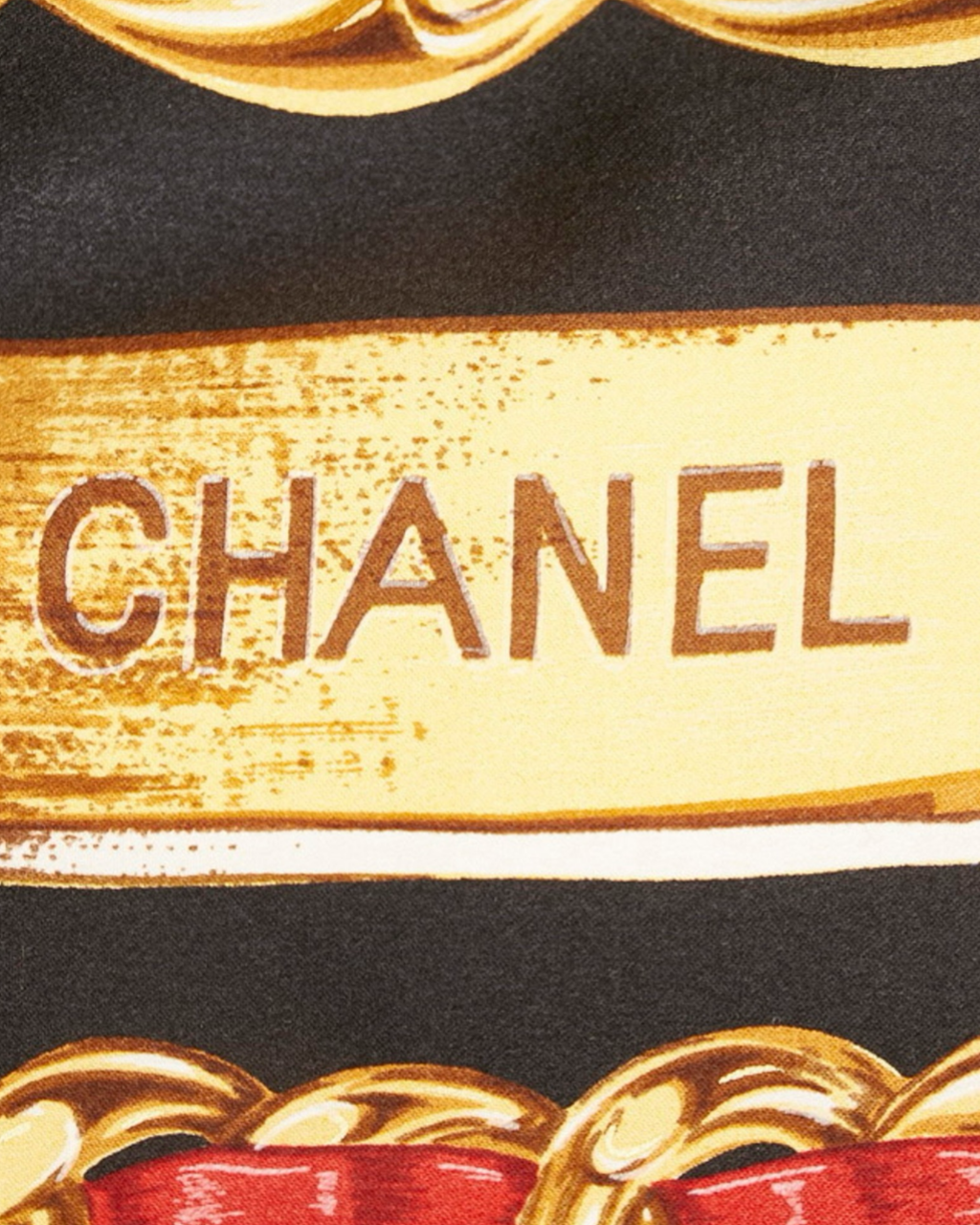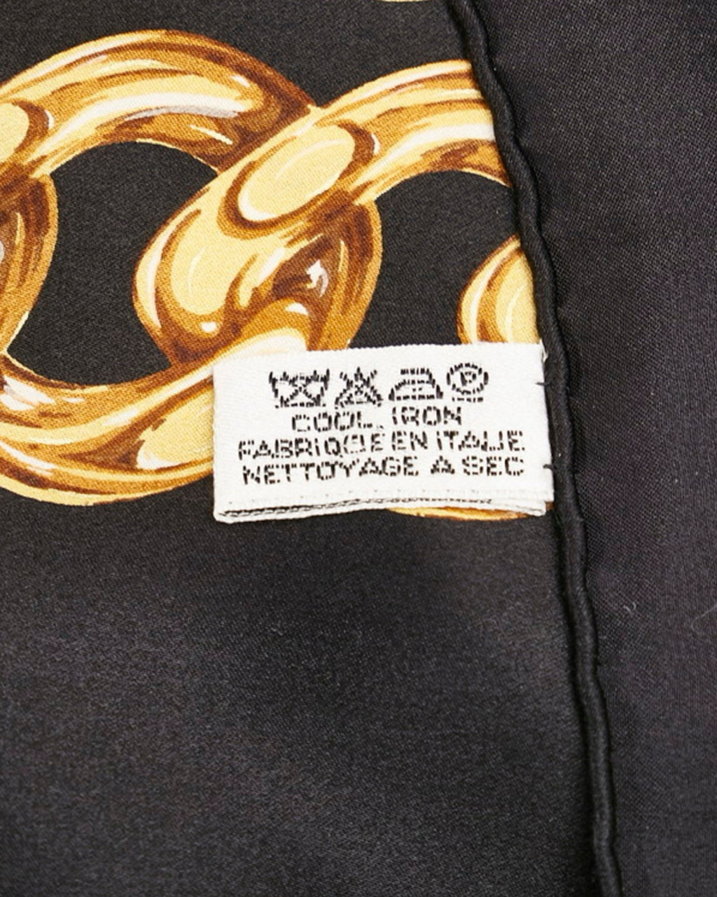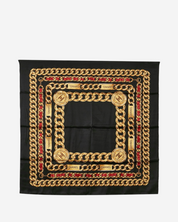 - Descripción: Mascada en color negro con motivo de cadenas doradas