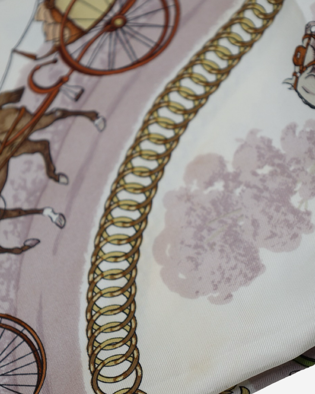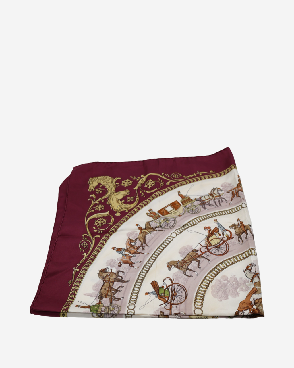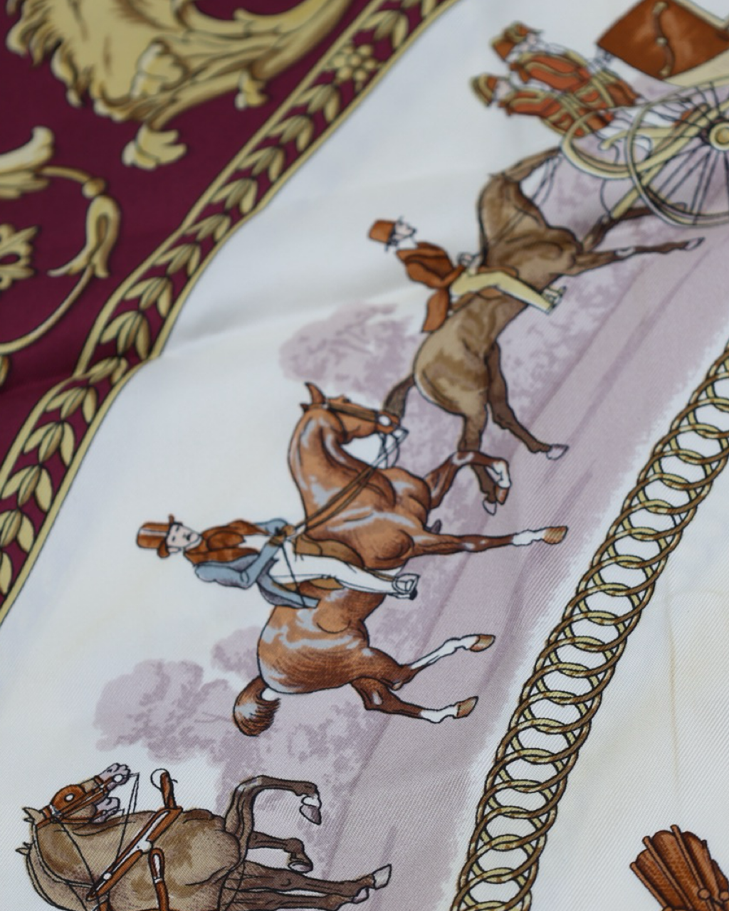 - Descripción: Mascada Hermés en print barroco con caballos, logo frontal, fondo en color vino