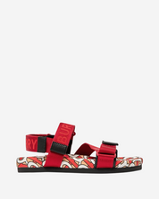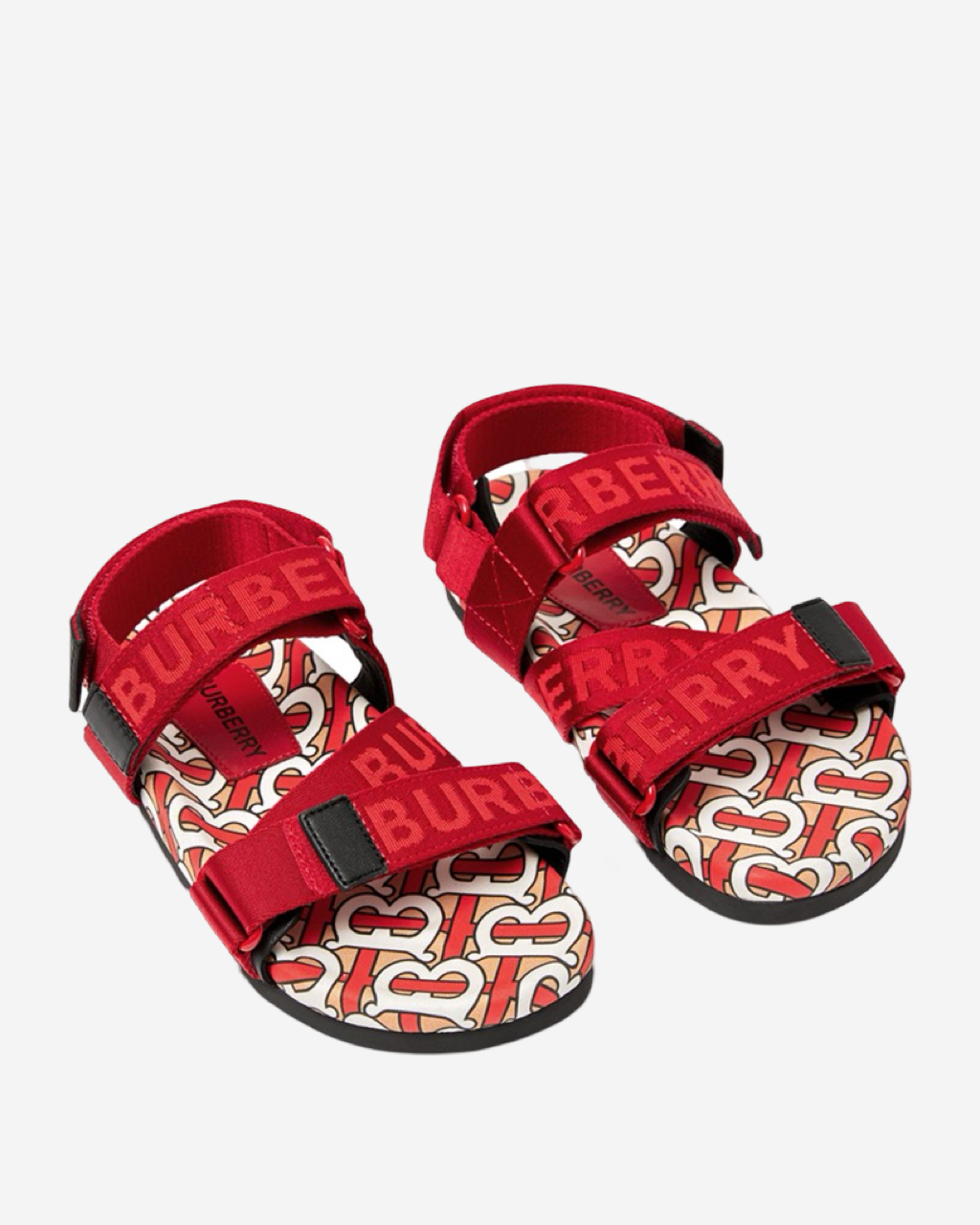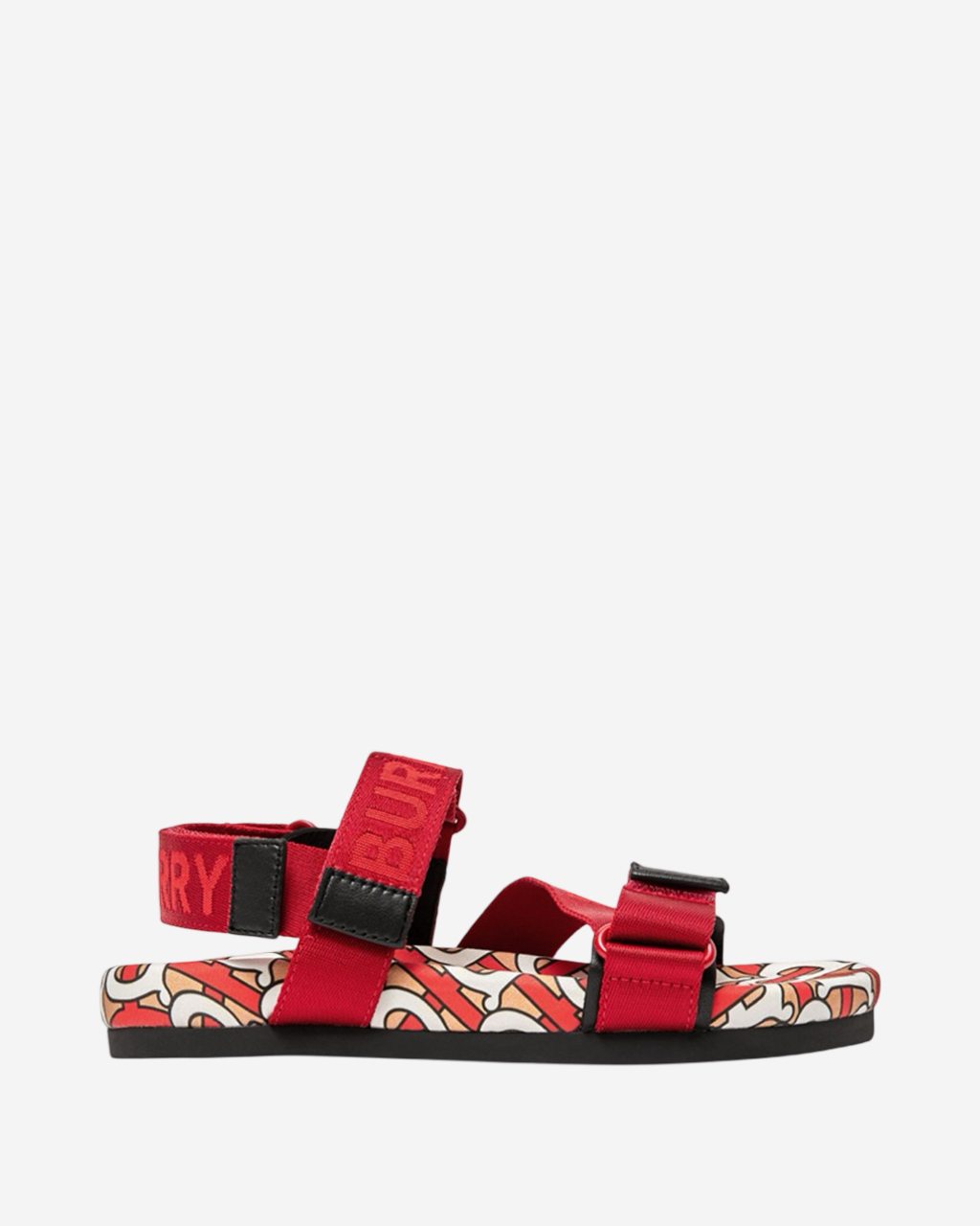 - Descripción: Sandalias Burberry en material textil color rojo con logo grabado, suela en monogram, puntera redondeada