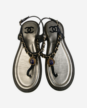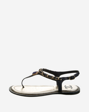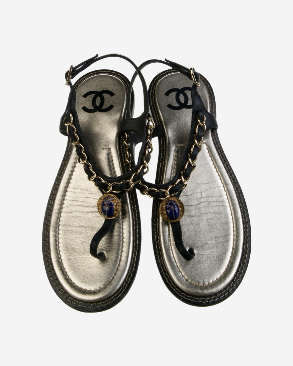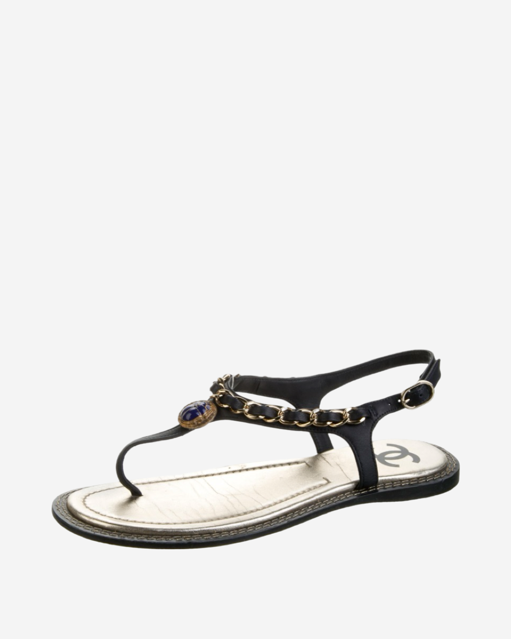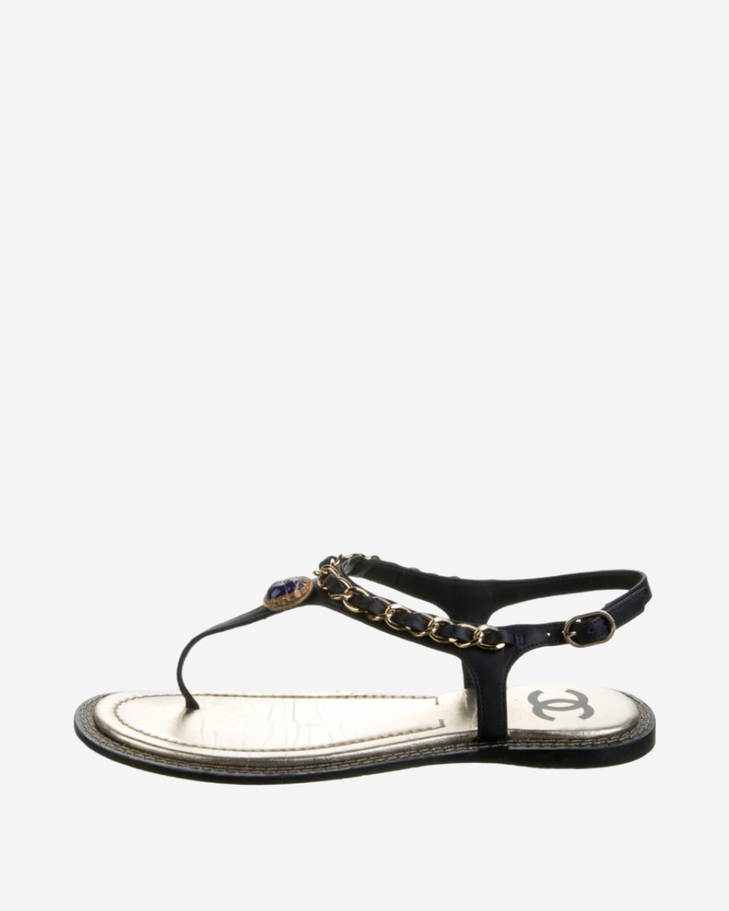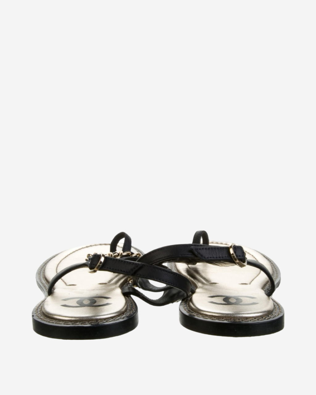 - Descripción: Sandalias Chanel en charol color negro y dorado, hardware color dorado