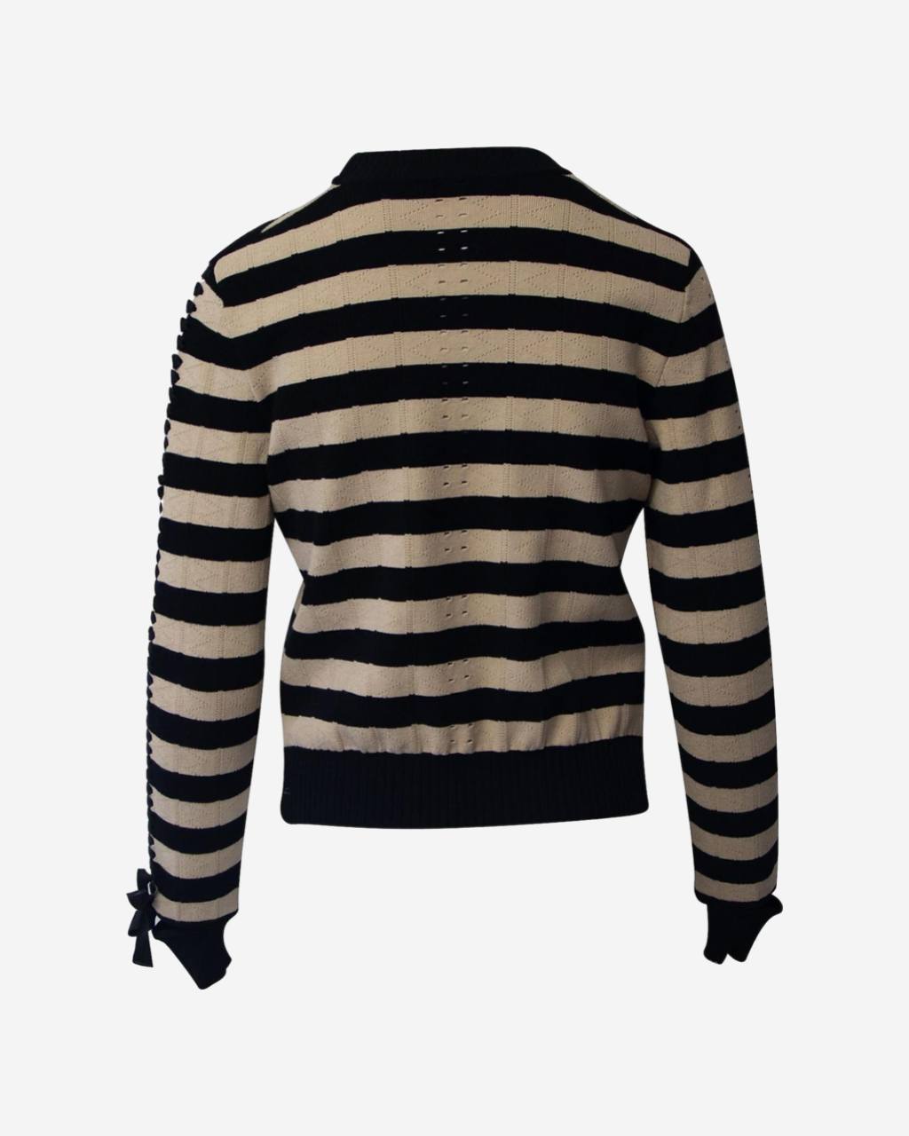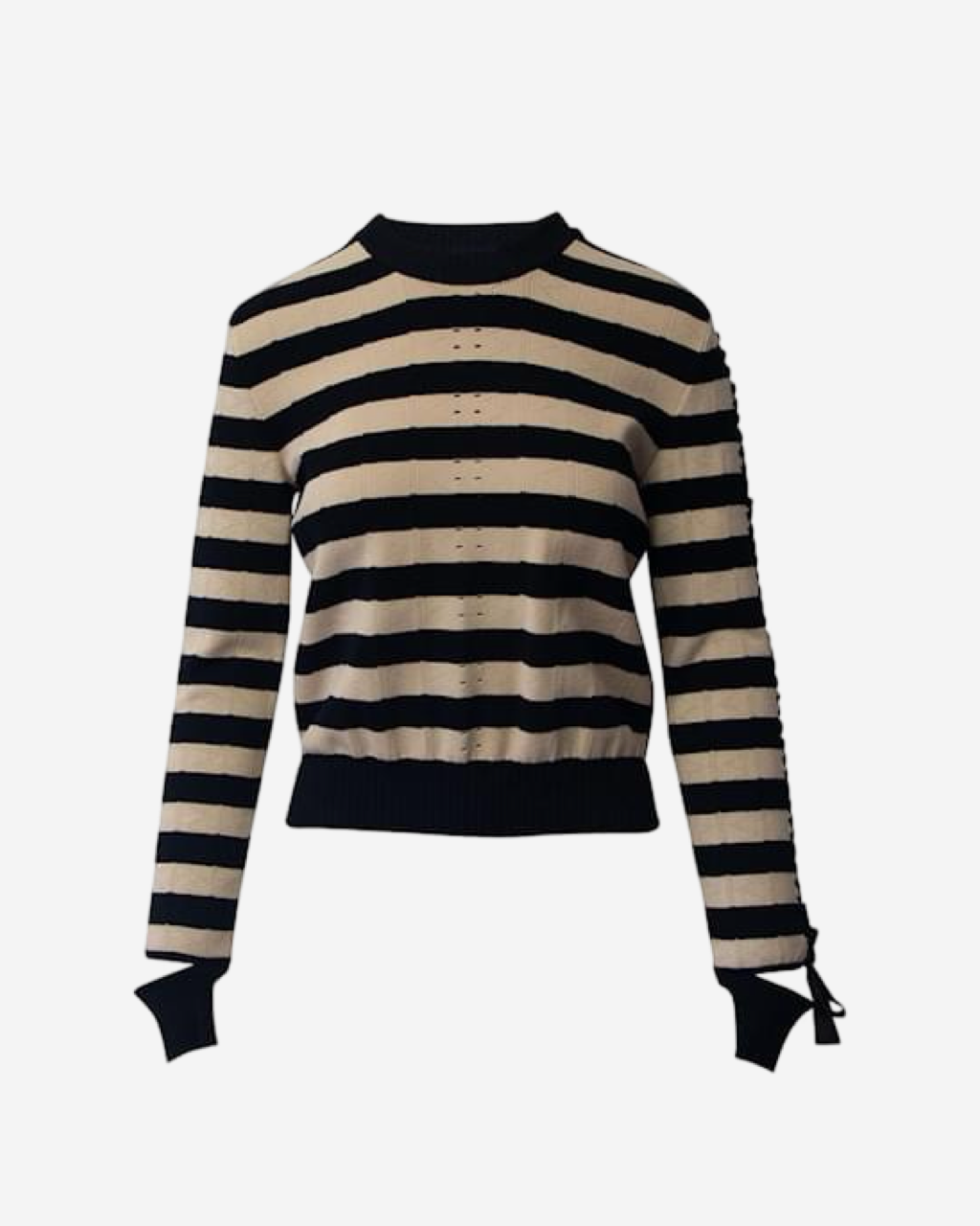 - Descripción: Suéter de rayas en color negro y beige, cuello redondo, manga larga, motivo tejido frontal