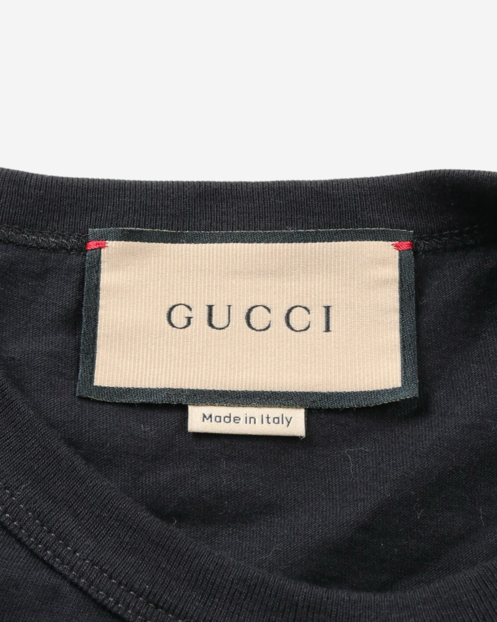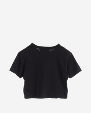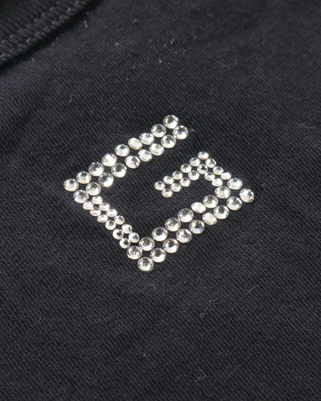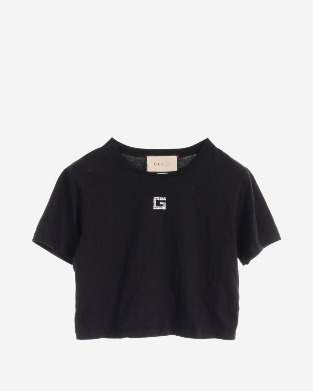 - Descripción: T-Shirt Gucci Cropped en algodón color negro con G característica frontal, cuello redondeado, manga corta