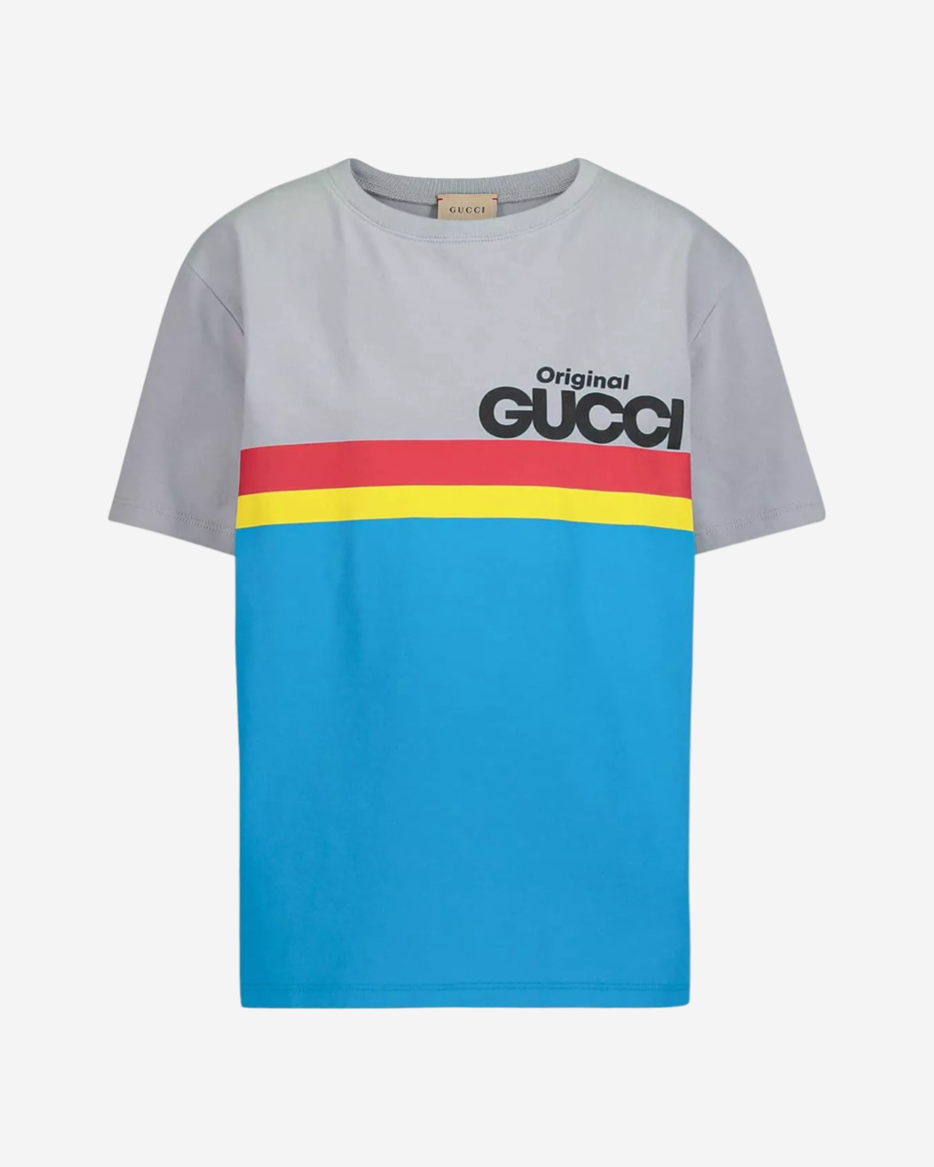 - Descripción: T-Shirt en color azul, detalles en color rojo, amarillo y azul, logo frontal, corte relax