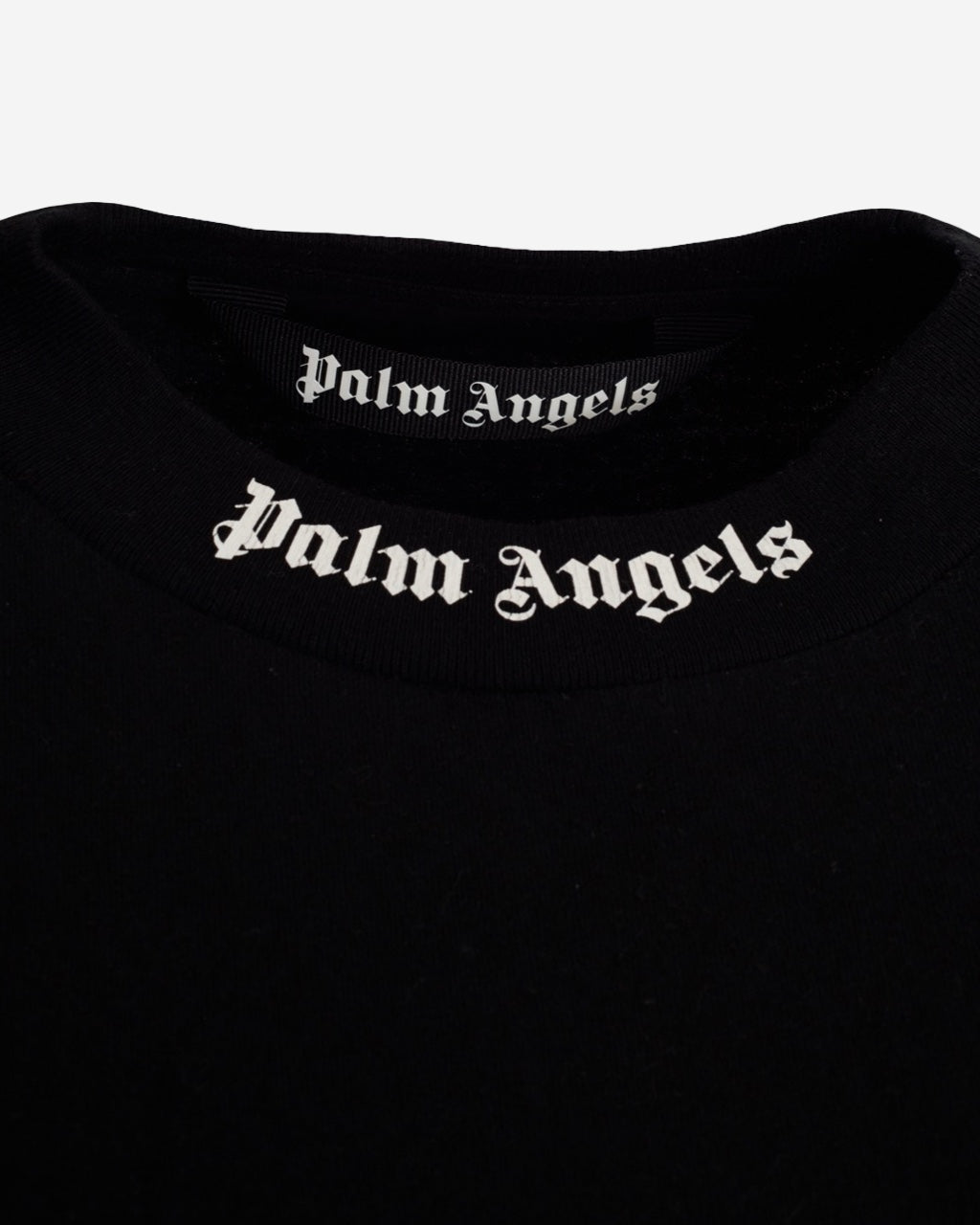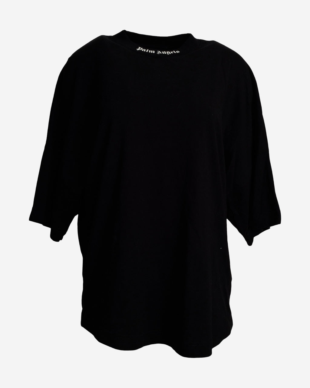 - Descripción: T-Shirt Palm Angels en color negro, cuello redondo alto con print contrastante en color blanco, manga corta, corte recto, print en logo trasero
