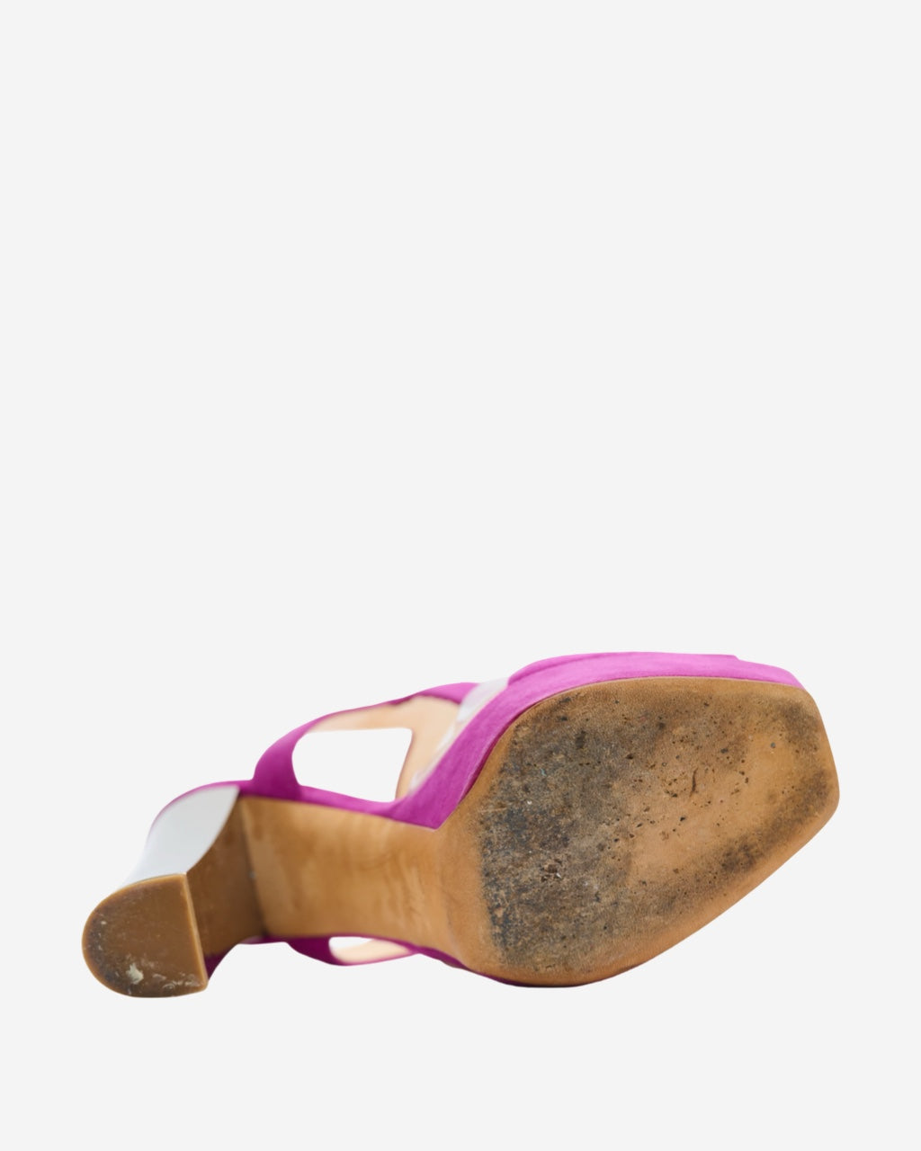 - Descripción: Sandalias de tacón en gamuza color rosa, puntera cuadrada abierta, ajuste con strap al tobillo, tacón ancho, hardware en tono plateado