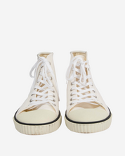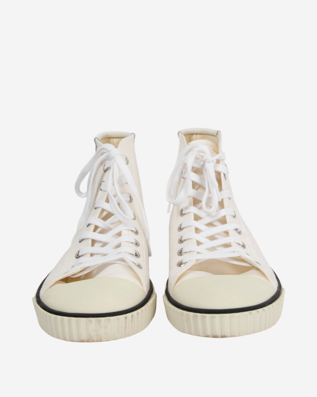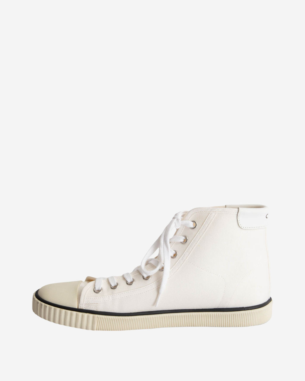 - Descripción: Tenis Celine en canvas color blanco, mid, ajuste con agujetas, suela de goma en color blanco, ribete en negro