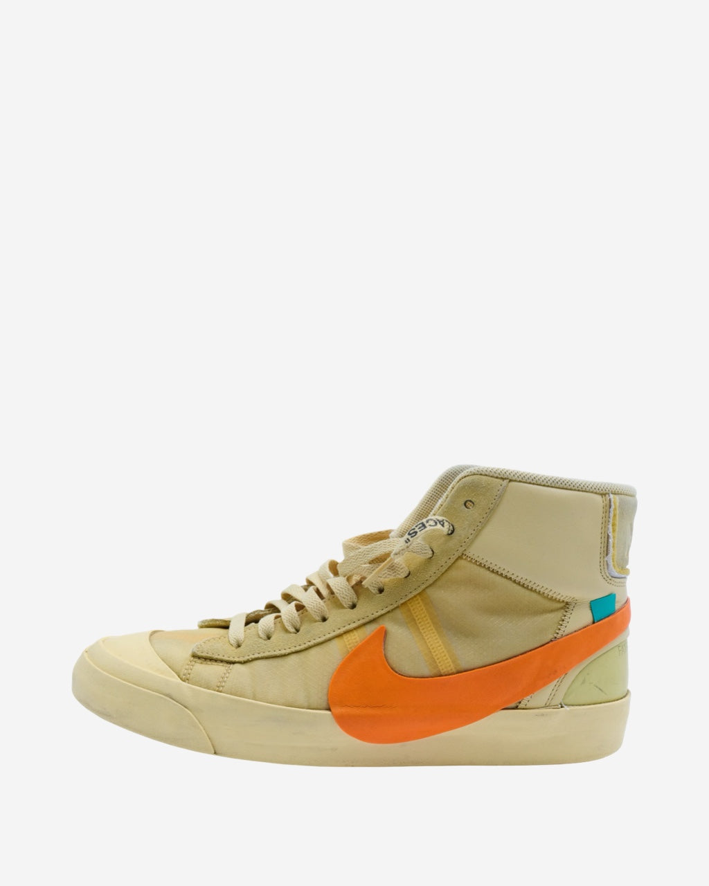 - Descripción: Tenis Off White x Nike blazer en color beige/amarillo, puntera redondeada, logo característico en los laterales color naranja, ajuste con agujetas, suela de goma, logo en la parte posterior en gamuza