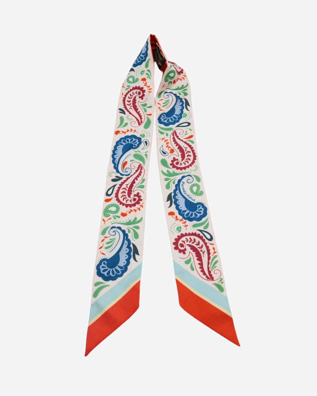 - Descripción: Twilly Hermès con motivos multicolores y panteras, fondo en color naranja