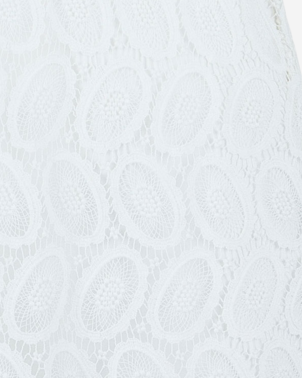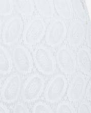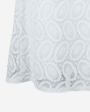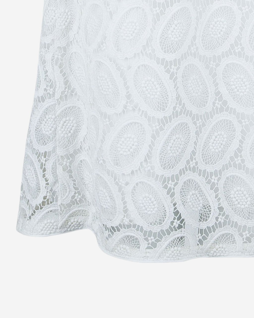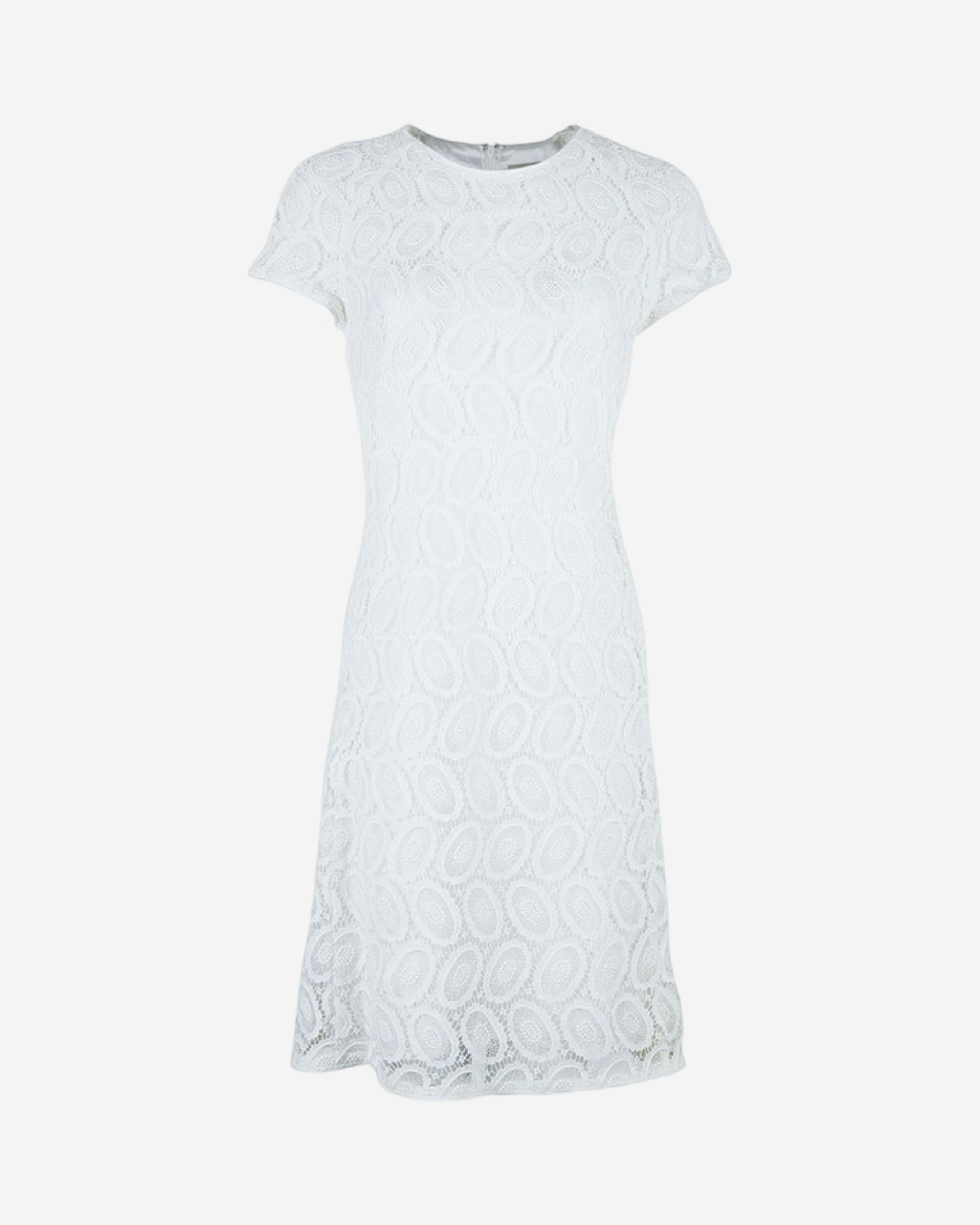 • Descripción: Vestido de encaje en color blanco, manga corta, cuello redondo, largo midi