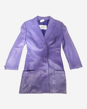 - Descripción: Vestido de blazer en piel color morado, ajuste con botones, manga larga, corte mini