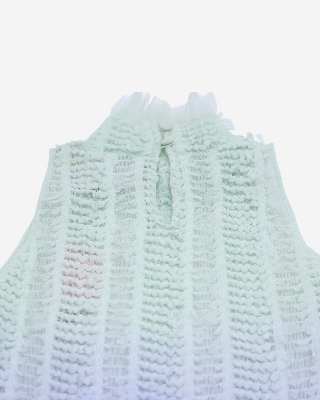 - Descripción: Vestido rutched en color azul degradado a morado, sin mangas, cuello alto redondo, largo mini