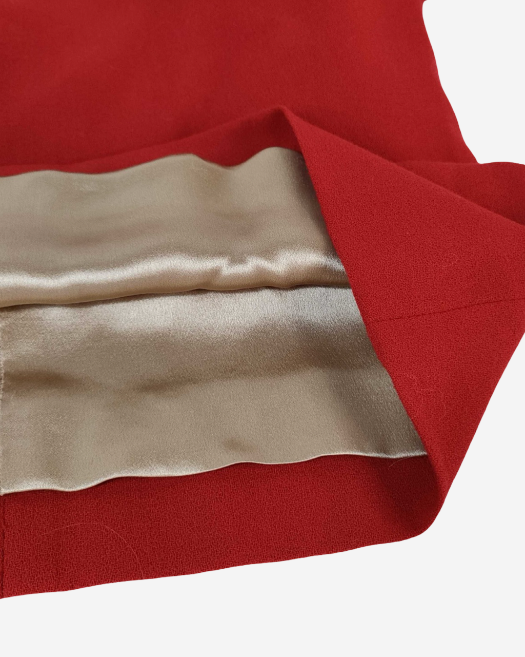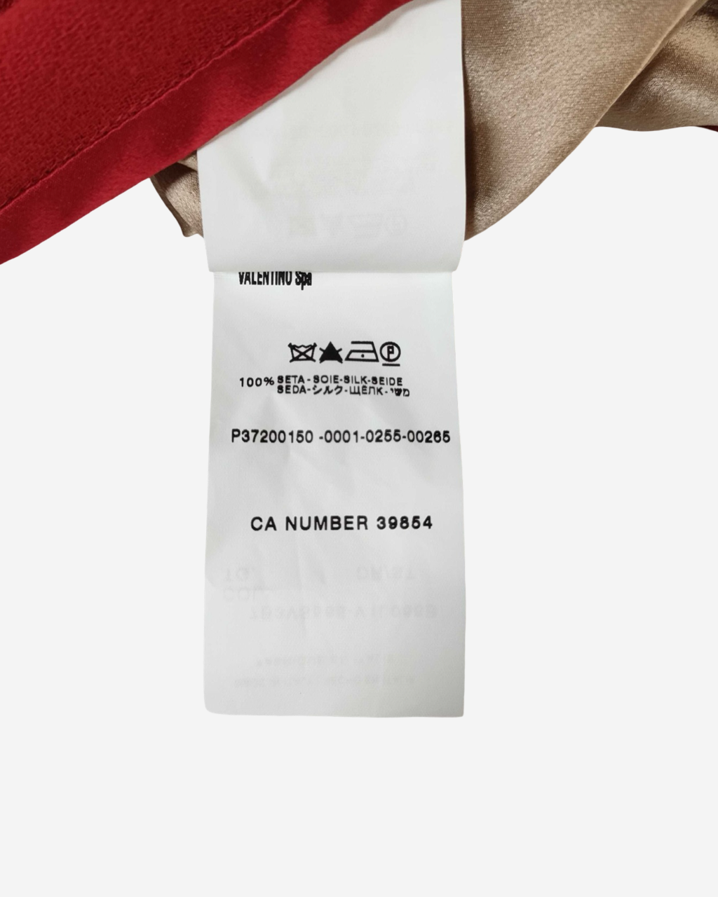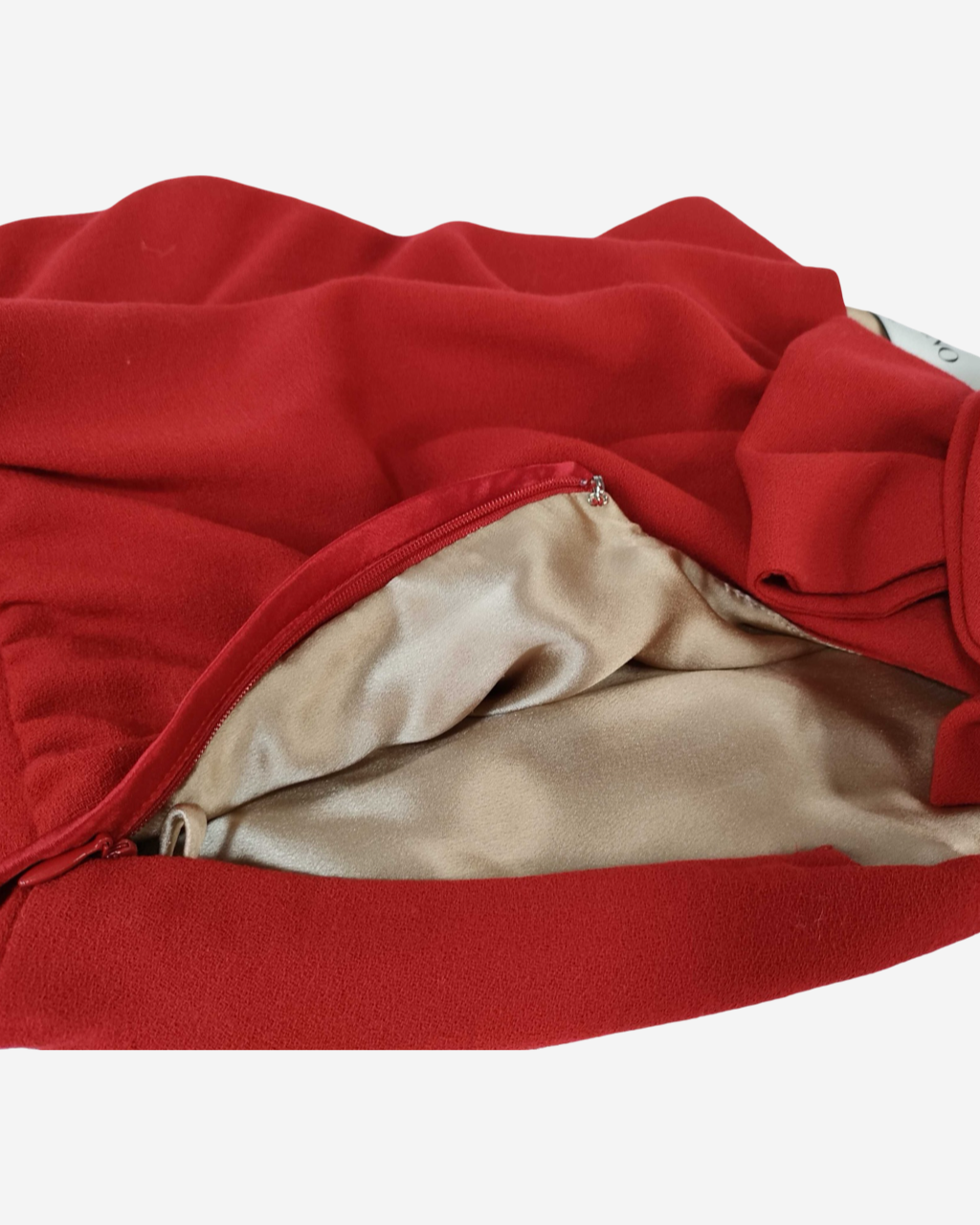 - Descripción: Vestido Valentino en color rojo, largo midi, motivo de moño en el lateral, ajuste con cierre, forro interior satinado