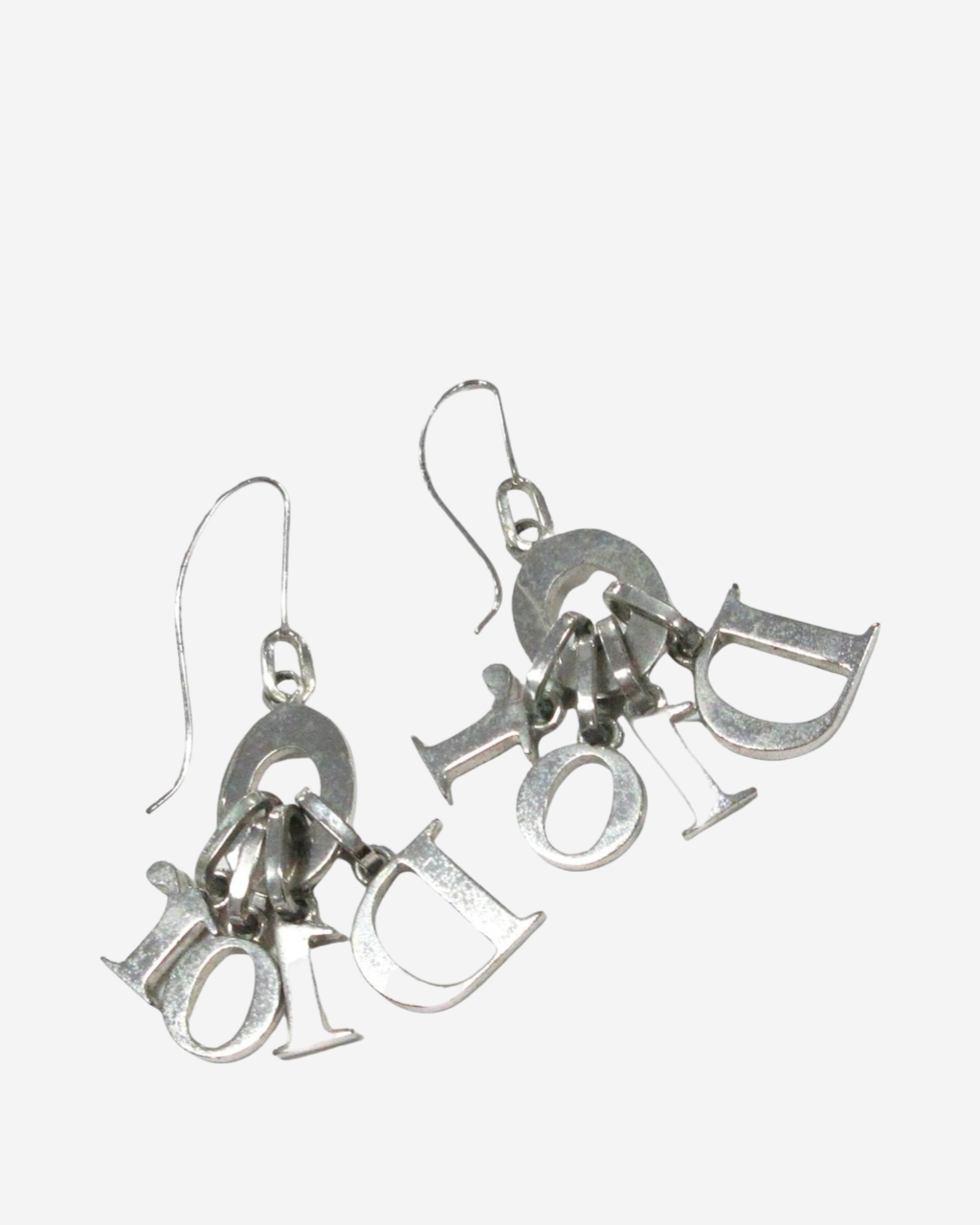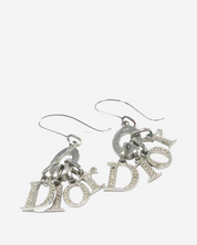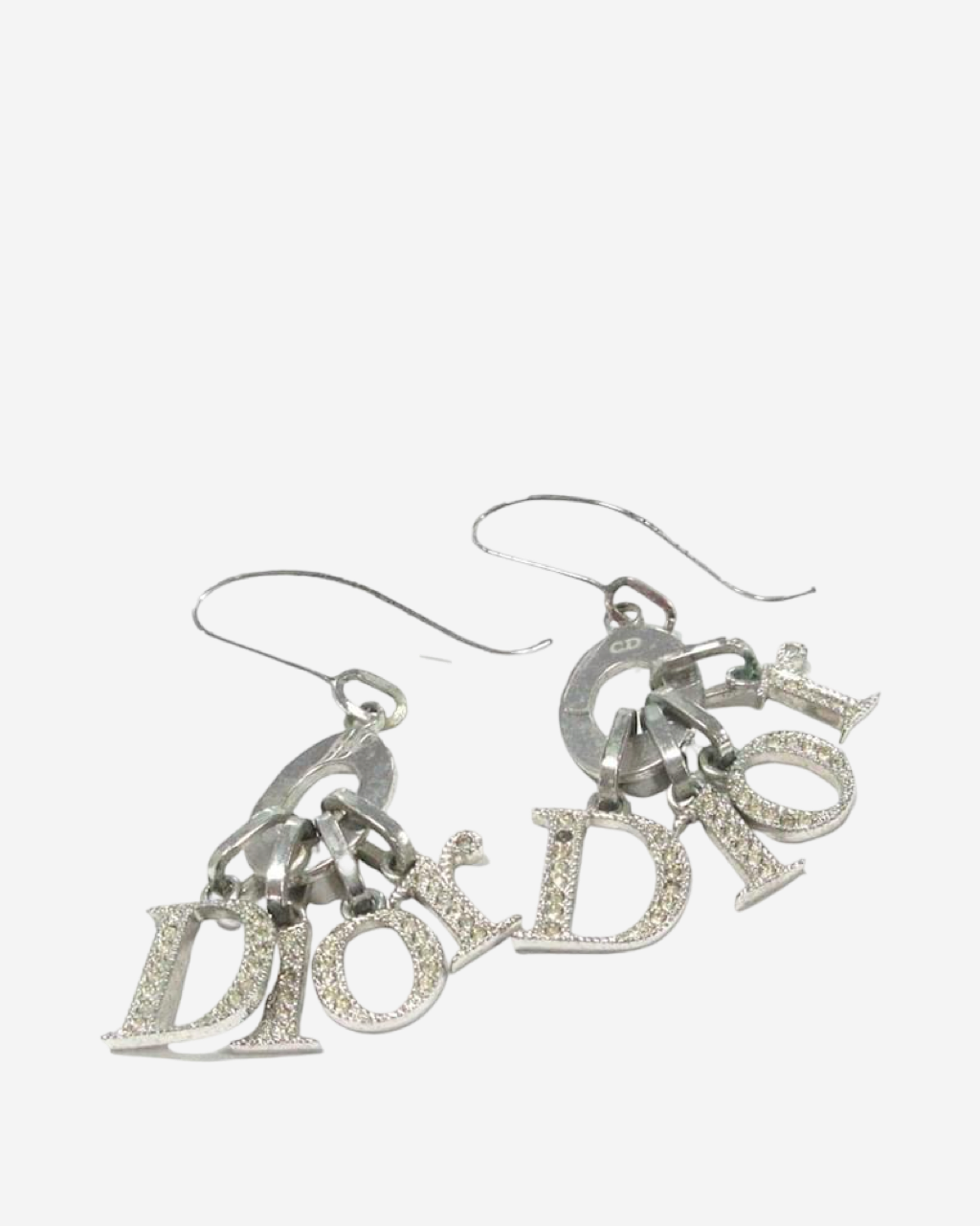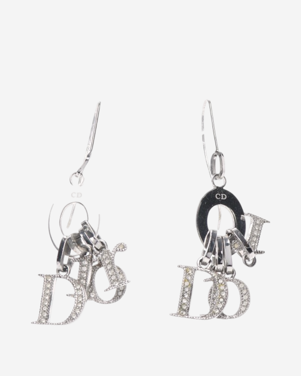 - Descripción: Aretes colgantes Dior con iniciales características en rhinestones