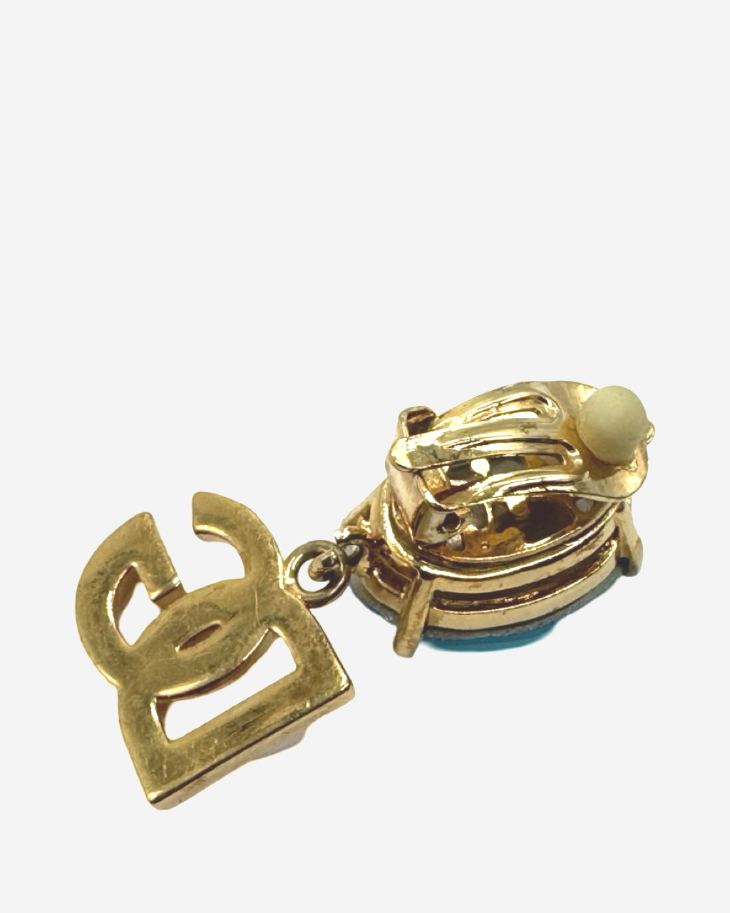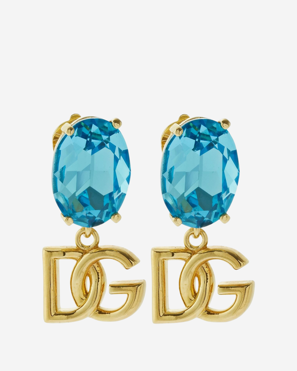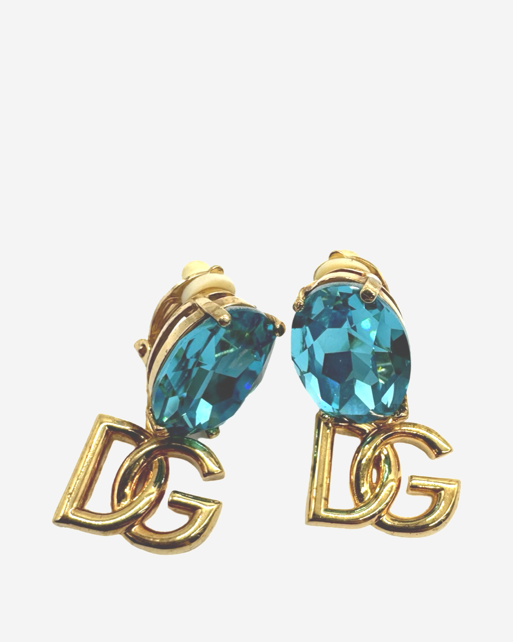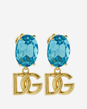 - Descripción: Aretes con logo DG característico colgante, piedra en tono azul, broche a presión