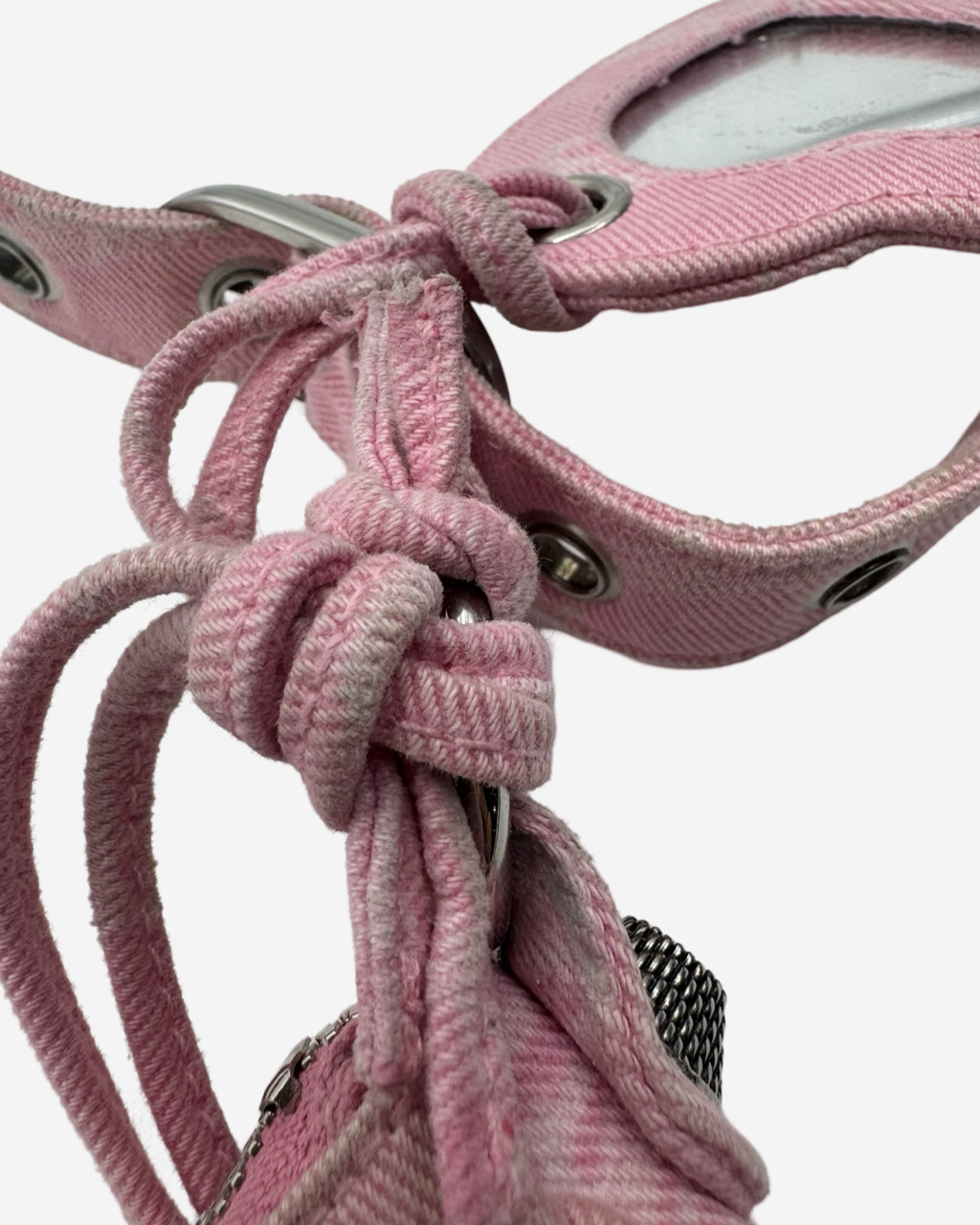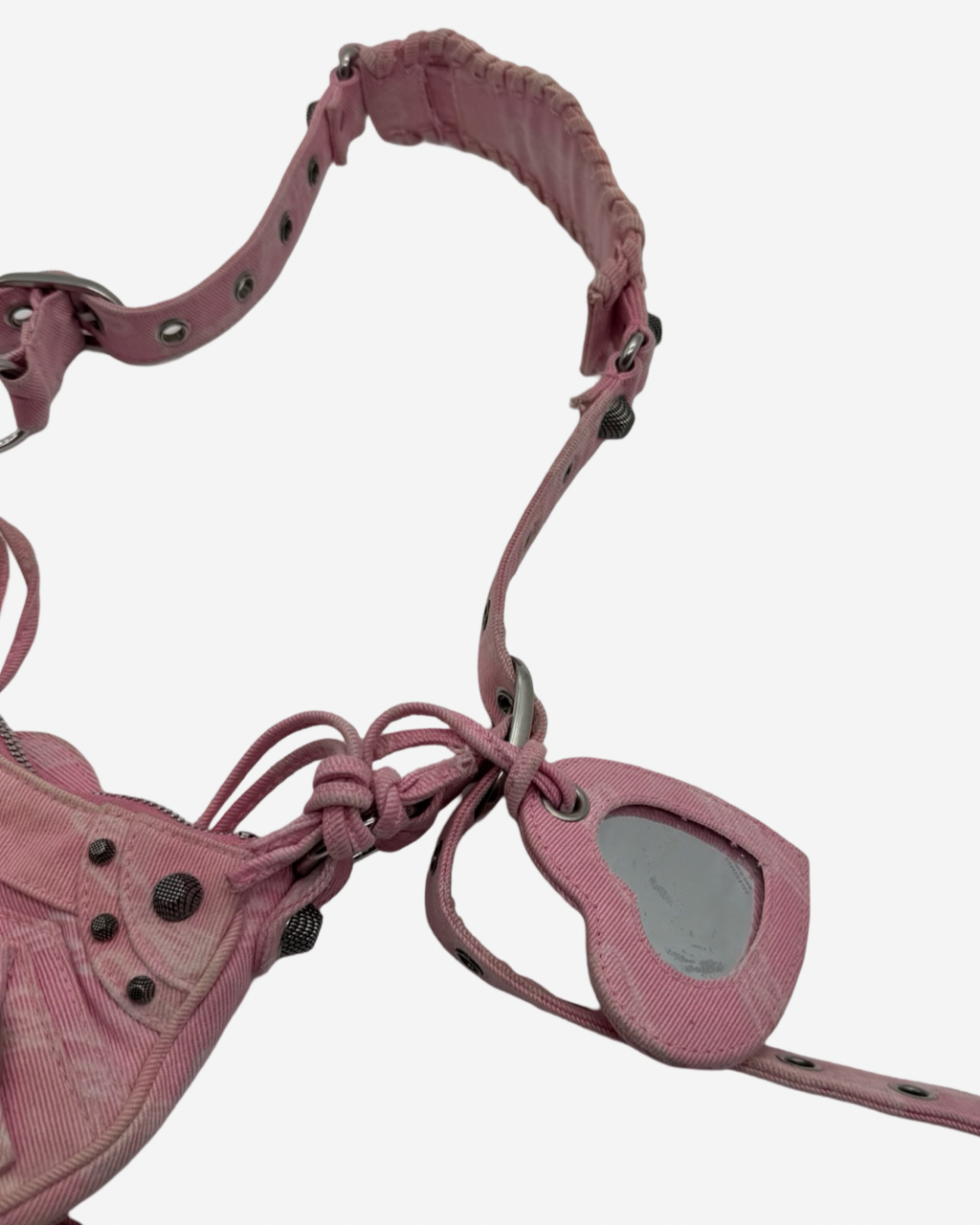 - Descripción: Bolsa cruzada en denim color rpsa con zipper frontal, cierre al tope, detalles en studs, hardware efecto envejecido