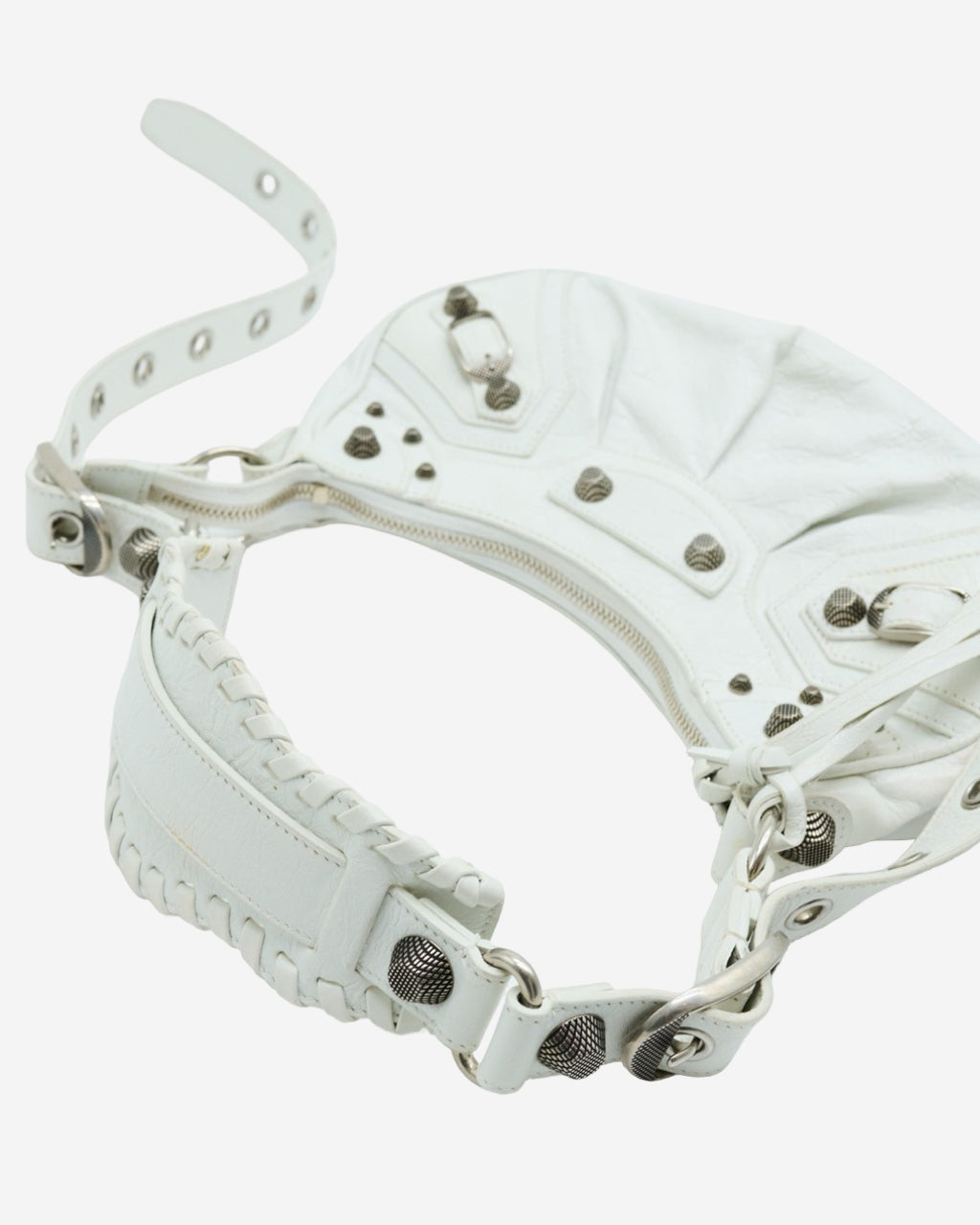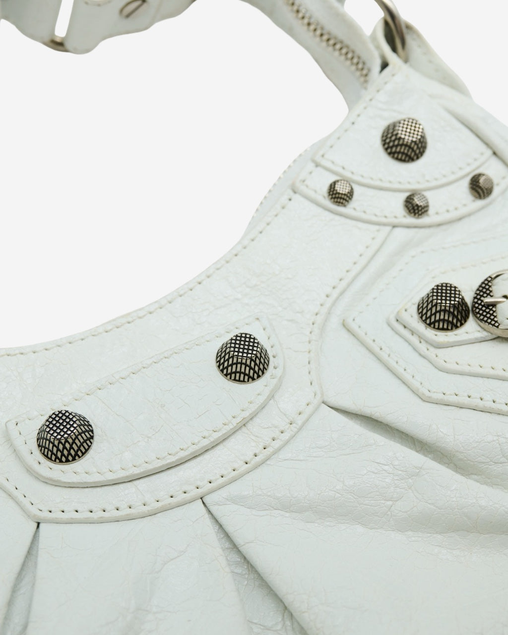 - Descripción: Bolsa de hombro Balenciaga en piel color blanco, motivo de studs característicos, cierre de doble sentido al tope, asa larga ajustable, forro interior textil en color negro con bolsillos, hardware en tono plateado