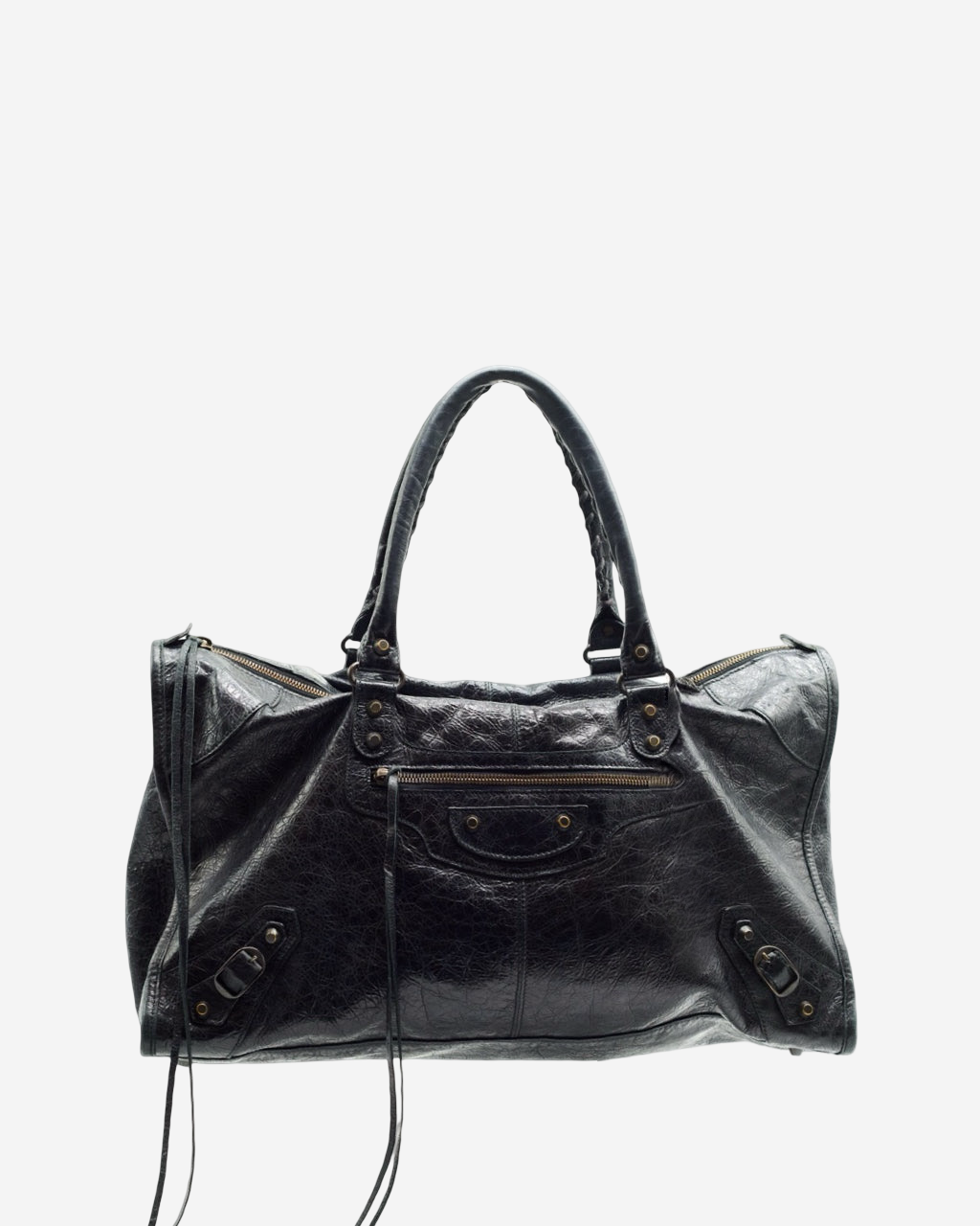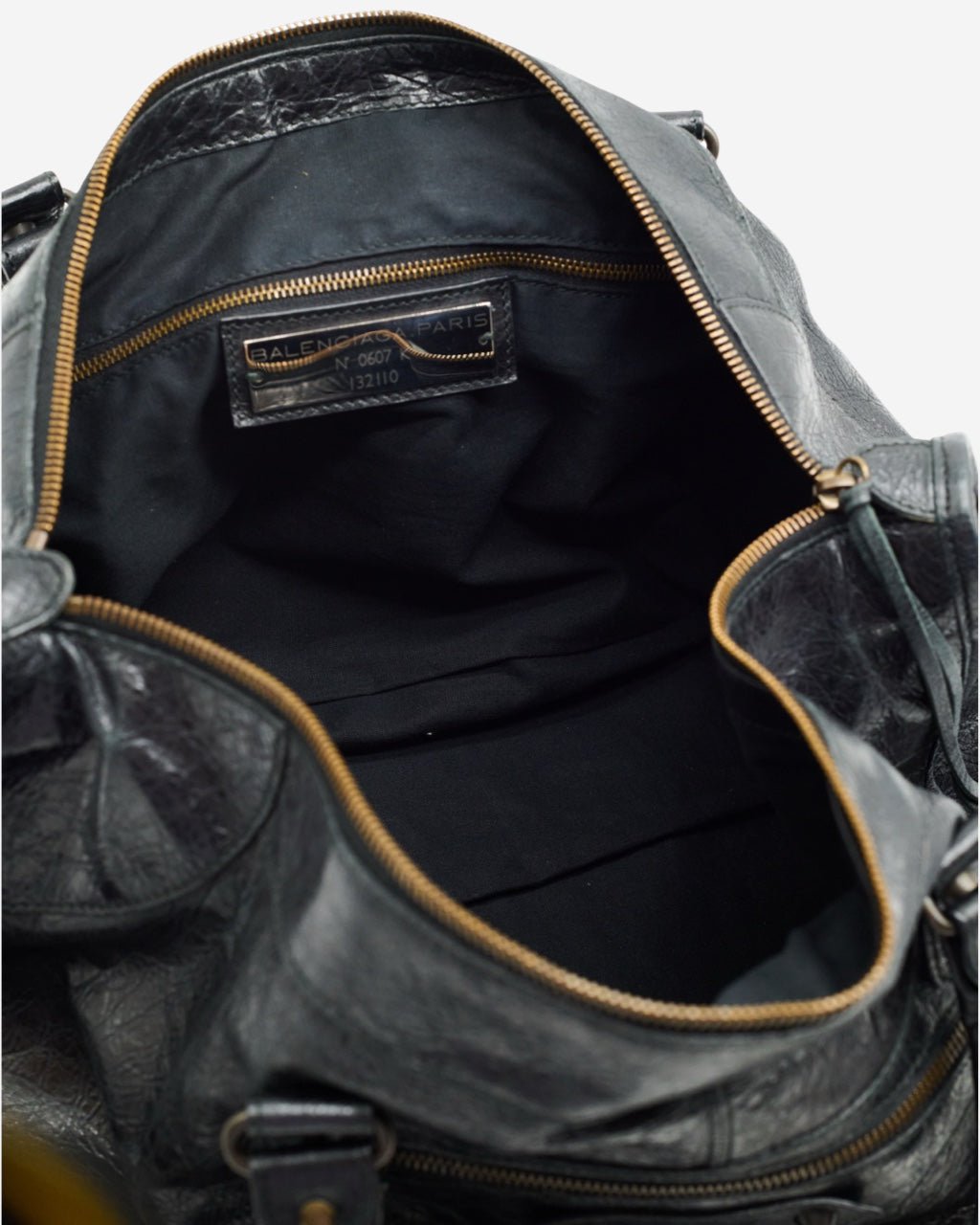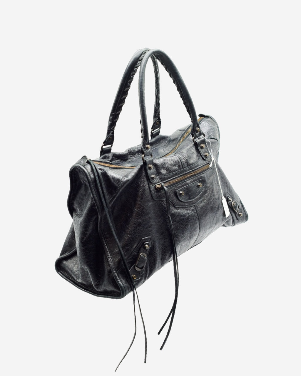 - Descripción: Bolsa de mano en piel color negro, zipper frontal, doble asa fija, cierre al tope, forro interior textil, hardware en tono dorado
