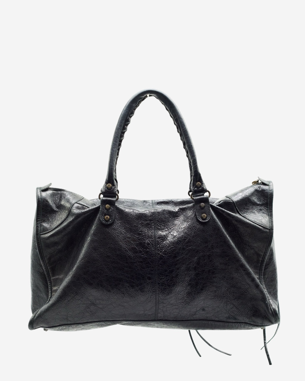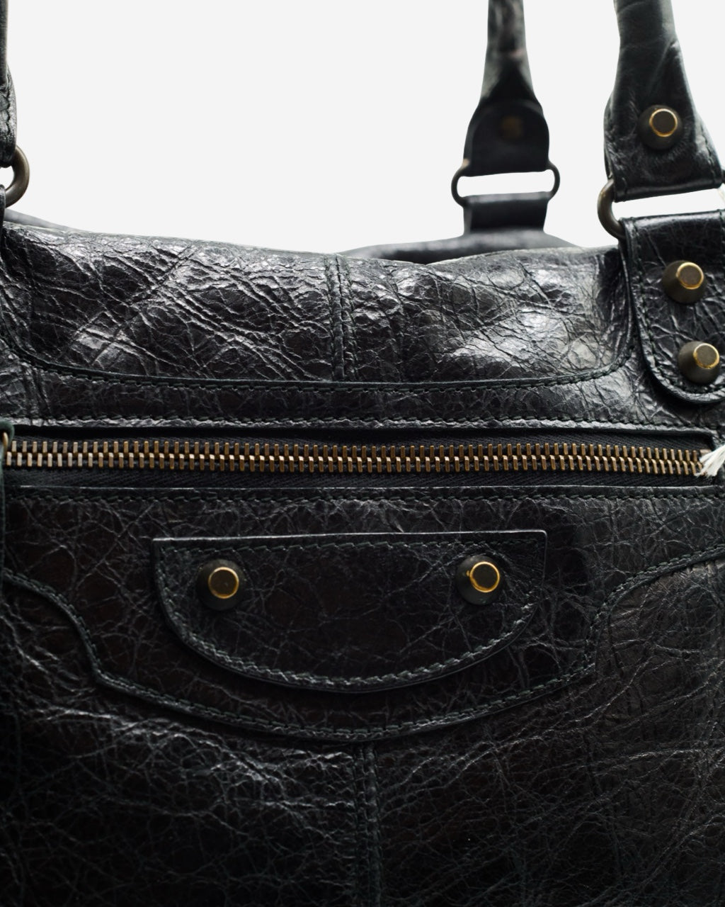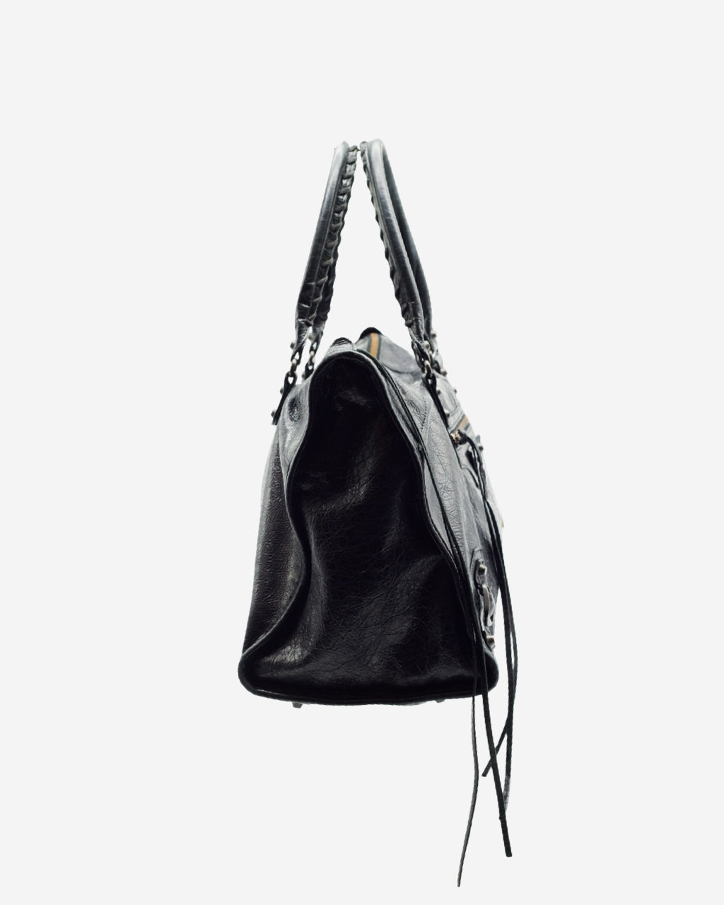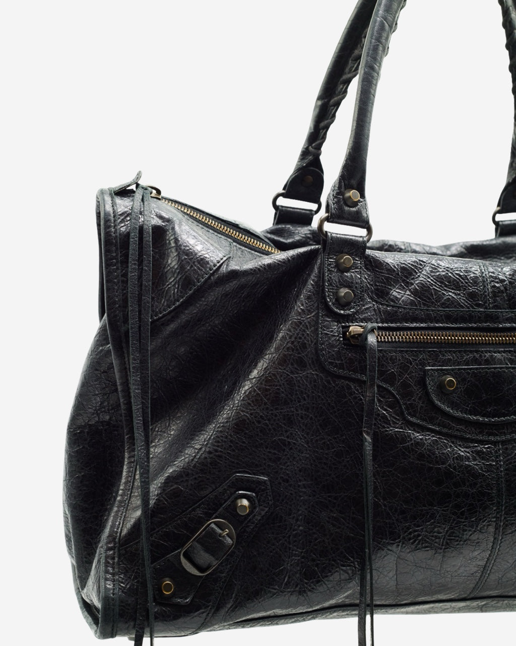 - Descripción: Bolsa de mano en piel color negro, zipper frontal, doble asa fija, cierre al tope, forro interior textil, hardware en tono dorado