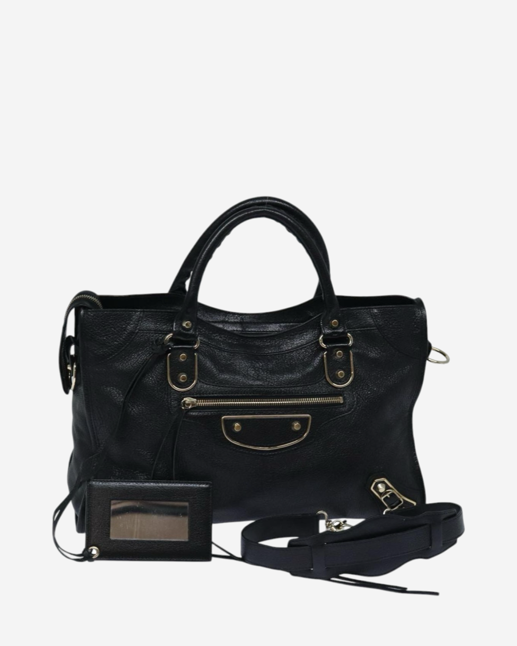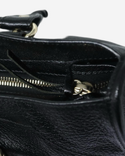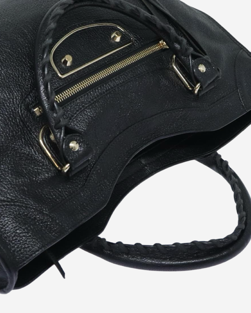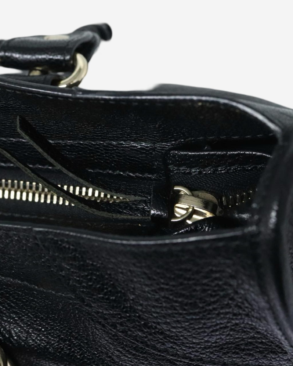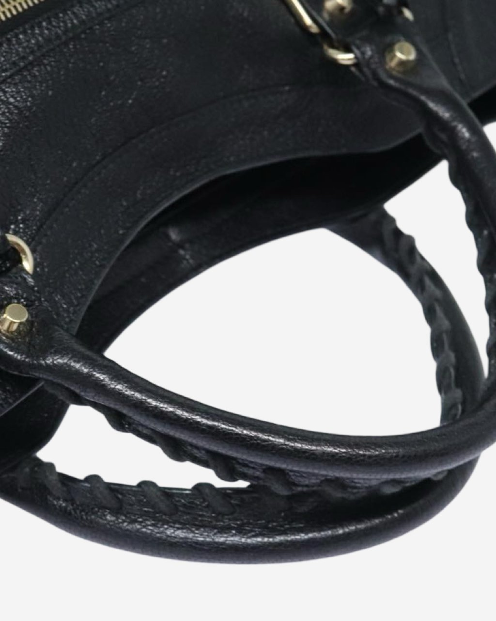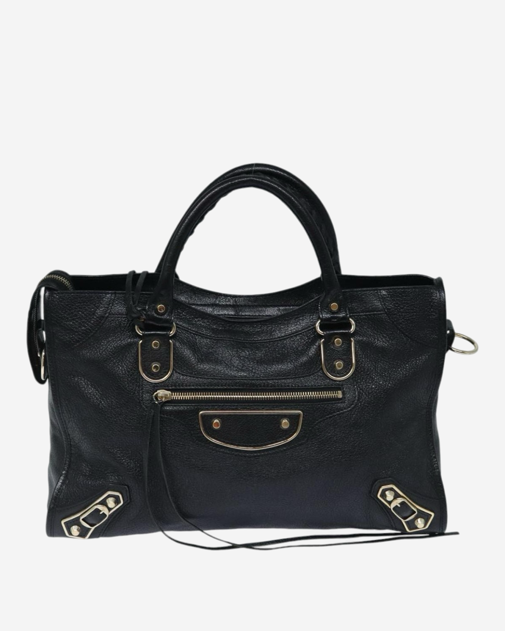 • Descripción: Bolsa de mano con doble asa fija, bolsillo frontal con cierre, cierre al tope, forro textil, hardware efecto envejecido