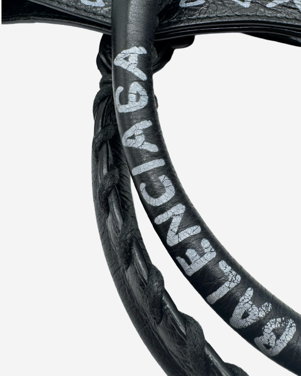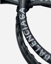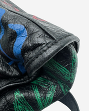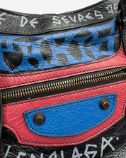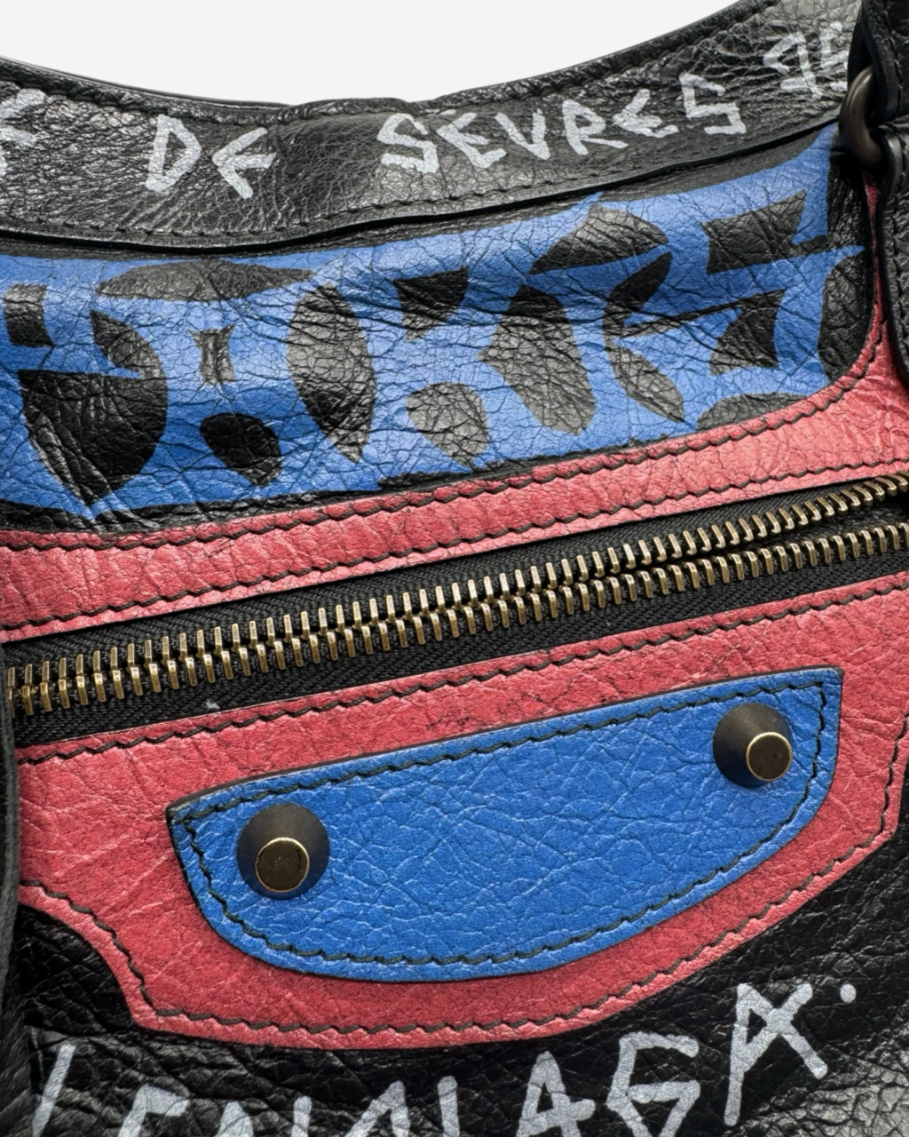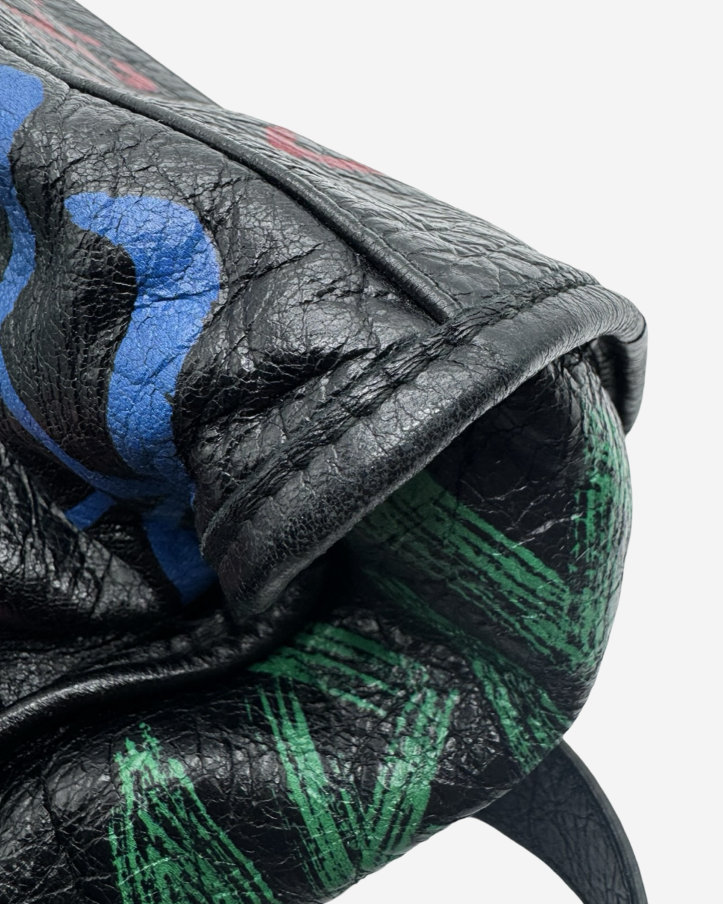• Descripción: Bolsa de mano en piel con doble asa fija, bolsillo frontal con cierre, cierre al tope, forro textil, hardware efecto envejecido, motivo de grafitti multicolor