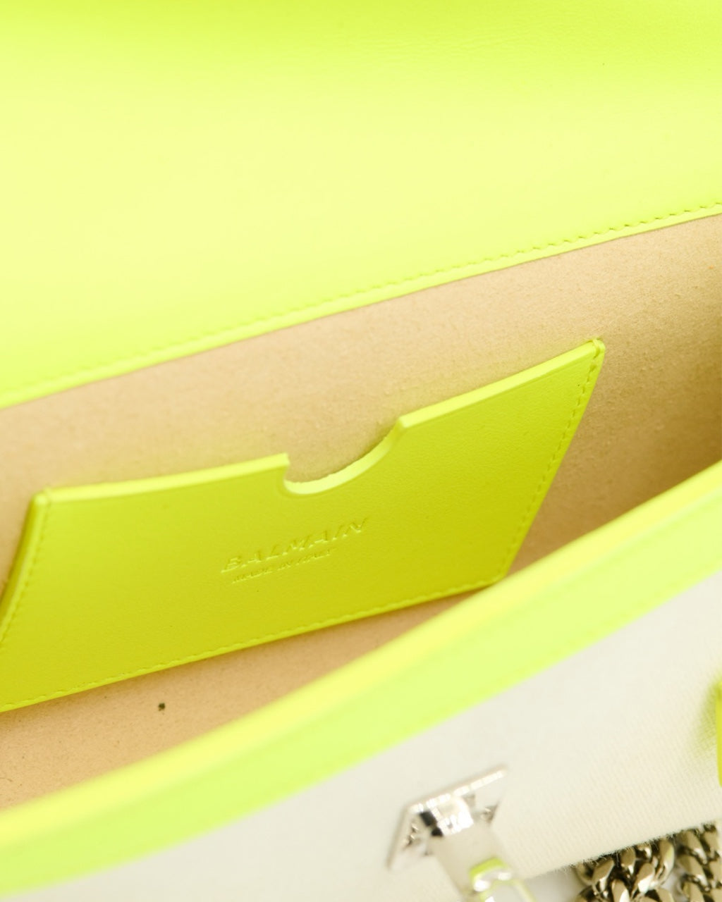 - Descripción: Bolsa de hombro en material textil en color beige, placa de logo frontal 'B' metálica, asa larga de cadena, abertura con solapa, forro interior en color beige con bolsillo, motivo de piel en color amarillo neón, hardware en tono plateado