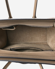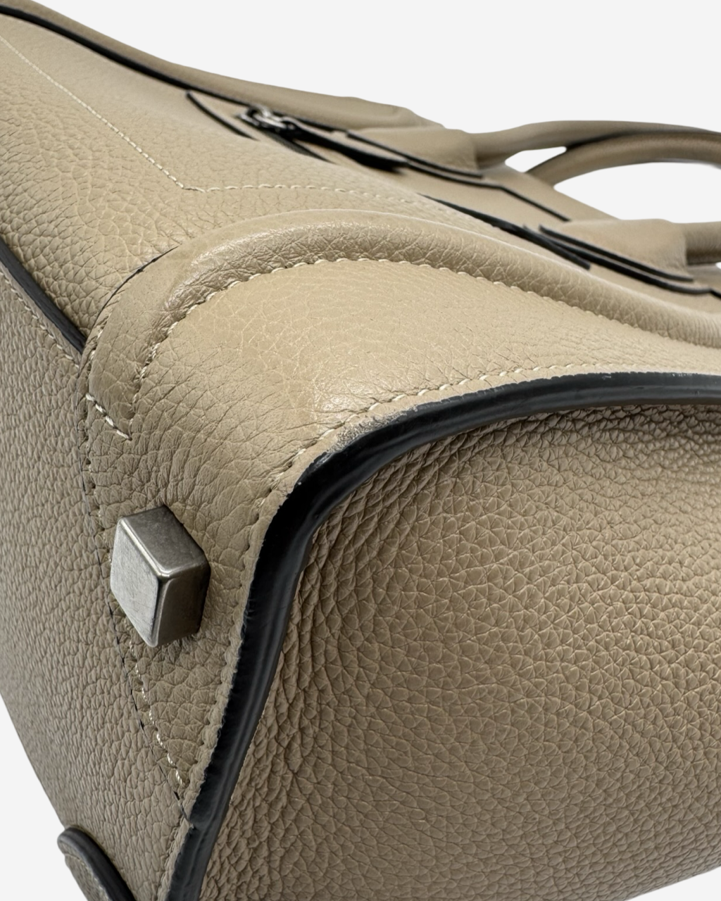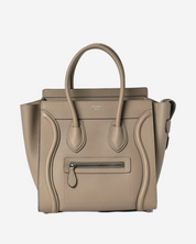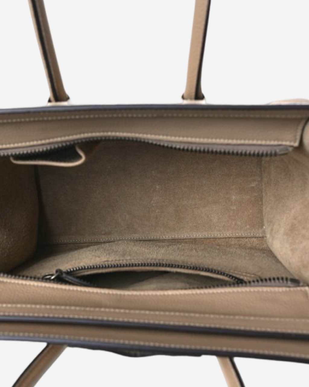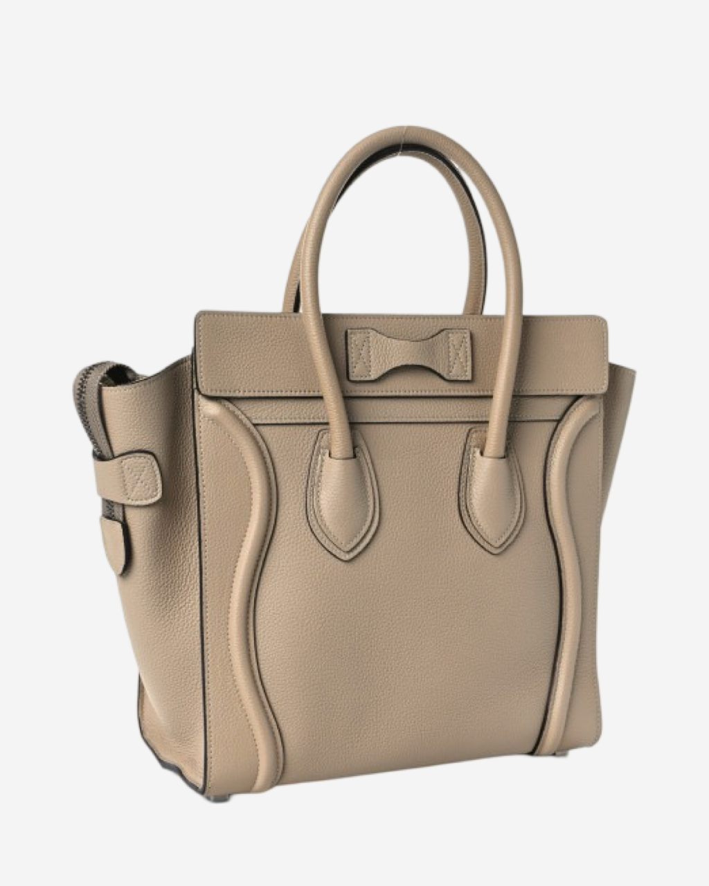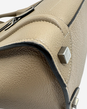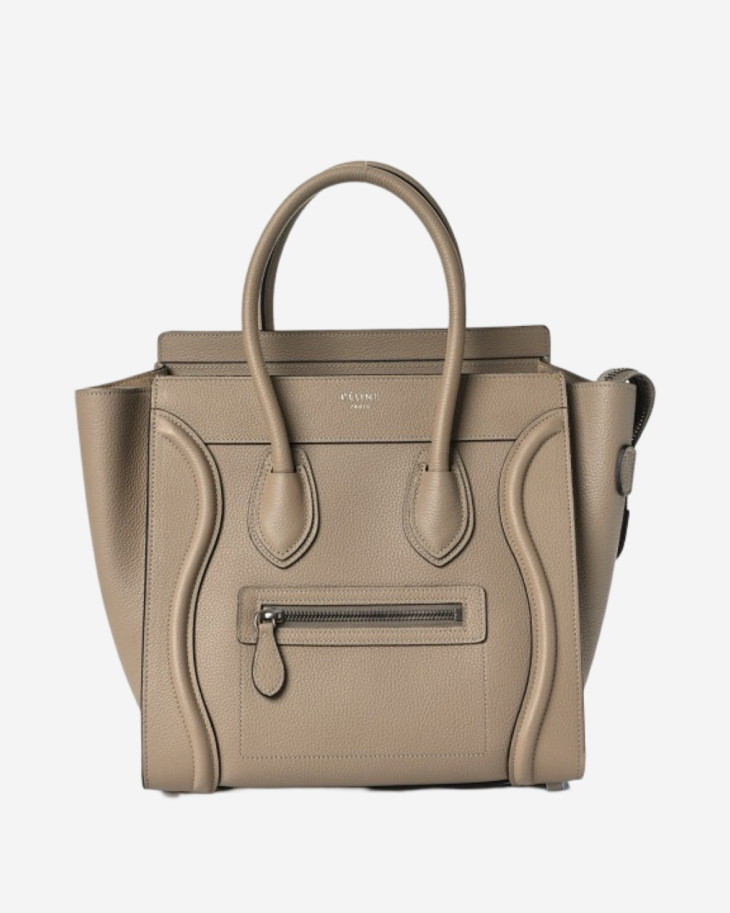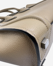 - Descripción: Bolsa de mano con dos asas superiores, cierre con broche, un bolsillo con cremallera exterior en la parte delantera y compartimiento principal, hardware dorado