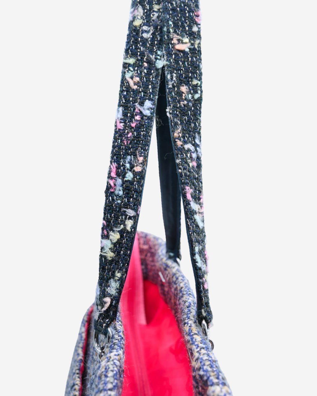- Descripción: Bolsa Tote Chanel Cambon en lana tweed color azul con logo CC característico en el lateral, doble asa fija, abertura principal con cierre de doble sentido, forro interior en textil color rosa neón con bolsillos, hardware color plateado