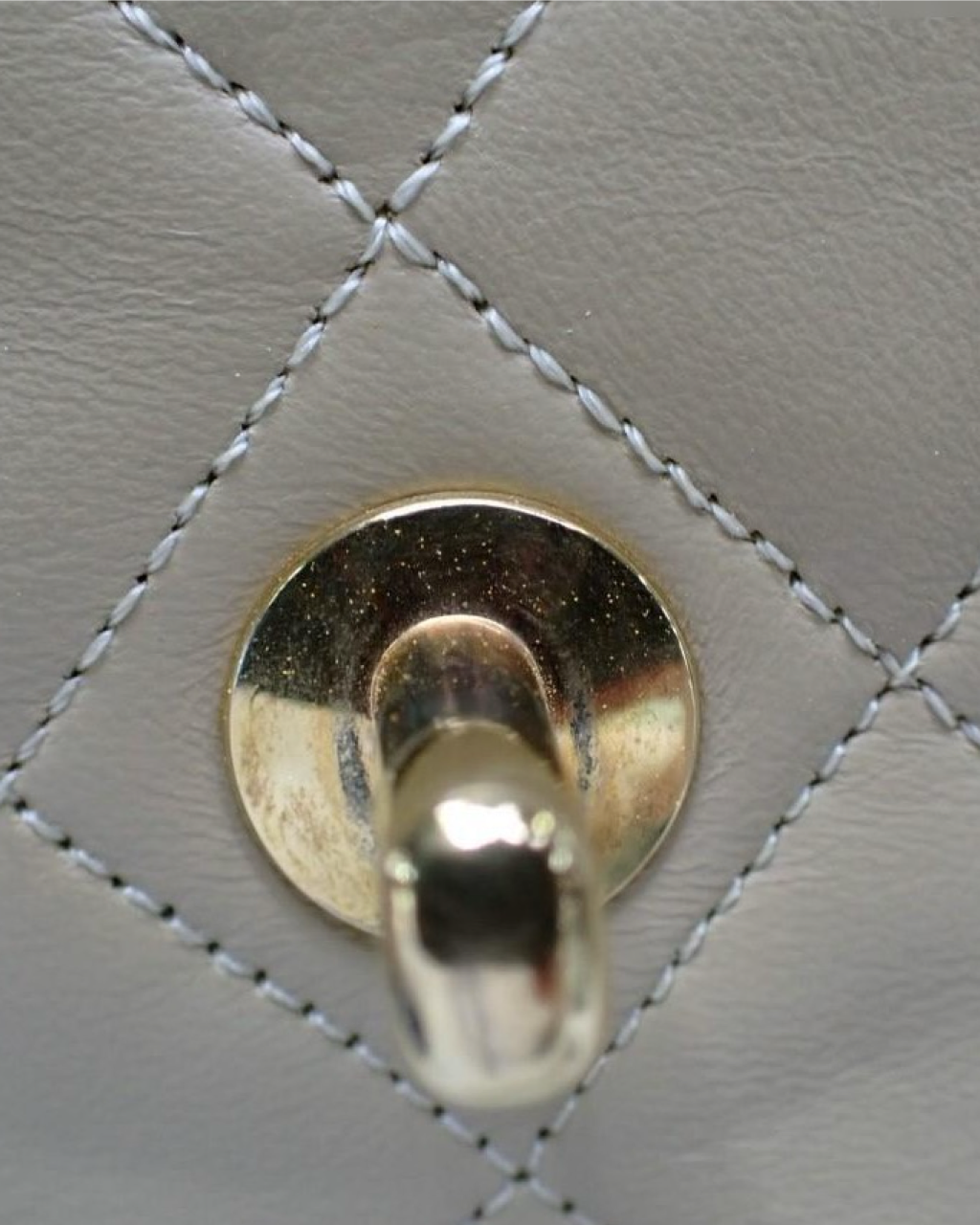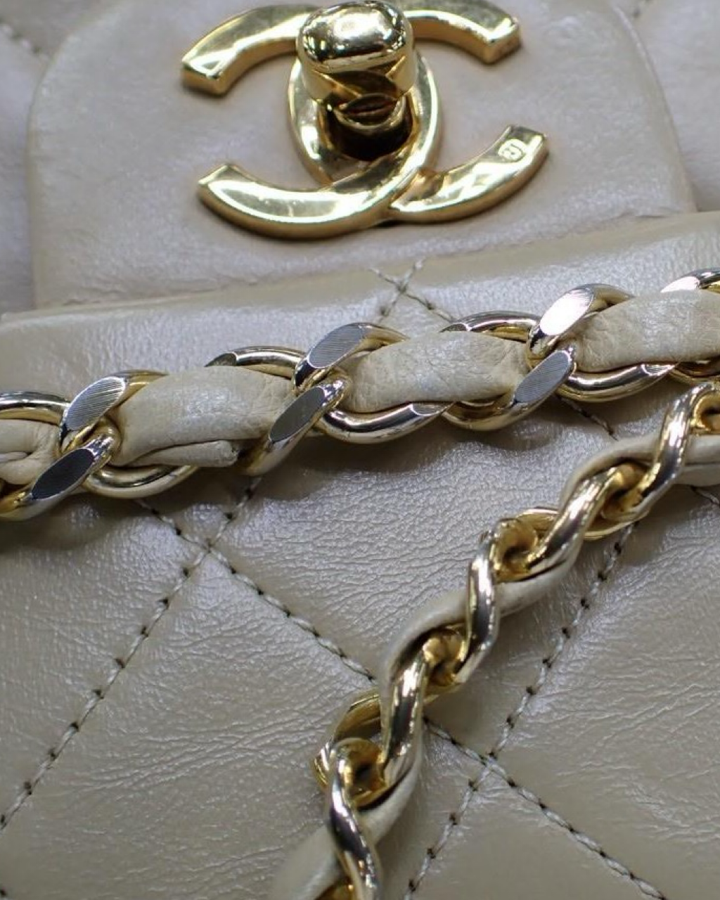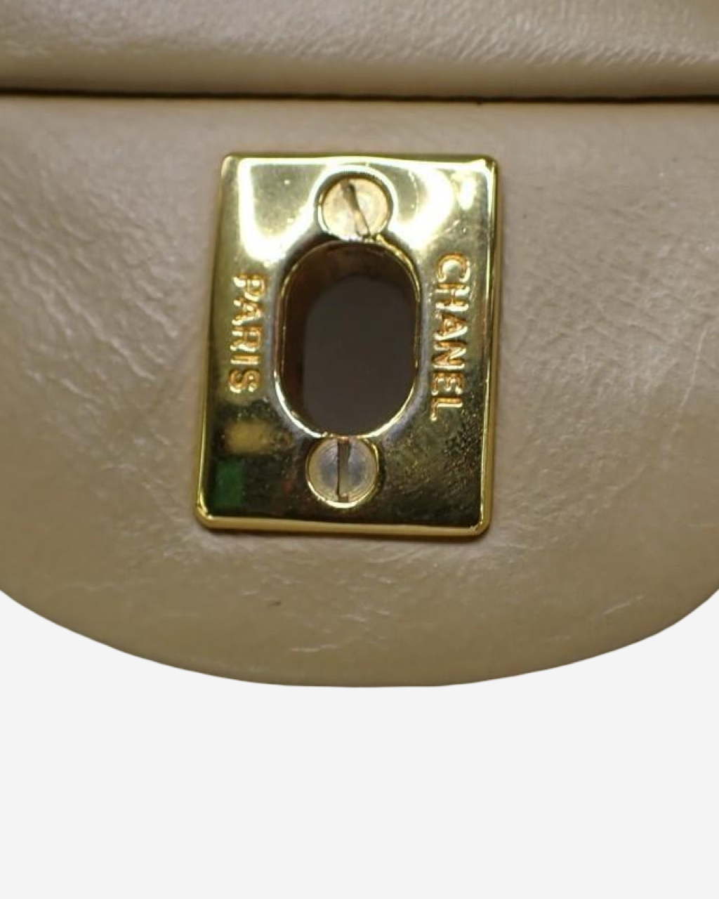 - Descripción: Bolsa de hombro en piel color beige, broche CC turnlock característico con baño de oro de 24k, abertura principal con solapa, asa movible de cadena, forro interior en piel, hardware en tono dorado