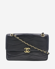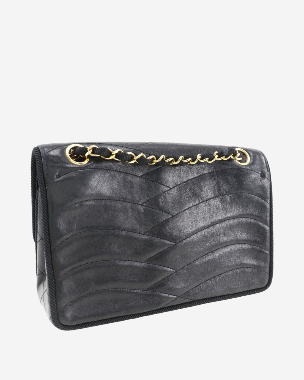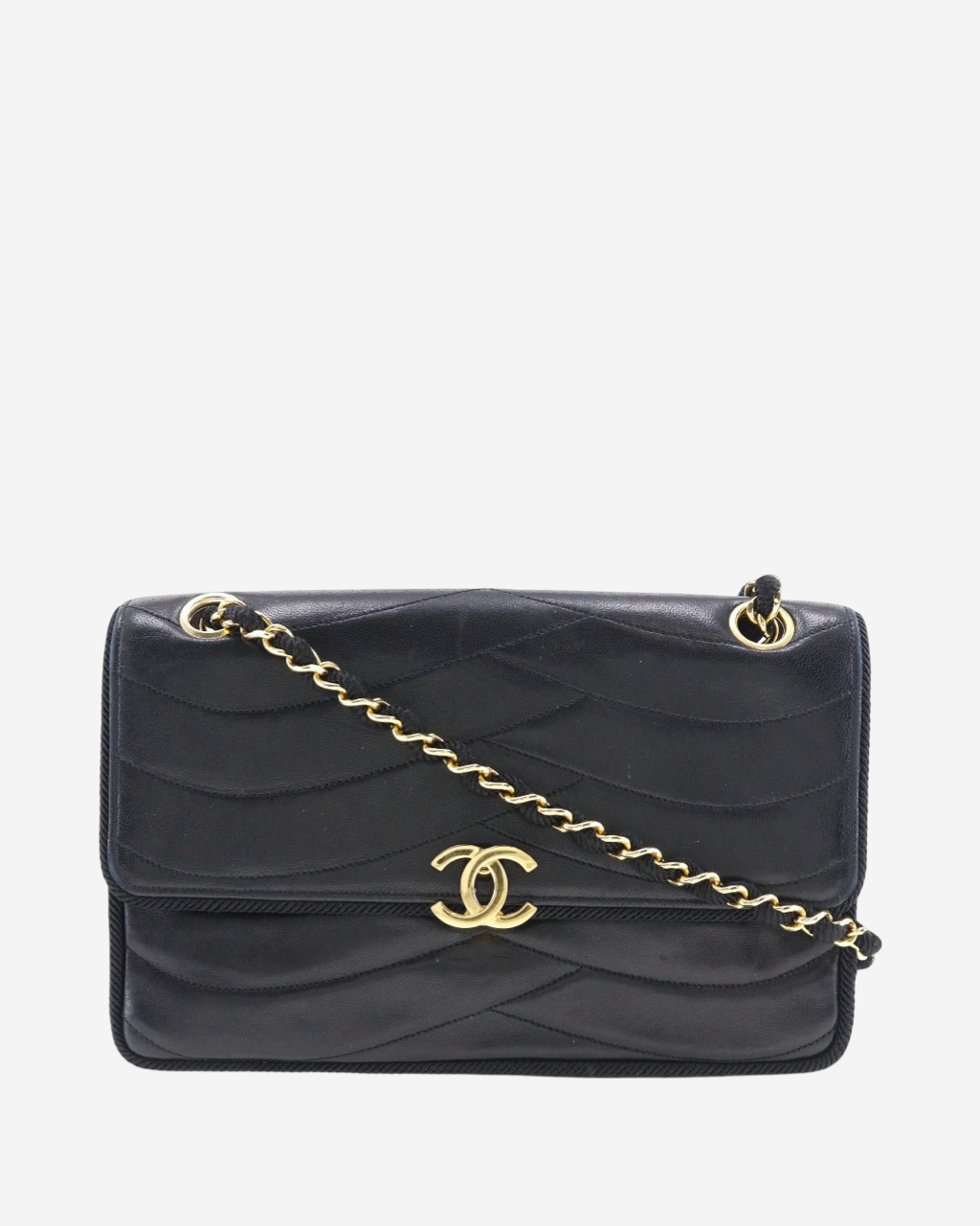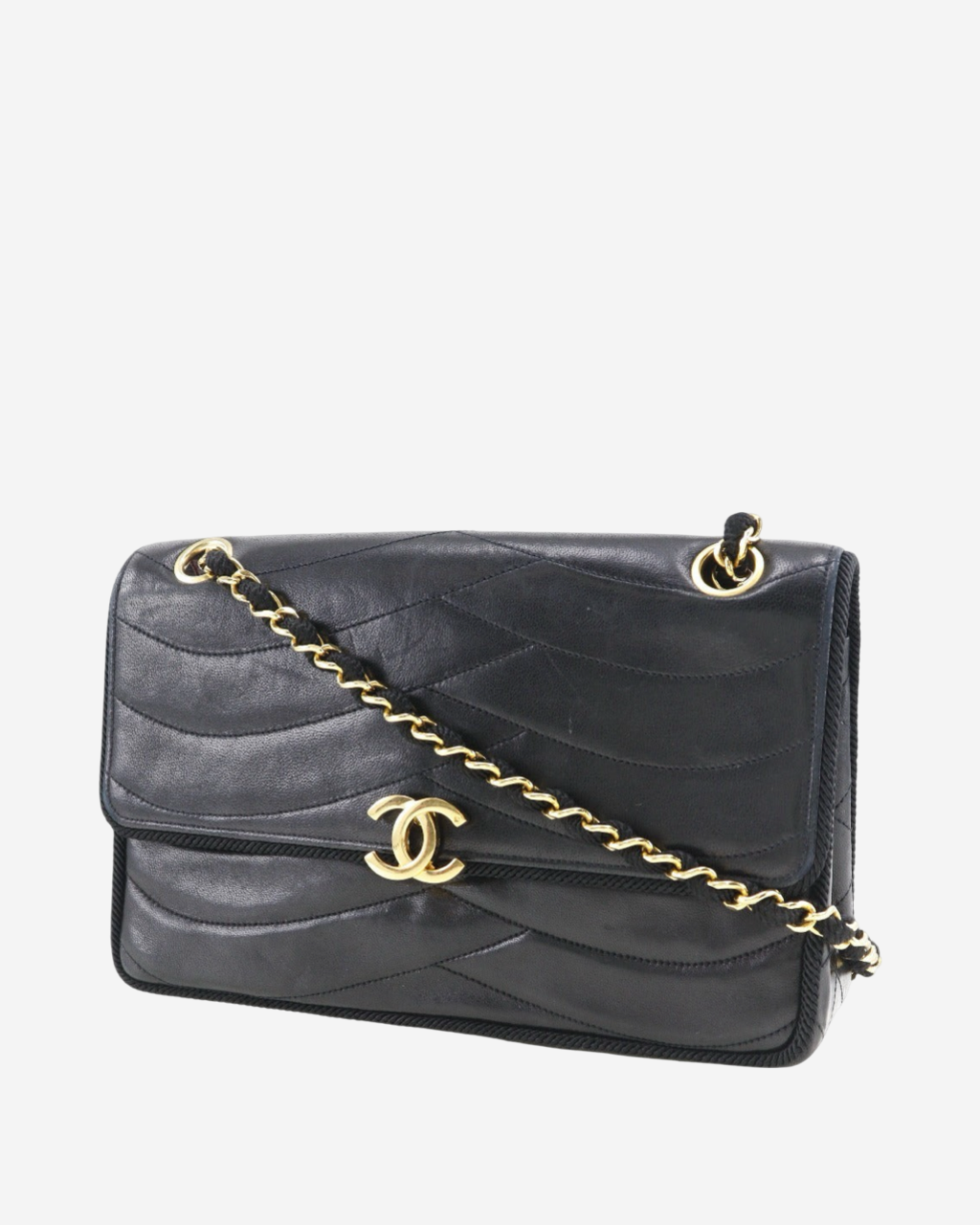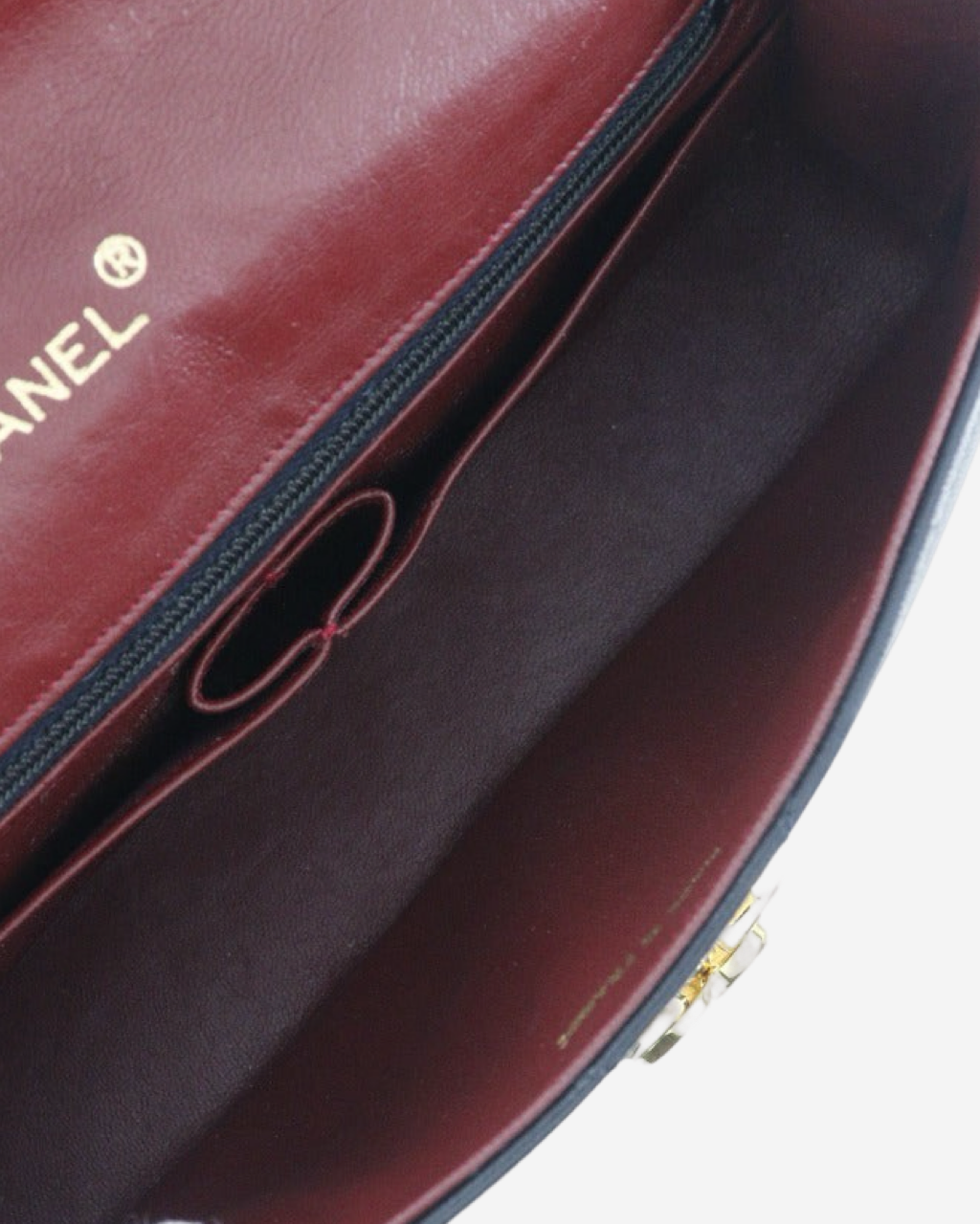 - Descripción: Bolsa de hombro en color negro, broche CC frontal, cierre, interior en color negro, strap , broche de baño oro 24k, hardware color dorado