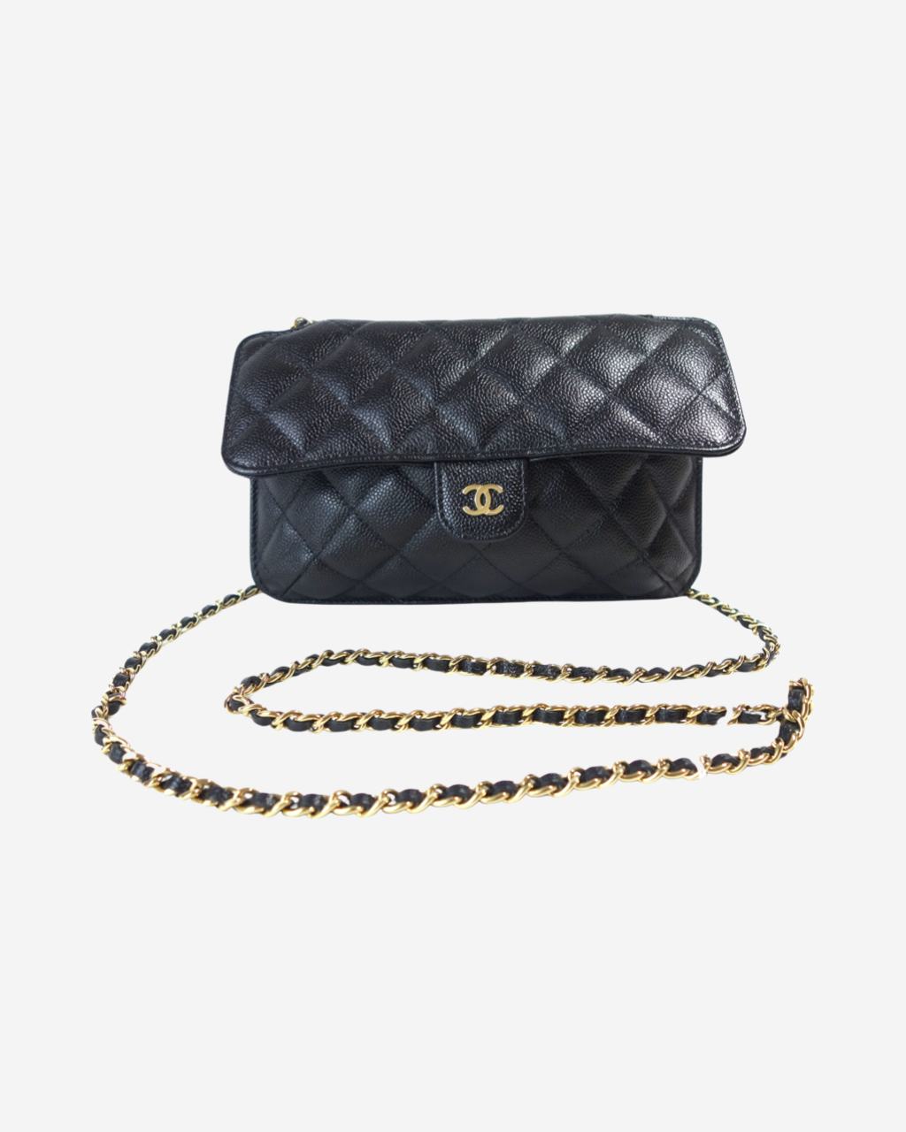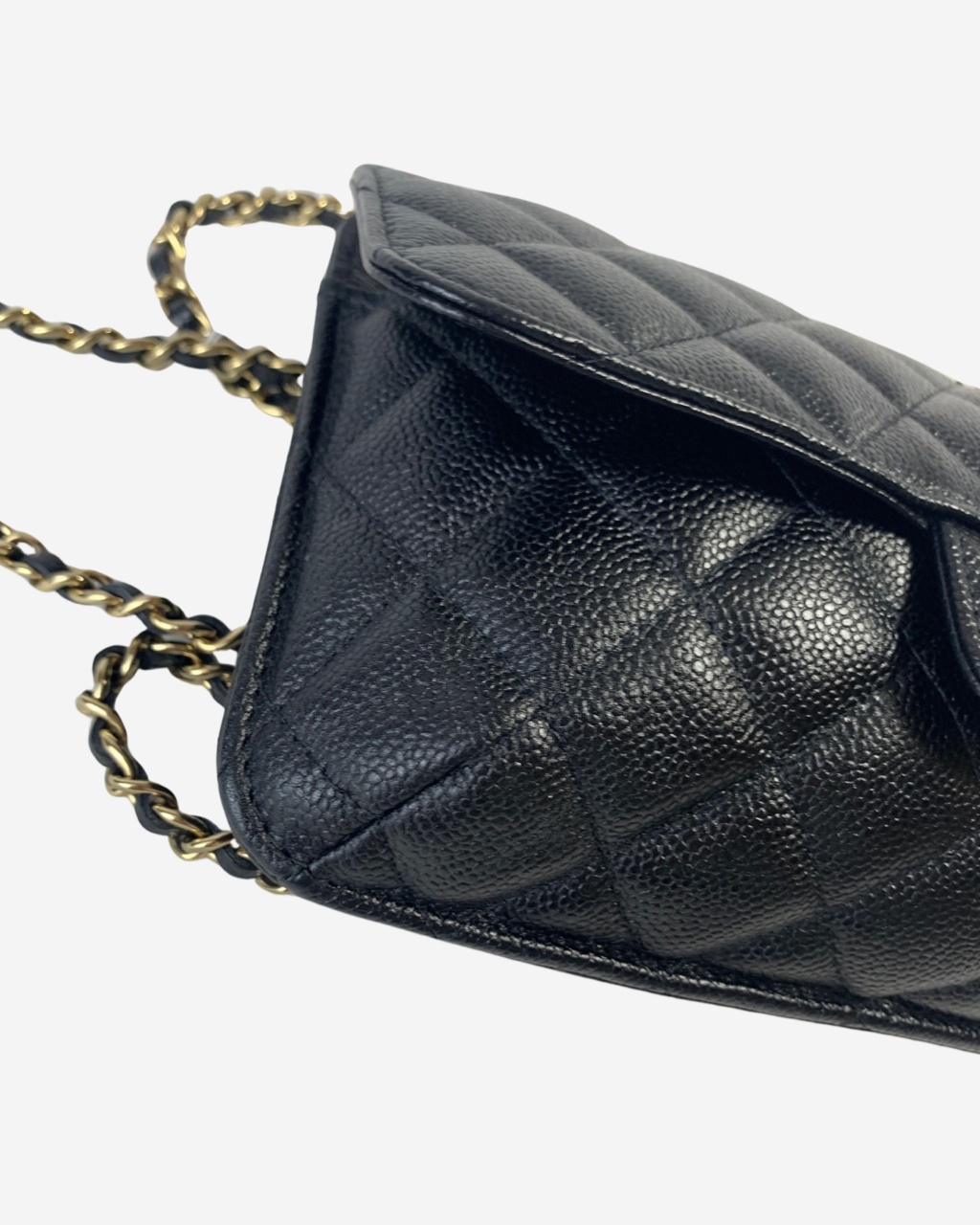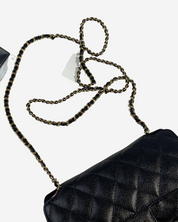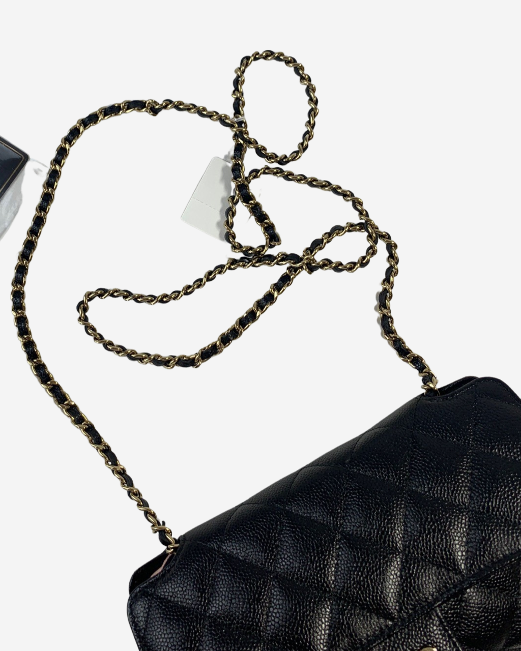 • Descripción: Bolsa en piel Caviar con logo CC entrelazado característico, parte superior plegable, cierre giratorio característico de CC entrelazadas, correa de cadena para el hombro y bolsillo en la parte posterior con hardware dorado.
