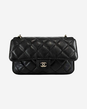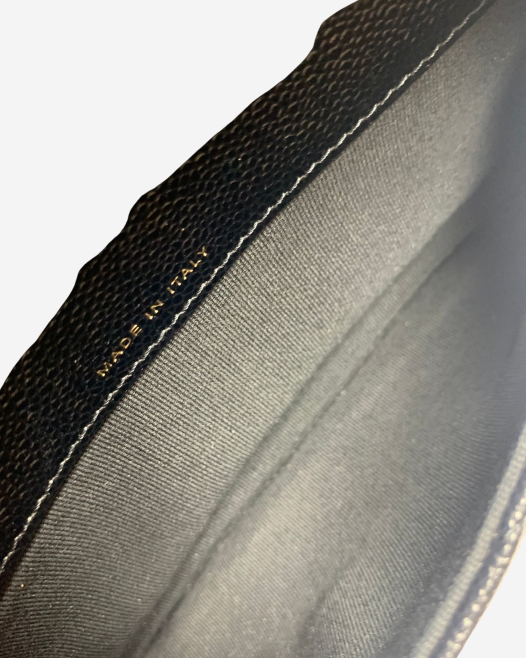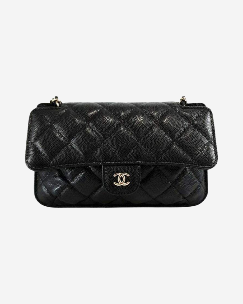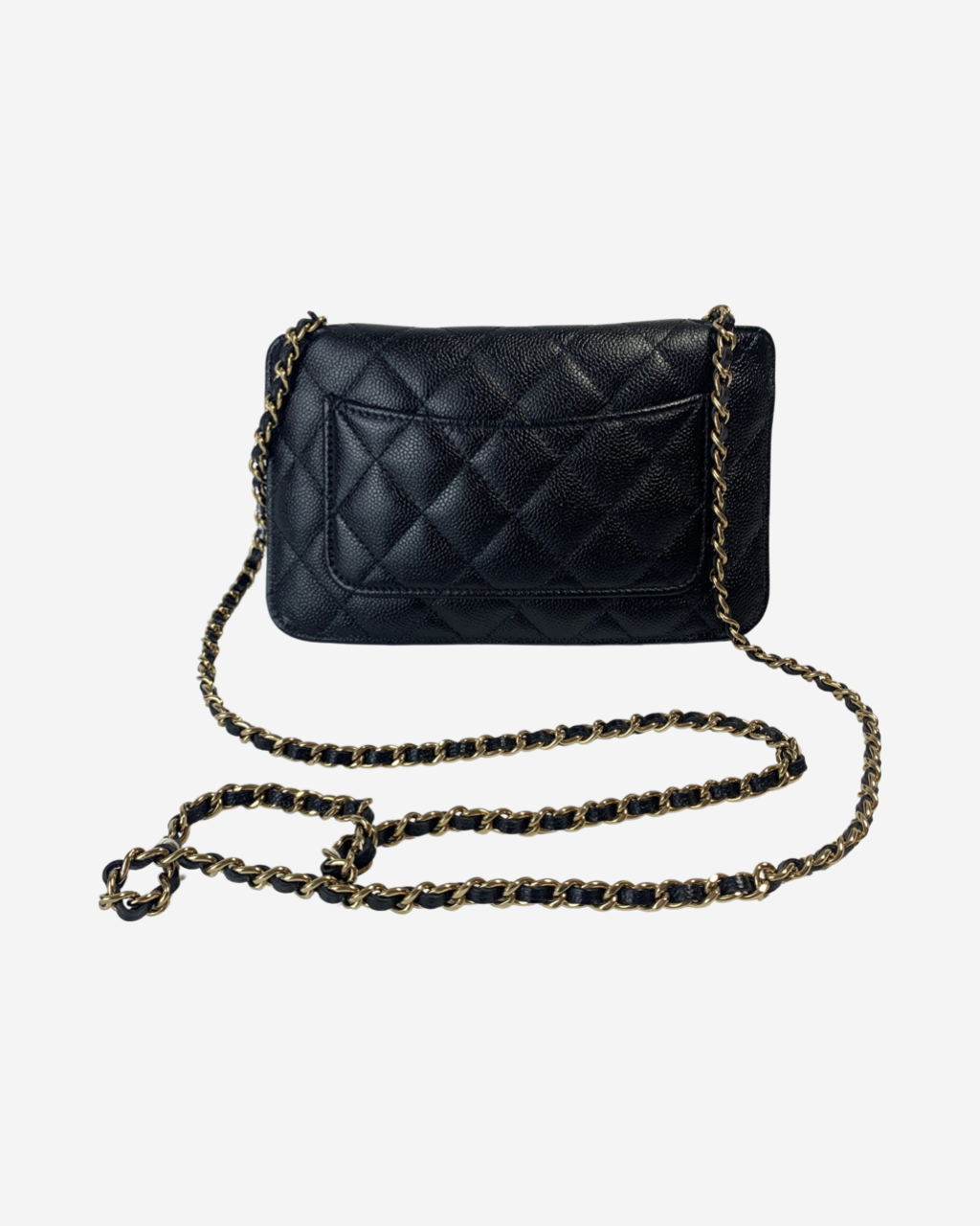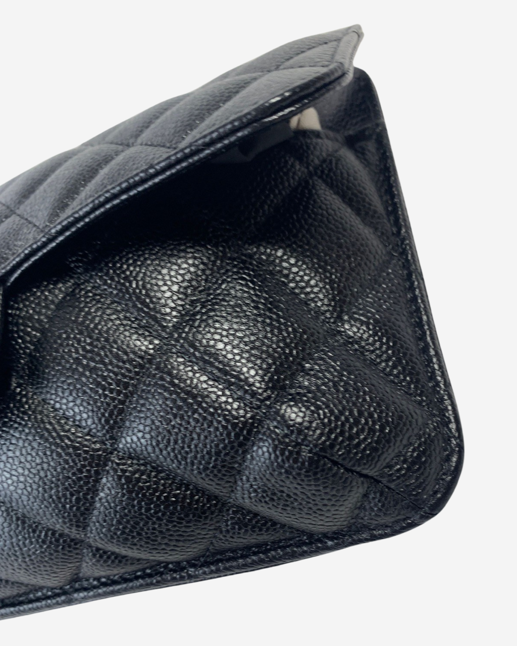 • Descripción: Bolsa en piel Caviar con logo CC entrelazado característico, parte superior plegable, cierre giratorio característico de CC entrelazadas, correa de cadena para el hombro y bolsillo en la parte posterior con hardware dorado.