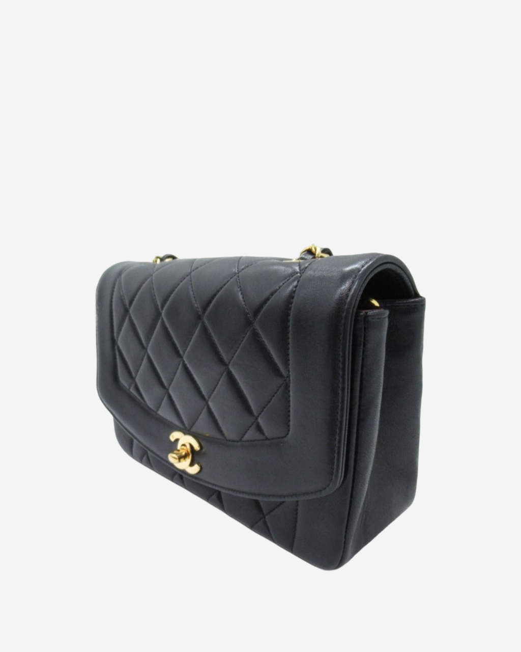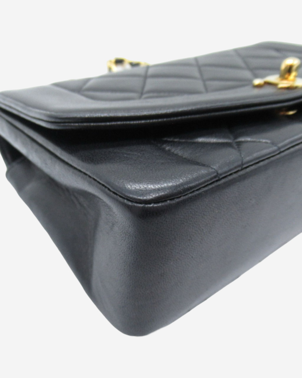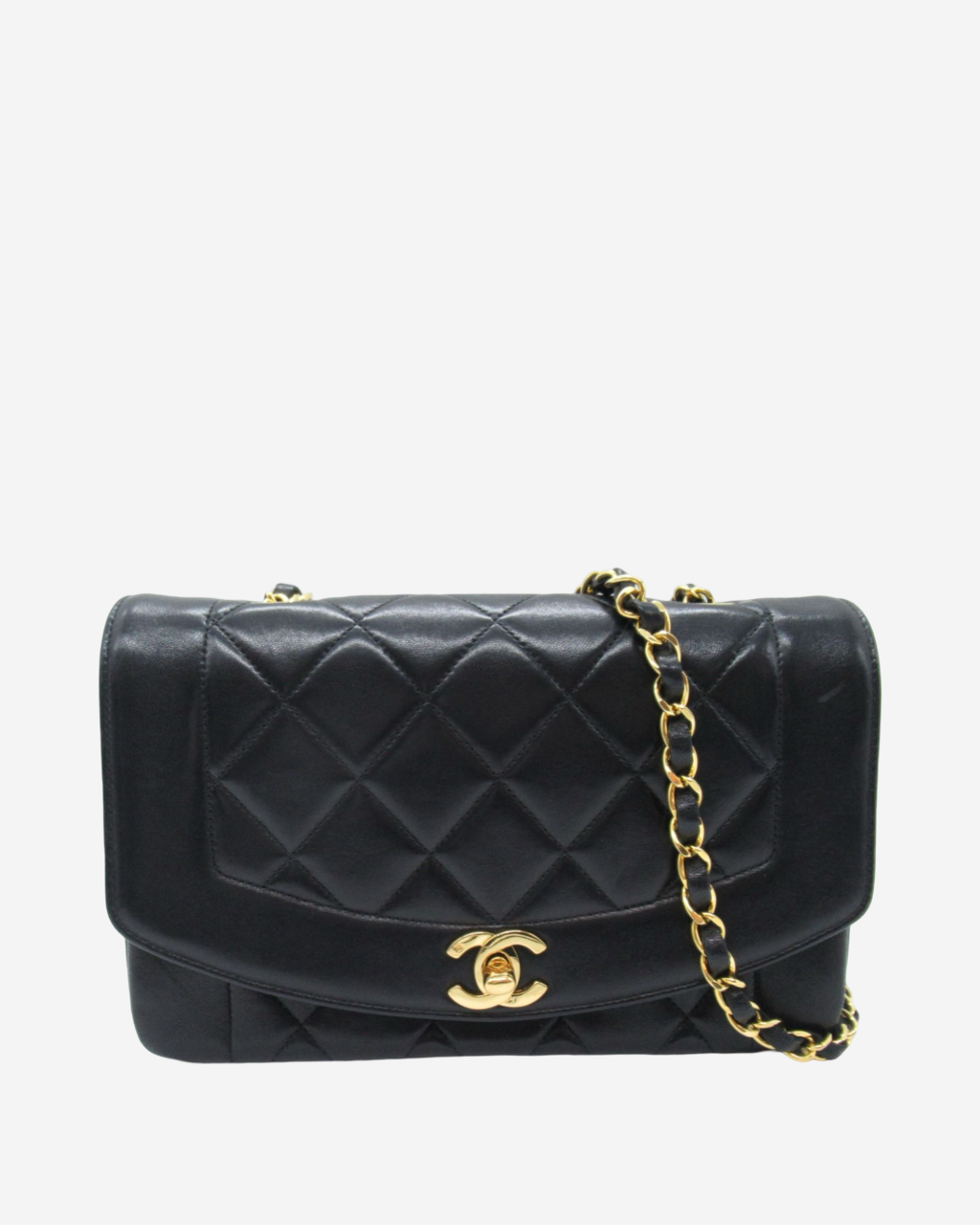 - Descripción: Bolsa de hombro diana en color negro, cierre CC turnlock, interior en color vino, strap oro 24k matelassé, hardware color dorado