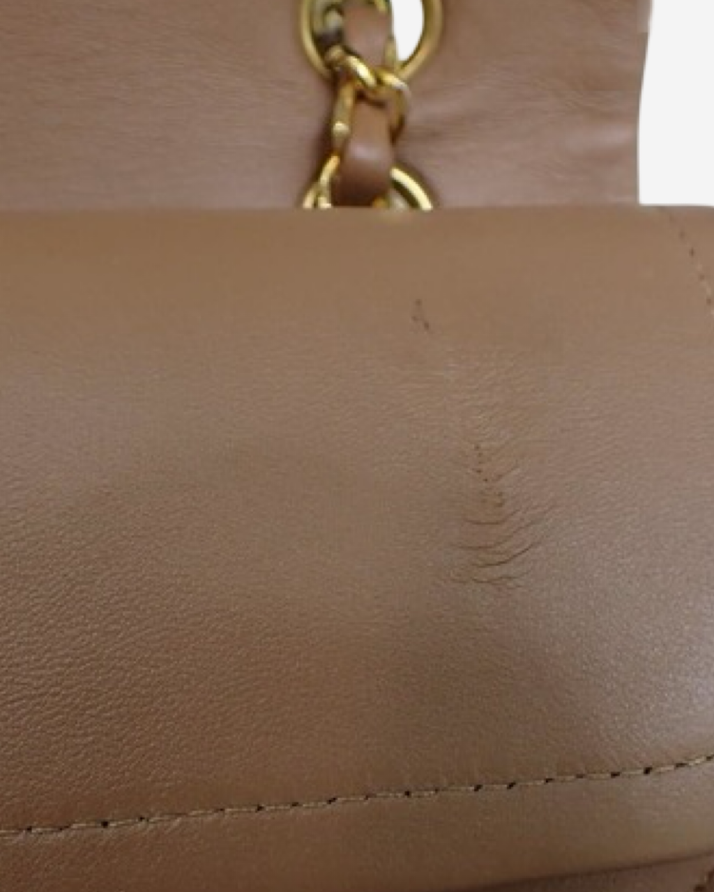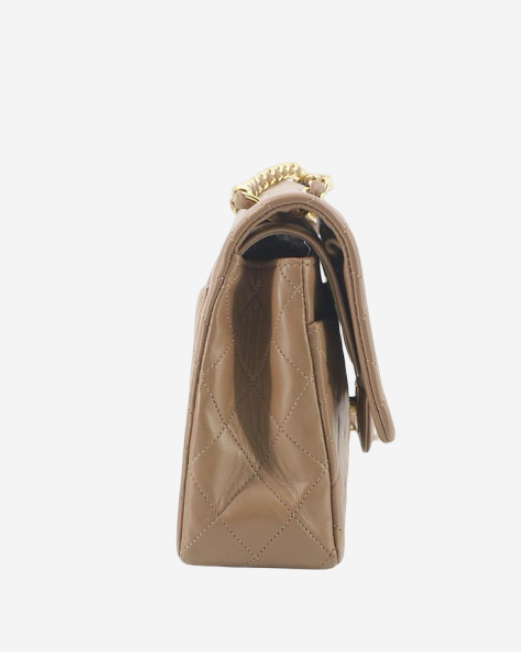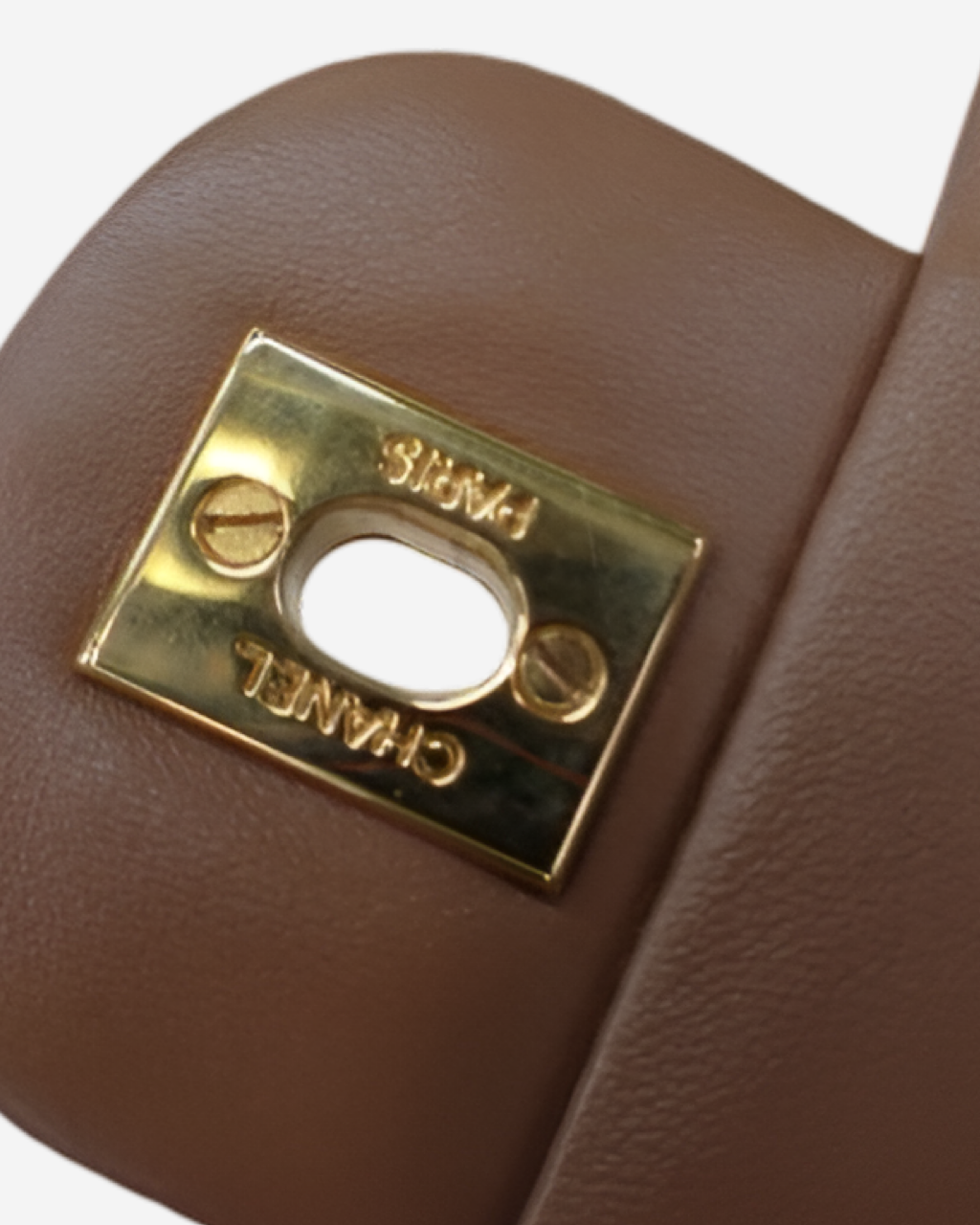 - Descripción: Bolsa de hombro en color café, broche CC en baño de oro de 24k, interior en color café, hardware color dorado