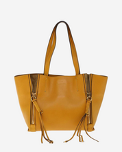 • Descripción: Tote Bag piel color amarillo, doble asa fija, logo grabado frontal, dos zipper frontales con tassel, hardware color dorado