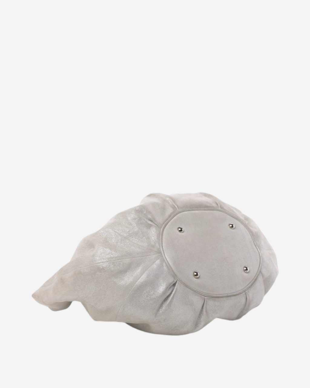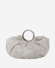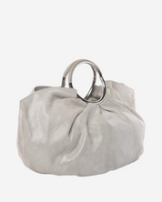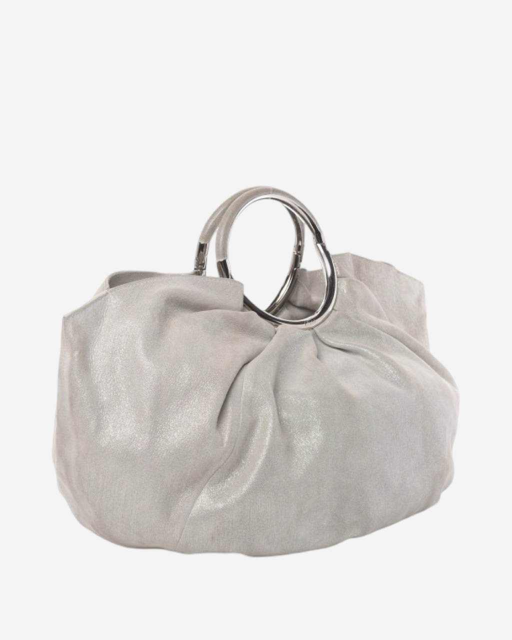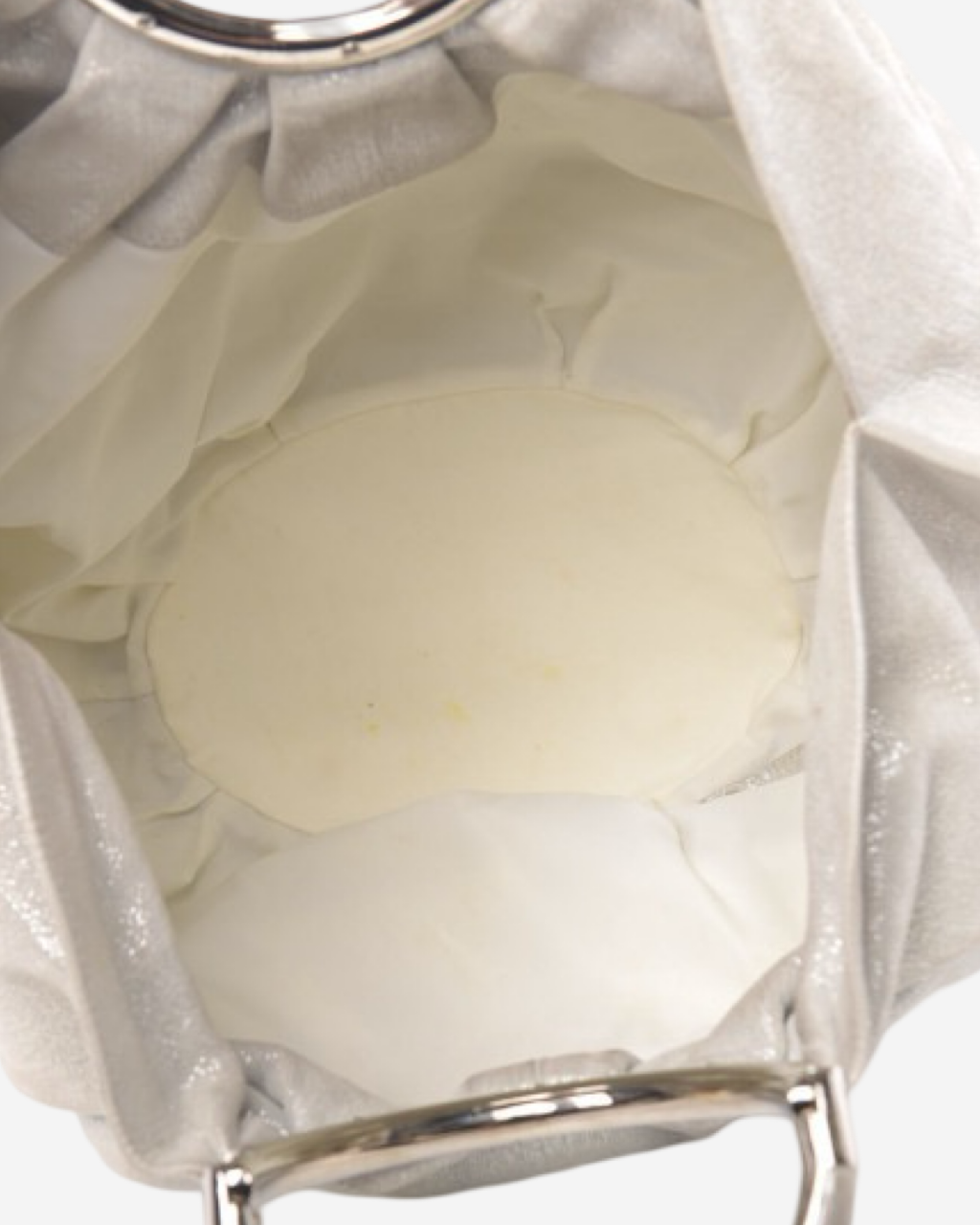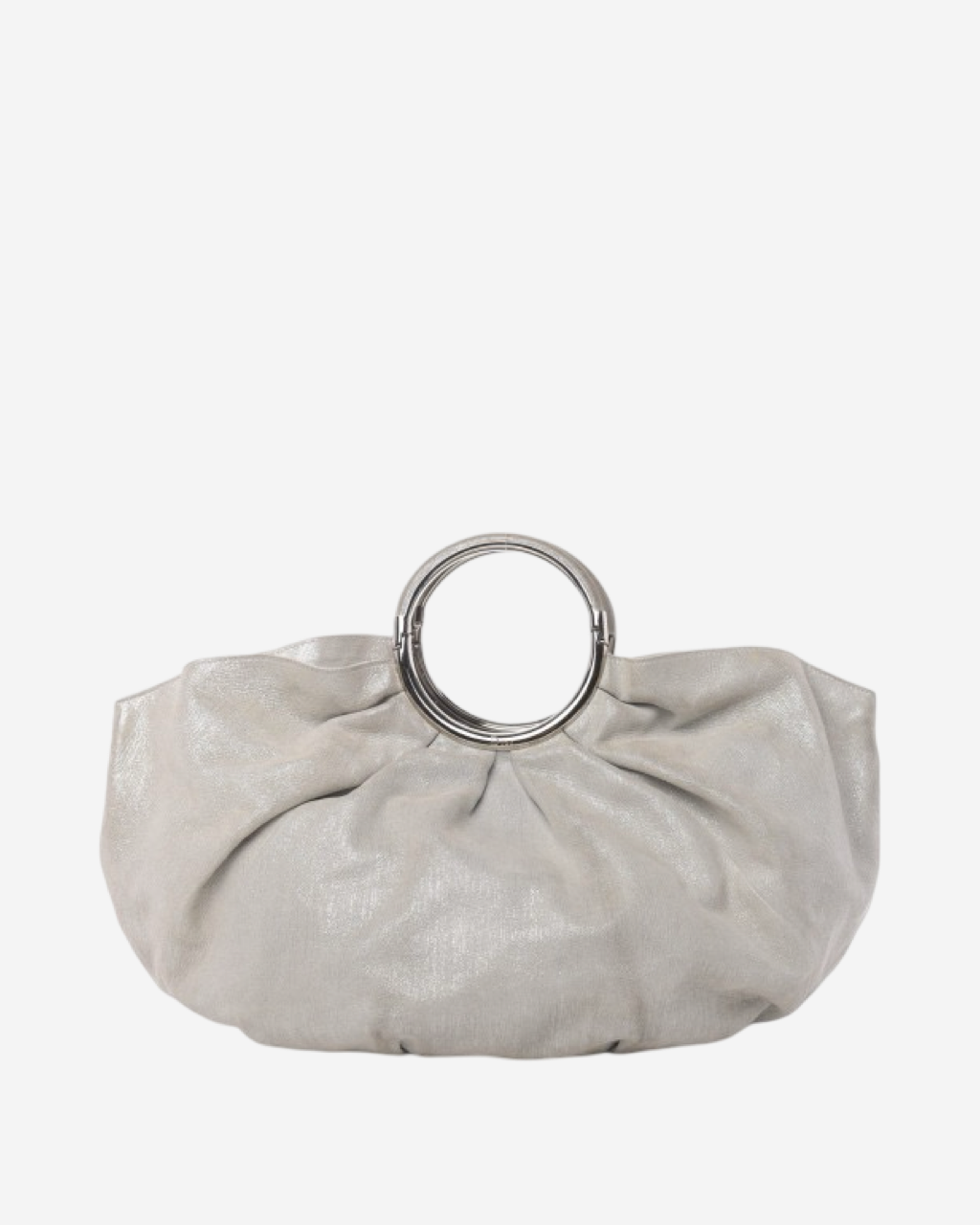 - Descripción: Bolsa de mano con dos asas superiores en metal circulares, abertura principal abierta, pouch extra, hardware color plateado