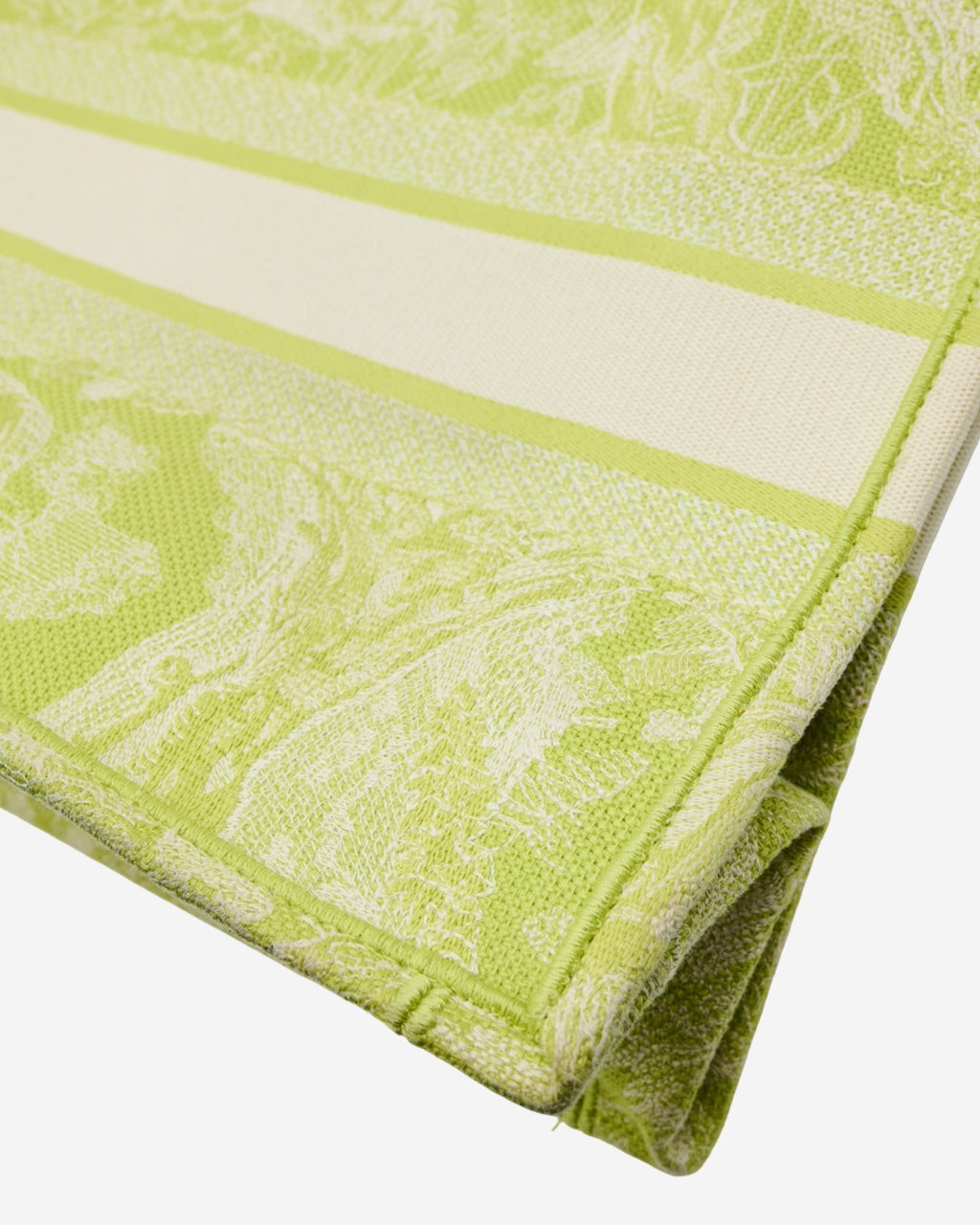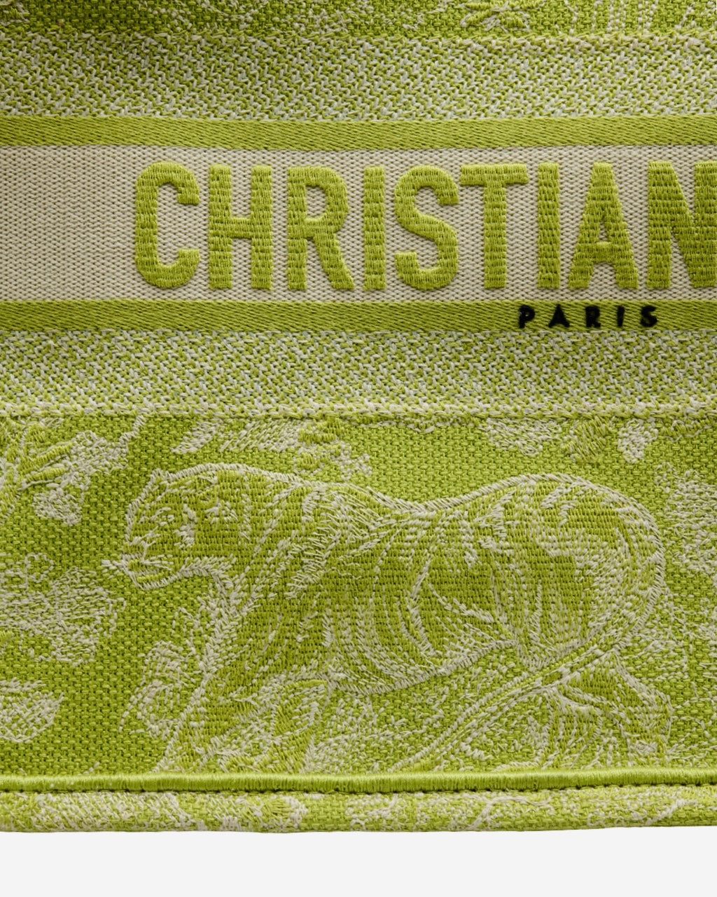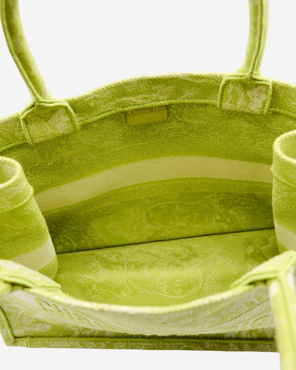 - Descripción: Bolsa tipo tote Dior en canvas floral color verde, logo bordado frontal, doble asa fija, abertura principal abierta