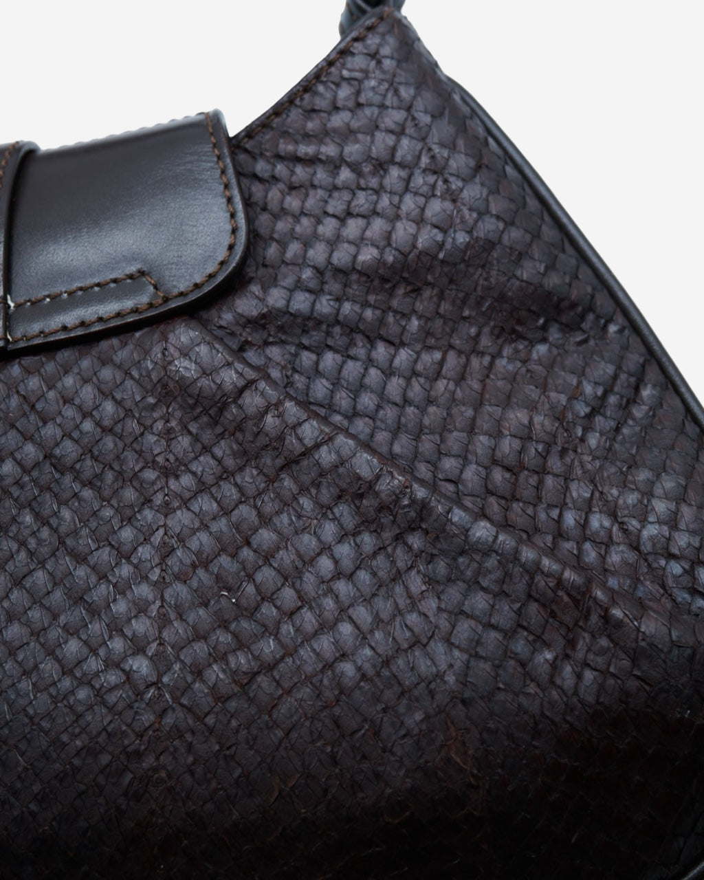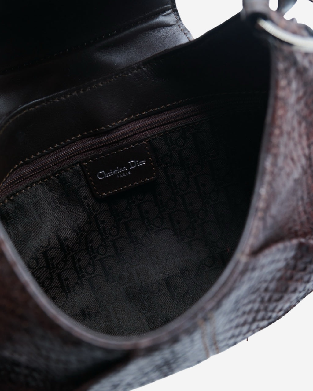 - Descripción: Bolsa de hombro Dior en piel de serpiente color café, asa fija al tope, abertura principal con broche metálico, placa de logo frontal, forro interior textil con bolsillo y cierre de doble sentido, hardware en tono plateado