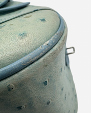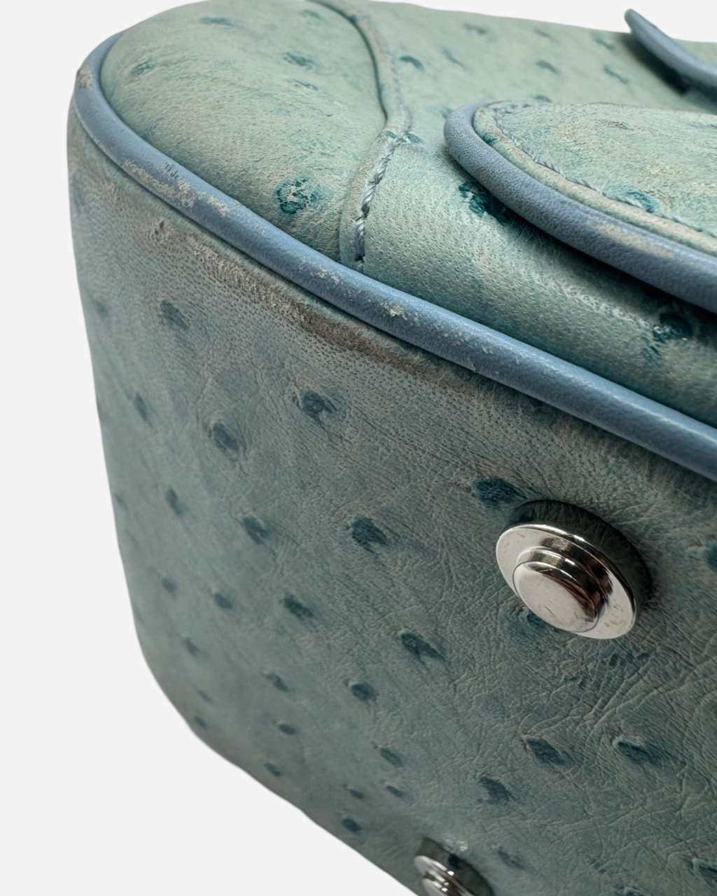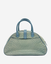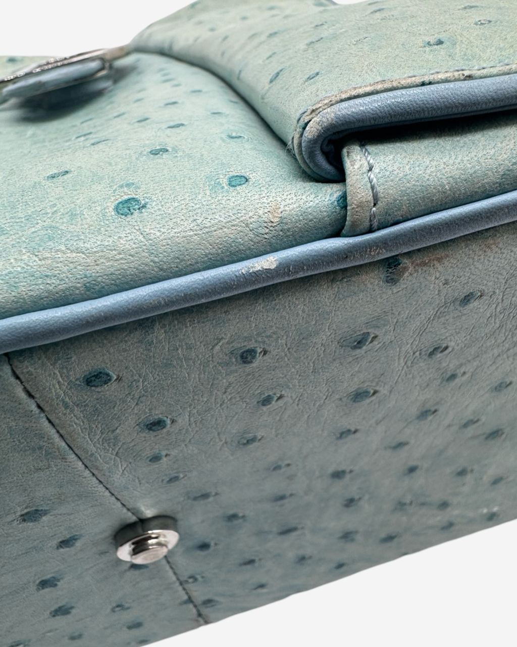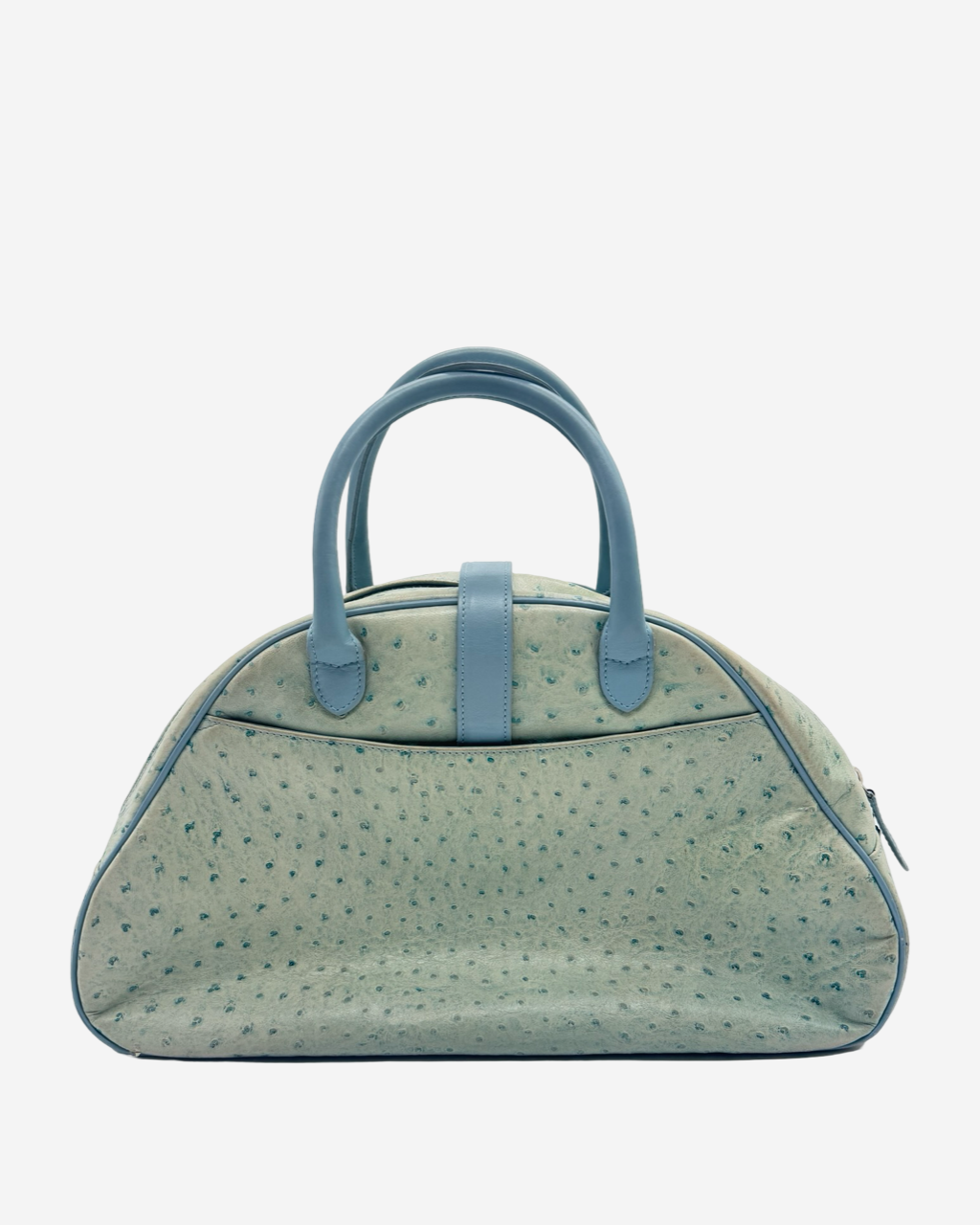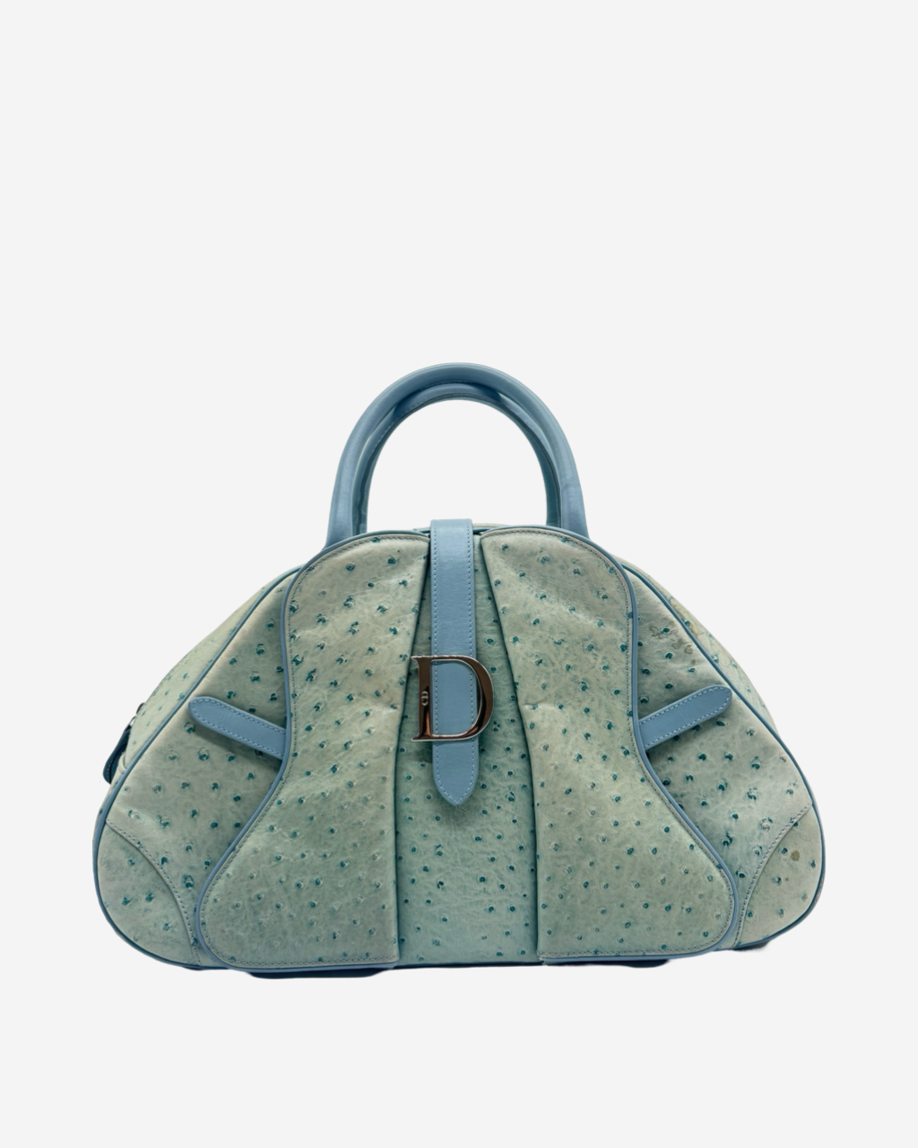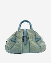 • Descripción: Bolsa de mano en piel efecto avestruz color azul/verde, cierre al tope, doble asa fija, dije "D" característico, hardware color plateado