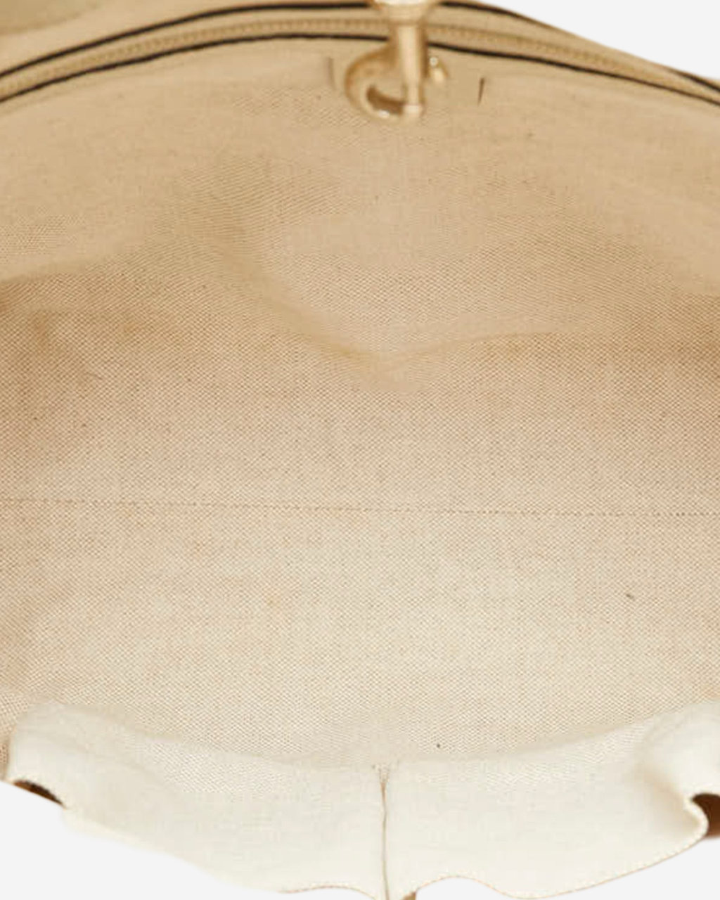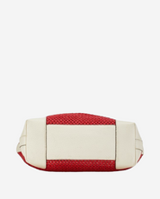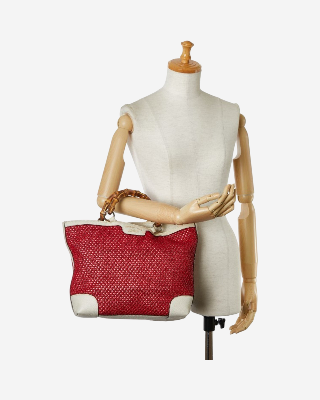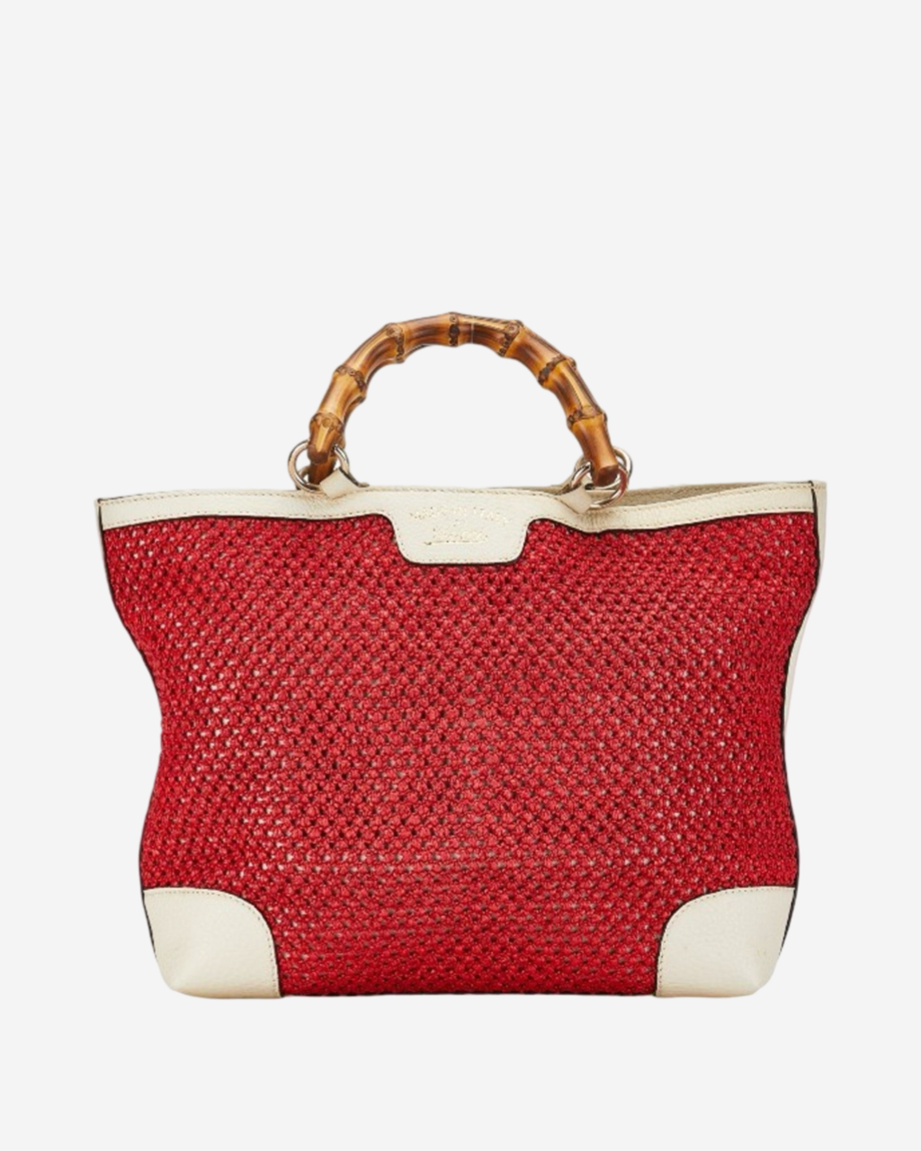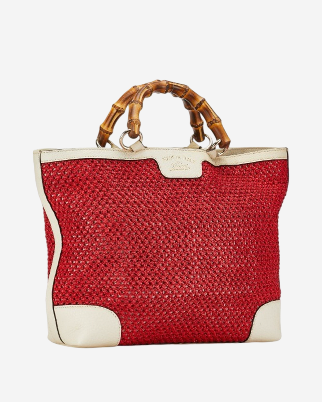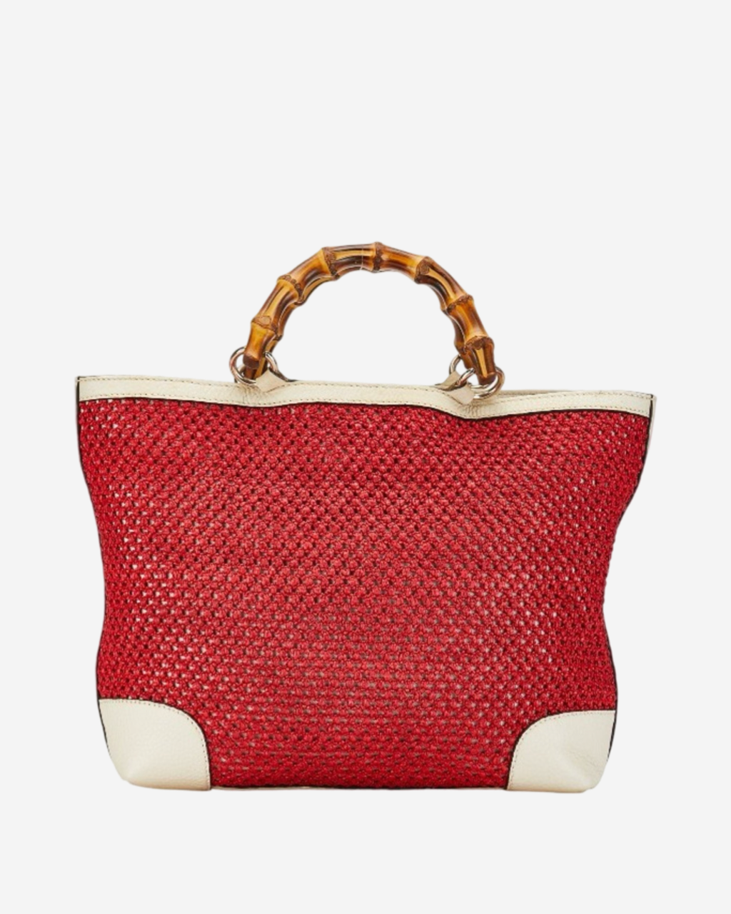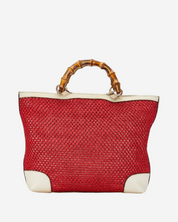- Descripción: Bolsa de mano en piel color beige, detalle de rafia en color rojo alrededor, asa bamboo característica, broche interior, hardware color dorado