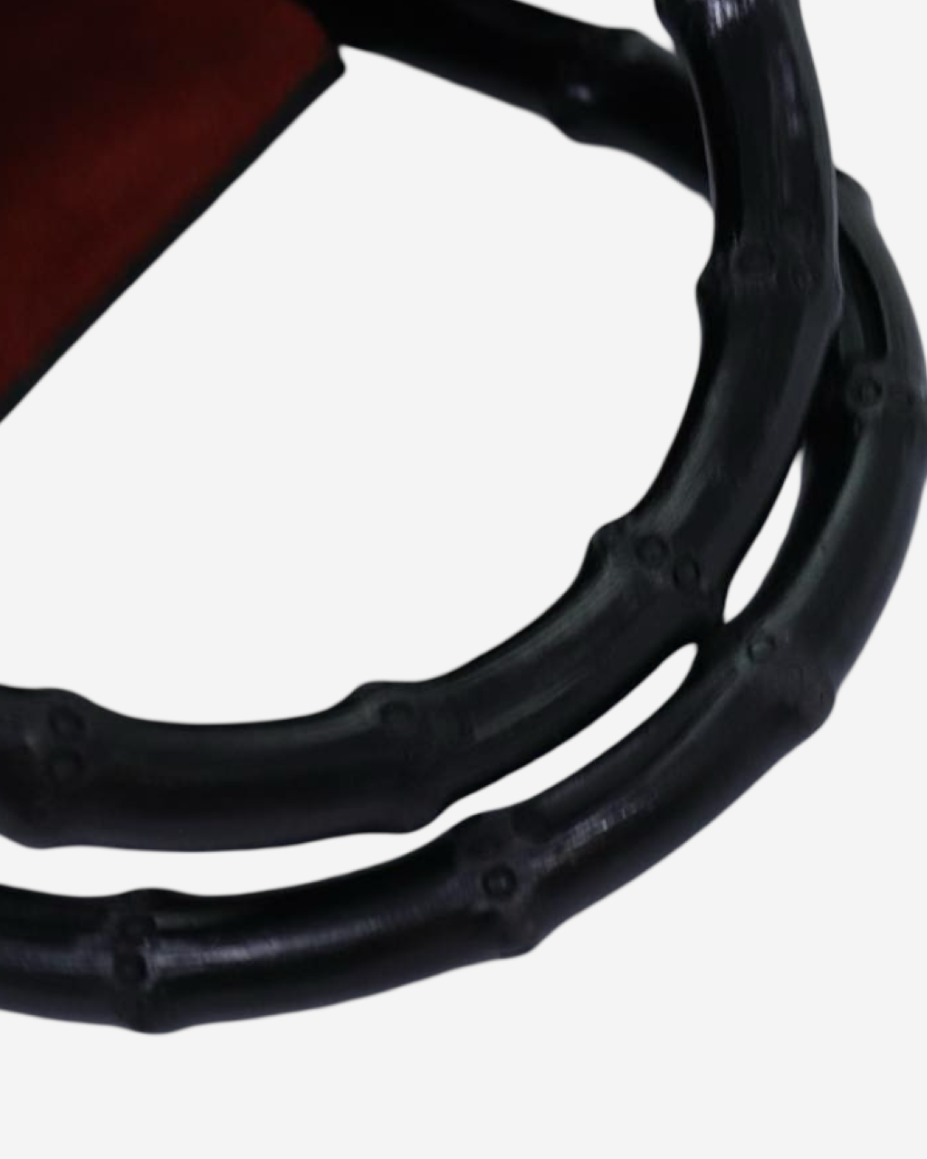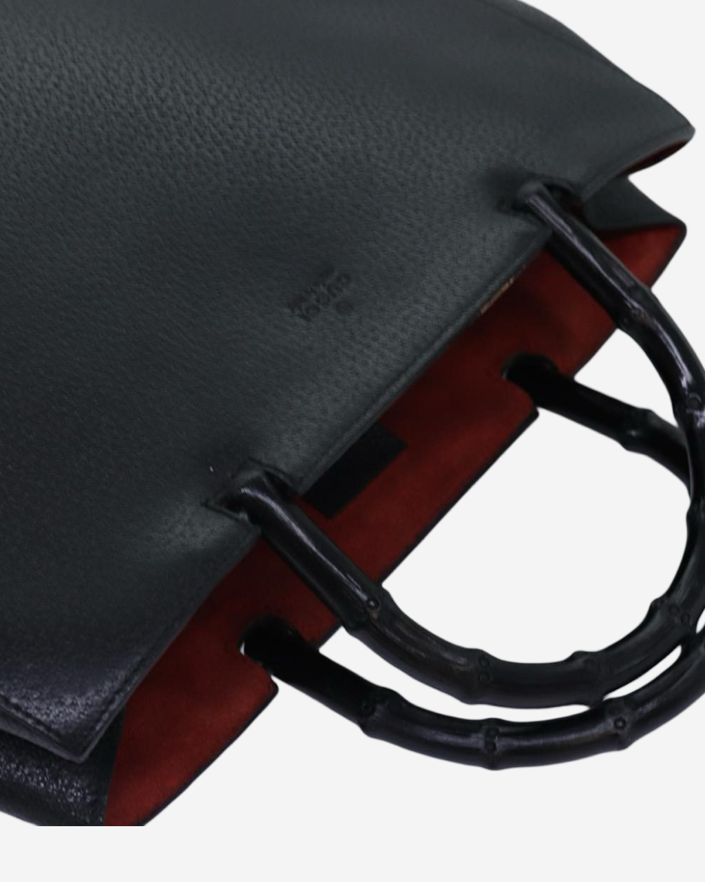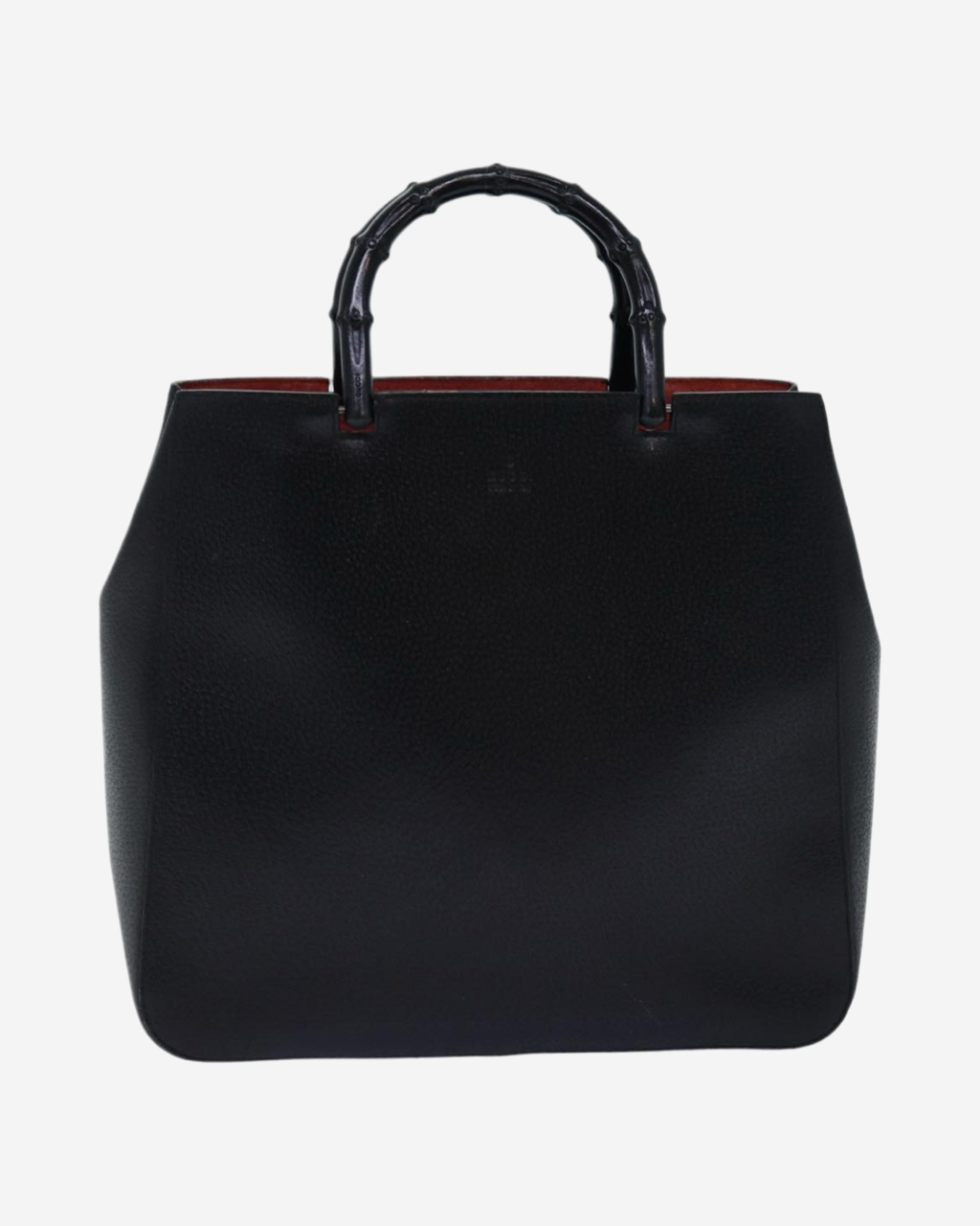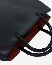 - Descripción: Bolsa de mano en color negro, doble asa fija en bamboo característico, forro interior textil en color rojo