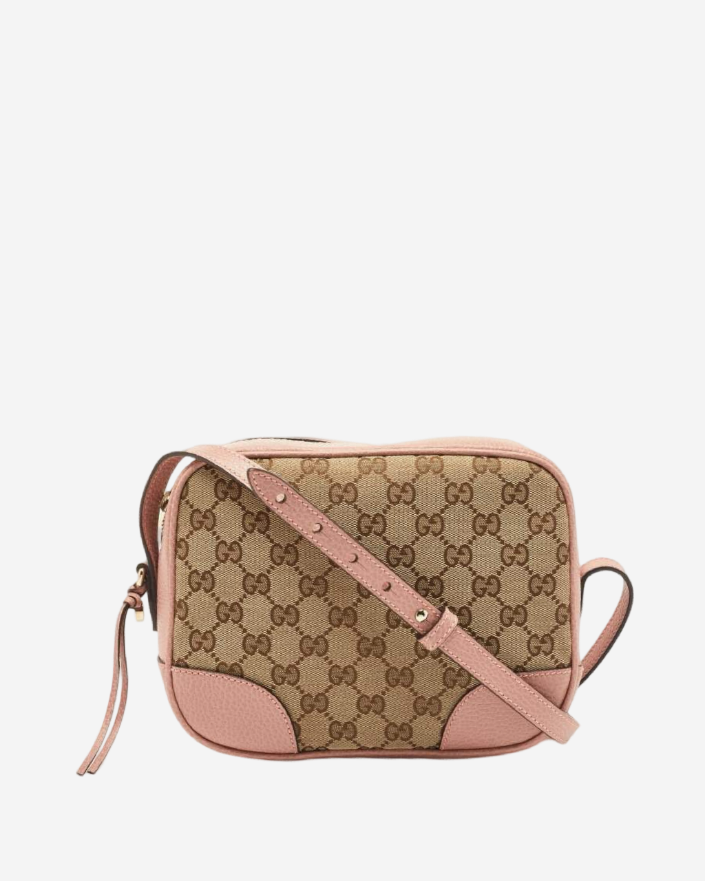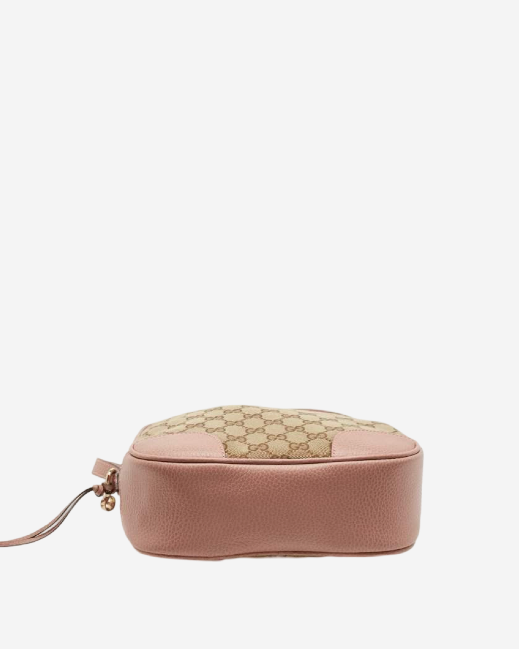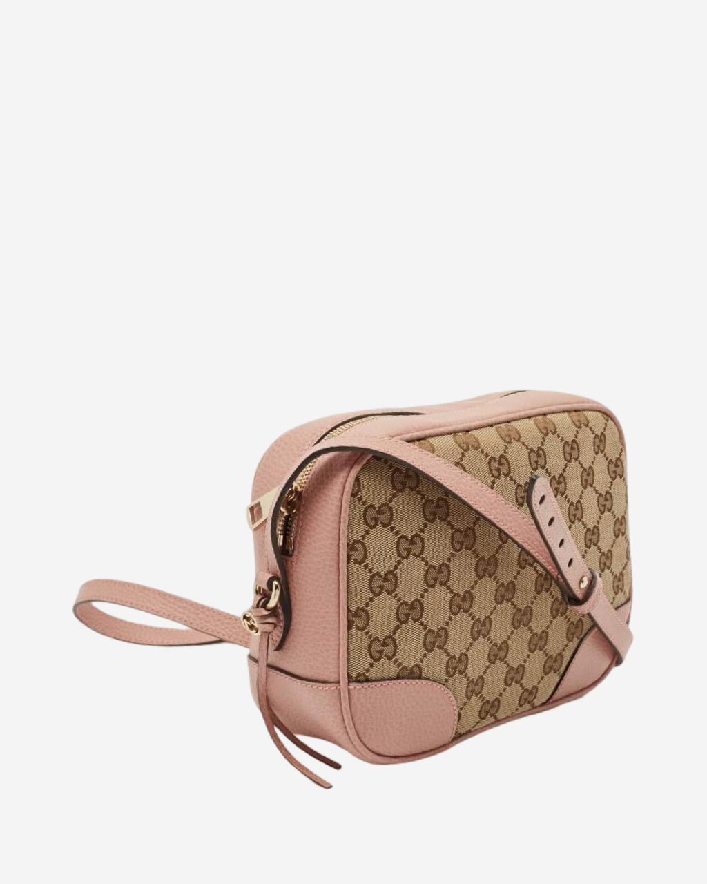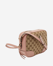 - Descripción: Bolsa cruzada en canvas GG Supreme con detalles en piel color rosa, cierre al tope, strap largo