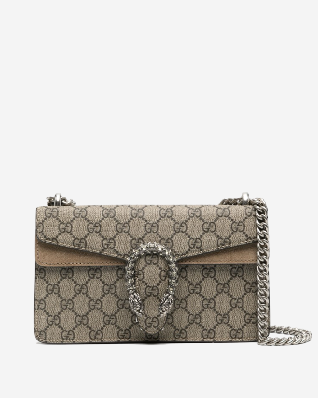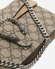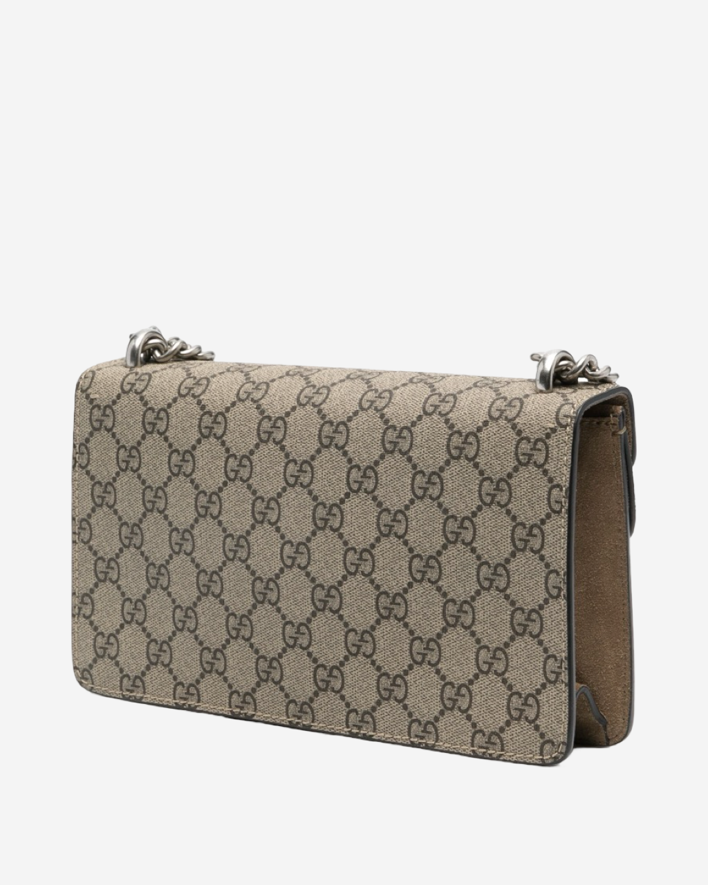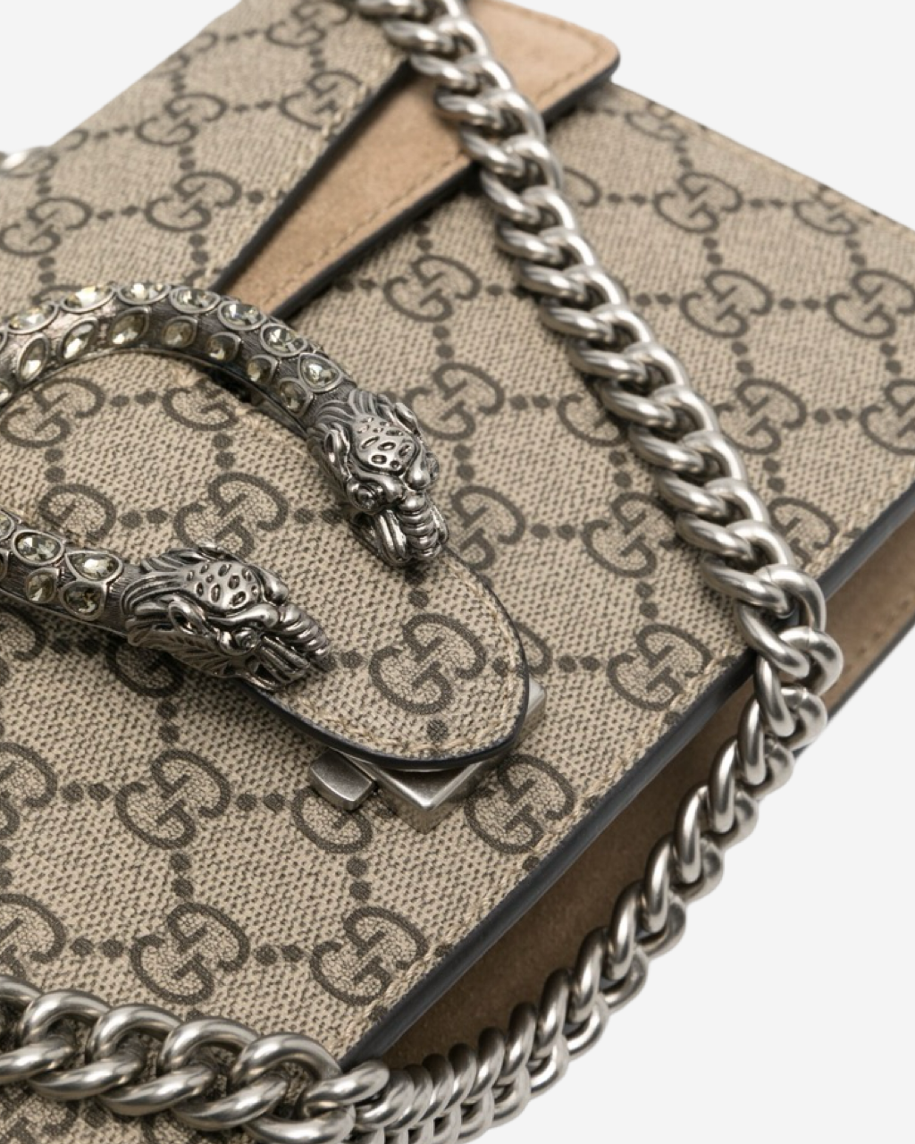 - Descripción: Bolsa Gucci Dionysus mediana en canvas GG Supreme, abertura con solapa, broche frontal con cristales, asa movible, hardware color plateado
