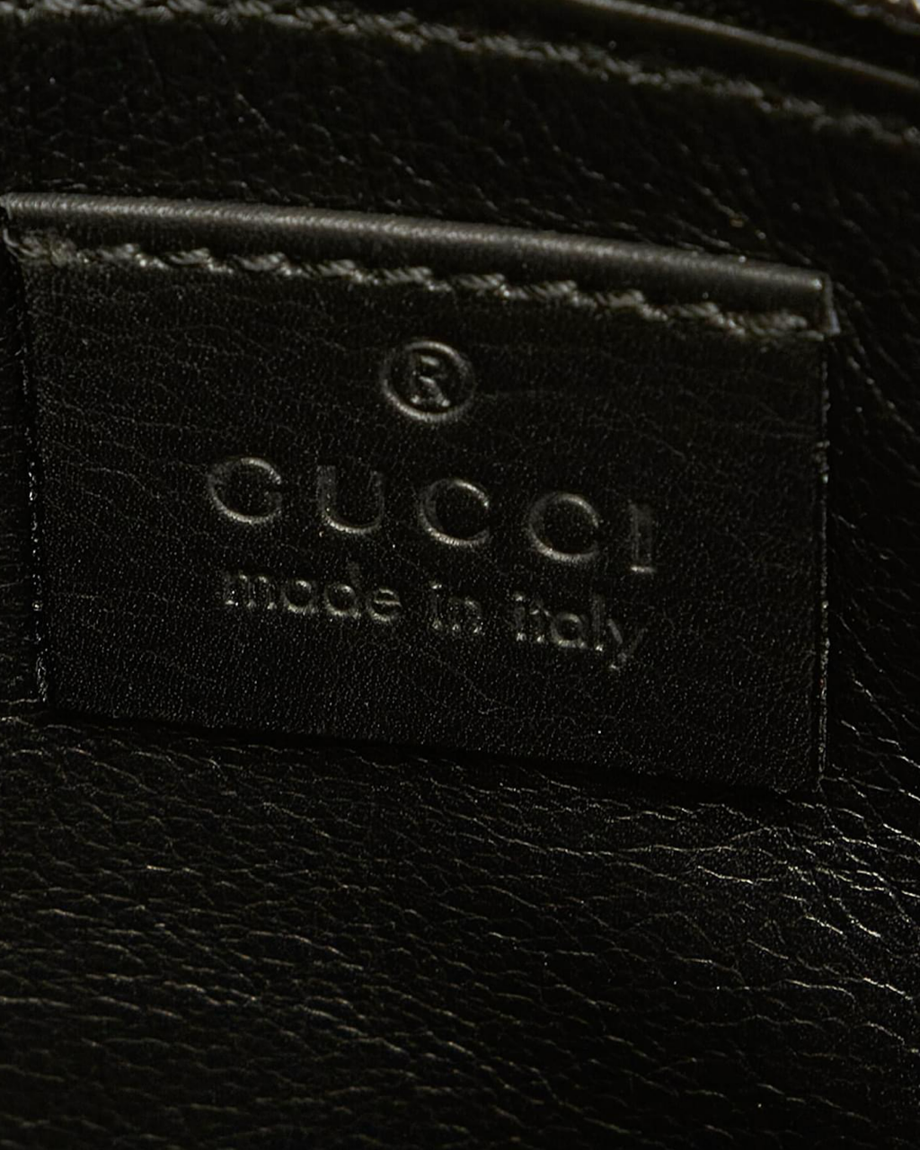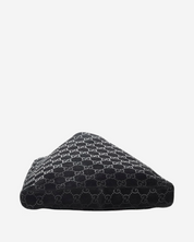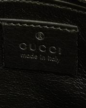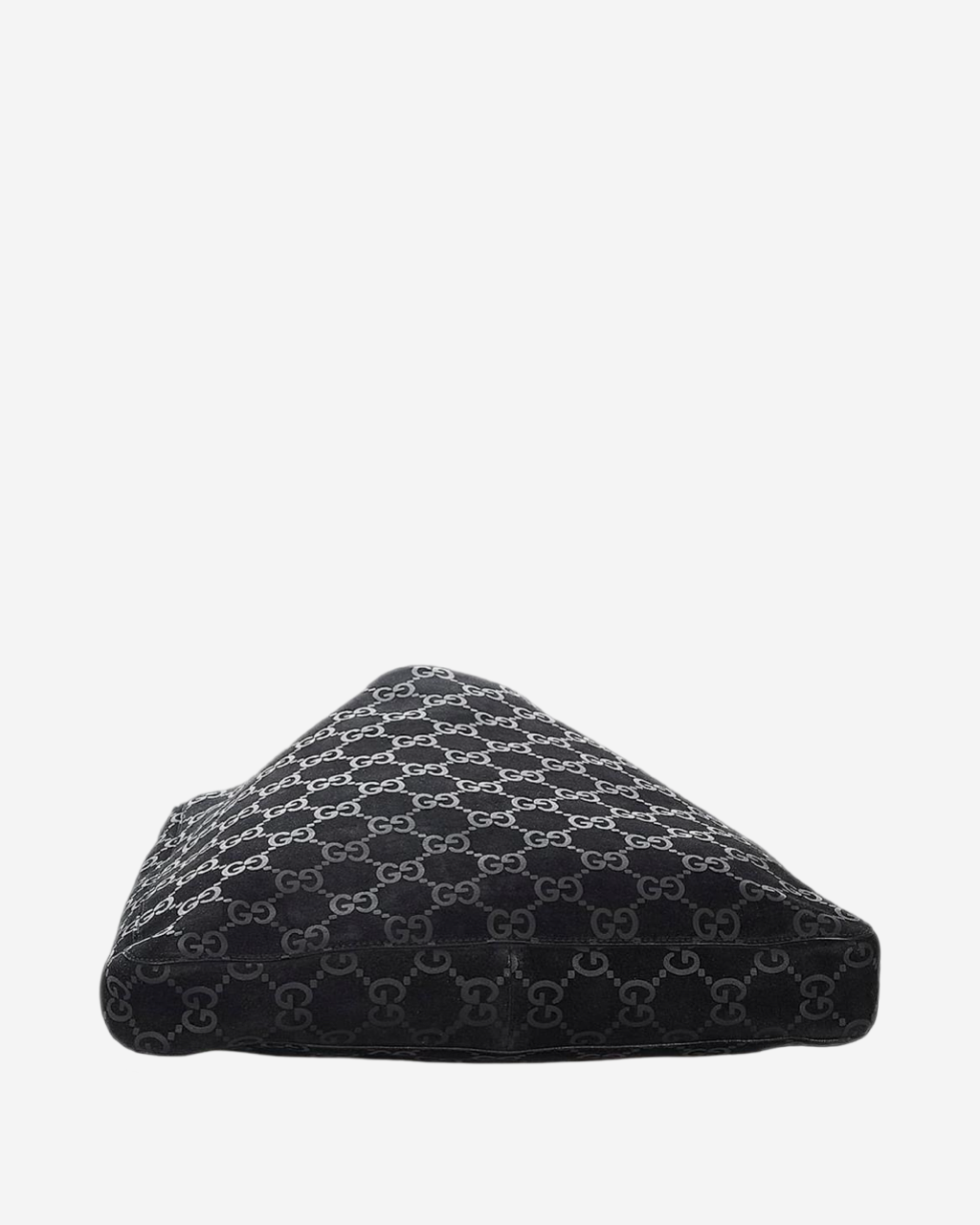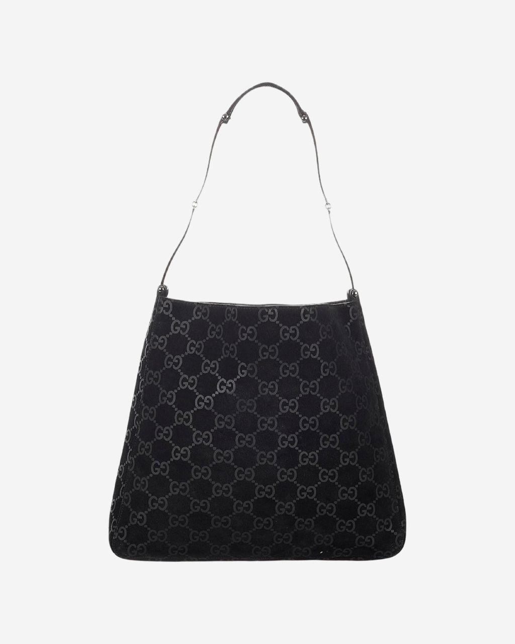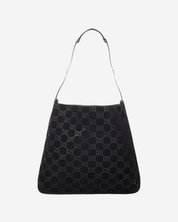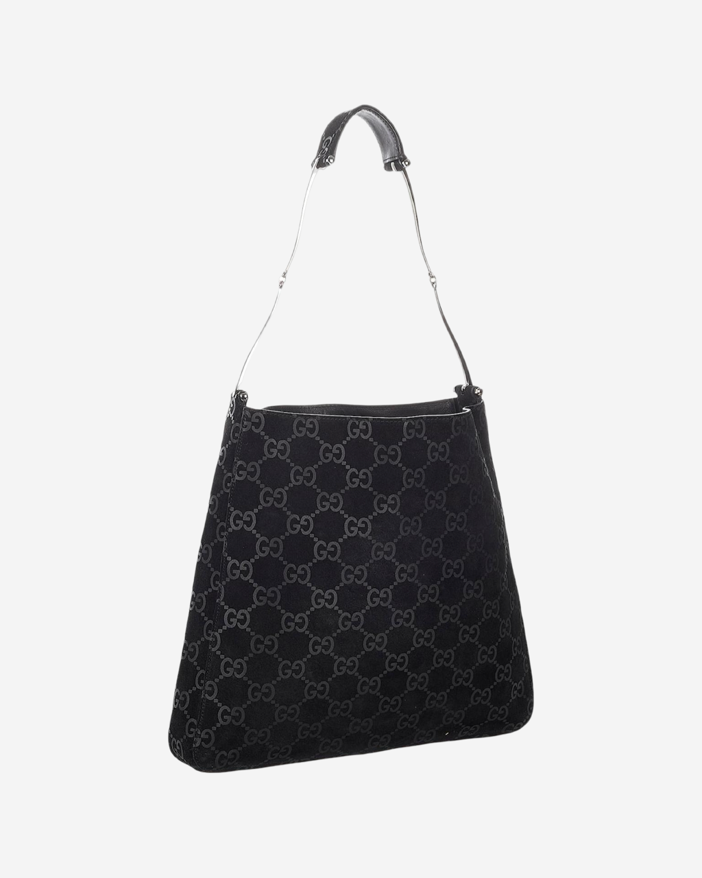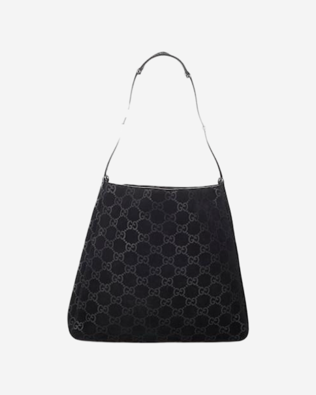- Descripción: Bolsa de hombro en canvas GG, asa fija, abertura principal abierta, pouch interior, hardware color plateado