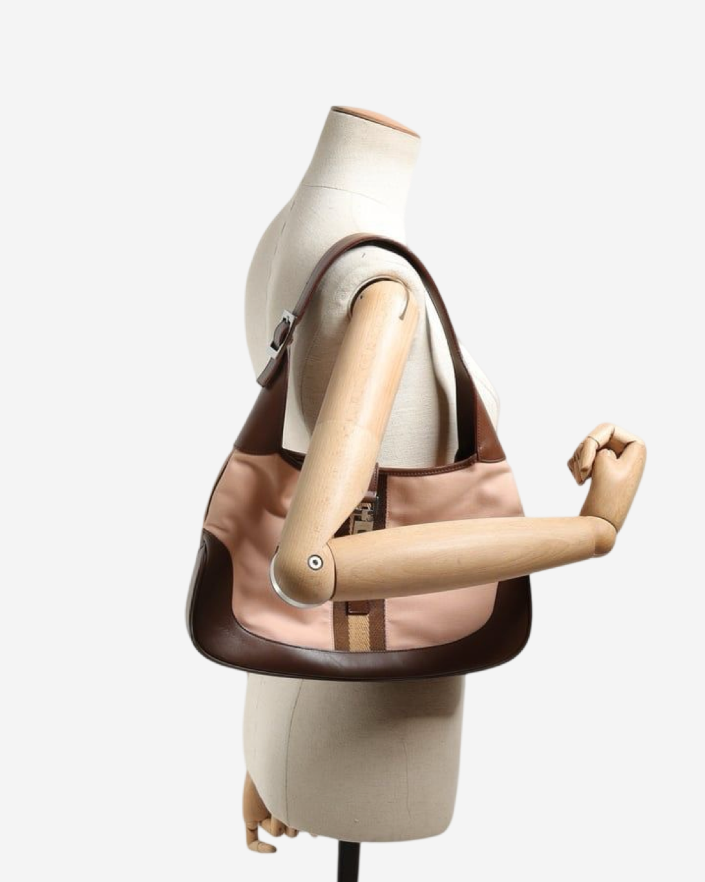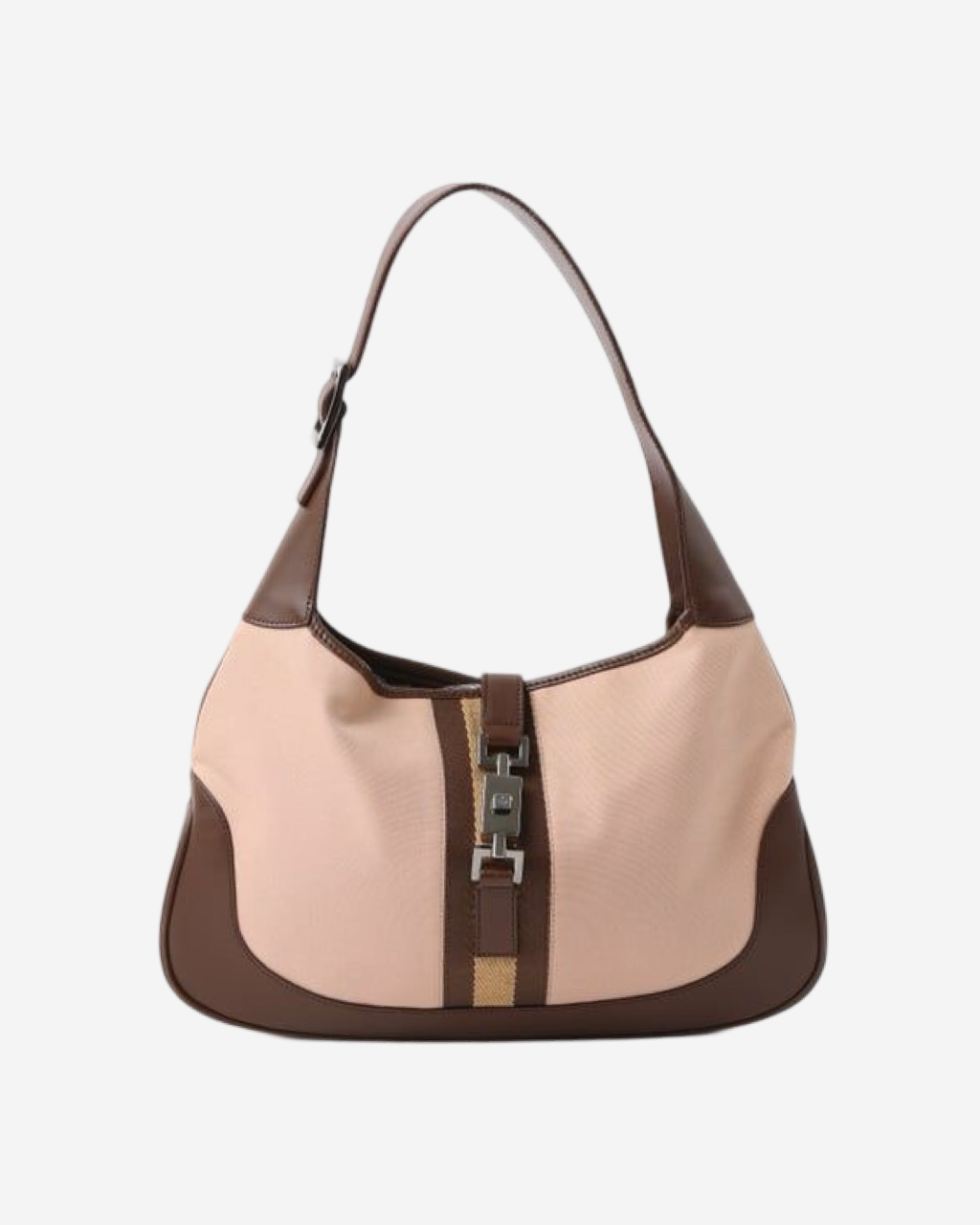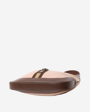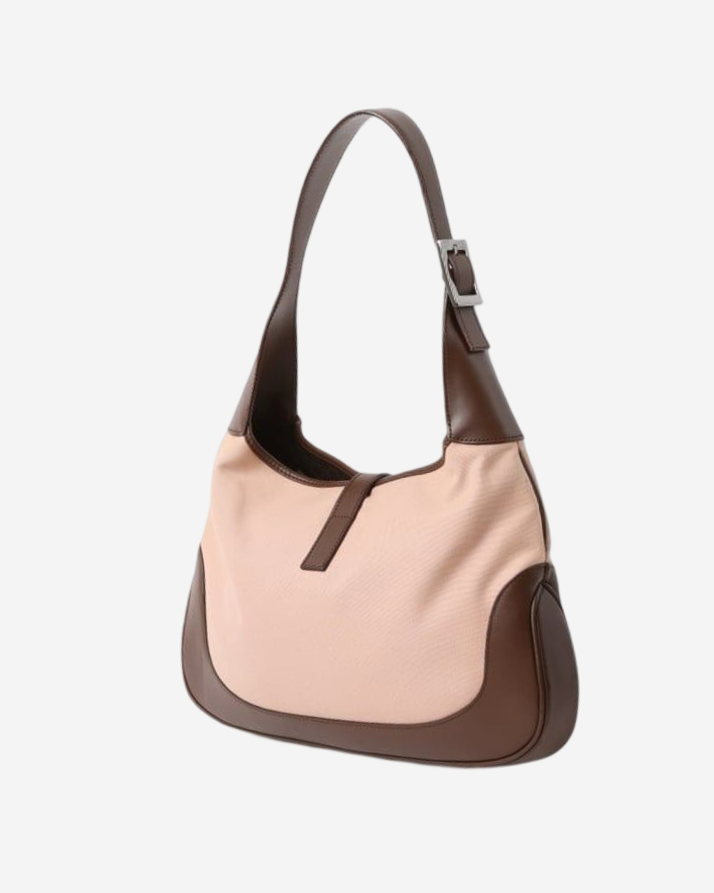 - Descripción: Bolsa de hombro en nylon color rojo claro con detalles en piel, broche frontal característico, abertura principal en lino con bolsillo interior, hardware color plateado