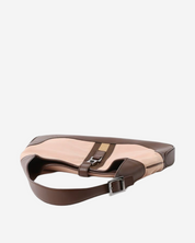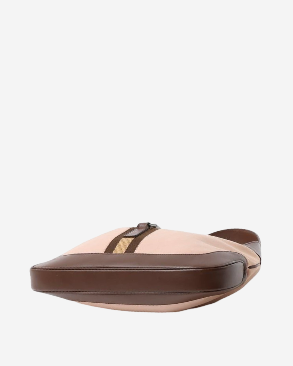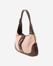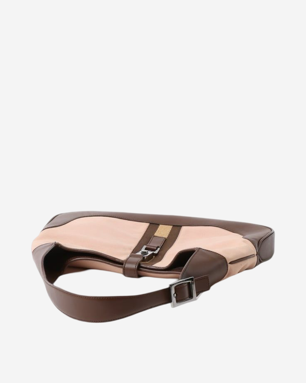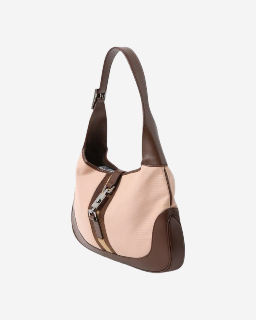 - Descripción: Bolsa de hombro en nylon color rojo claro con detalles en piel, broche frontal característico, abertura principal en lino con bolsillo interior, hardware color plateado