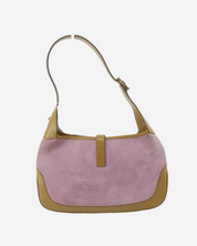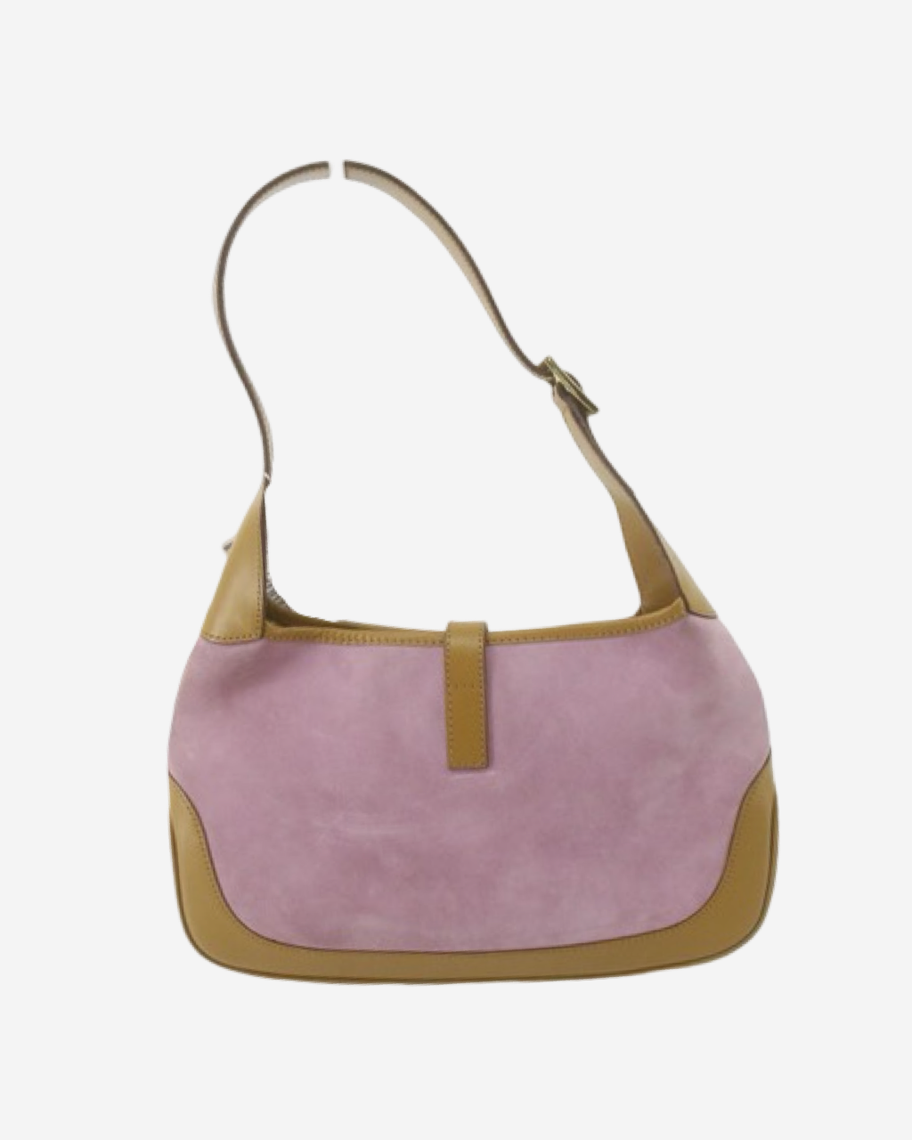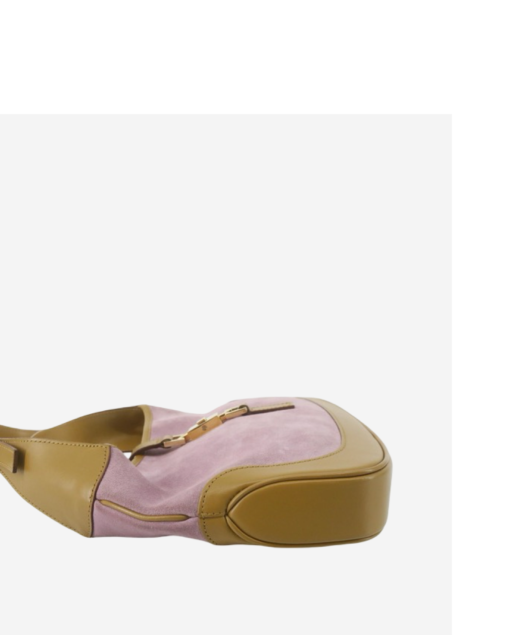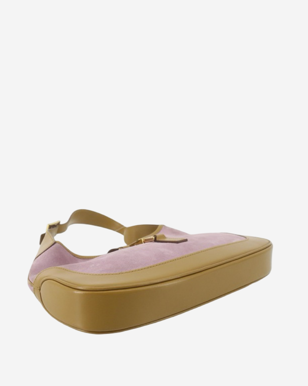 - Descripción: Bolsa de hombro en gamuza con terminaciones en piel, asa fija al tope, abertura con broche frontal, forro interior textil, hardware en tono plateado
