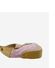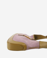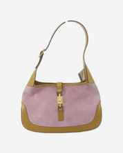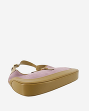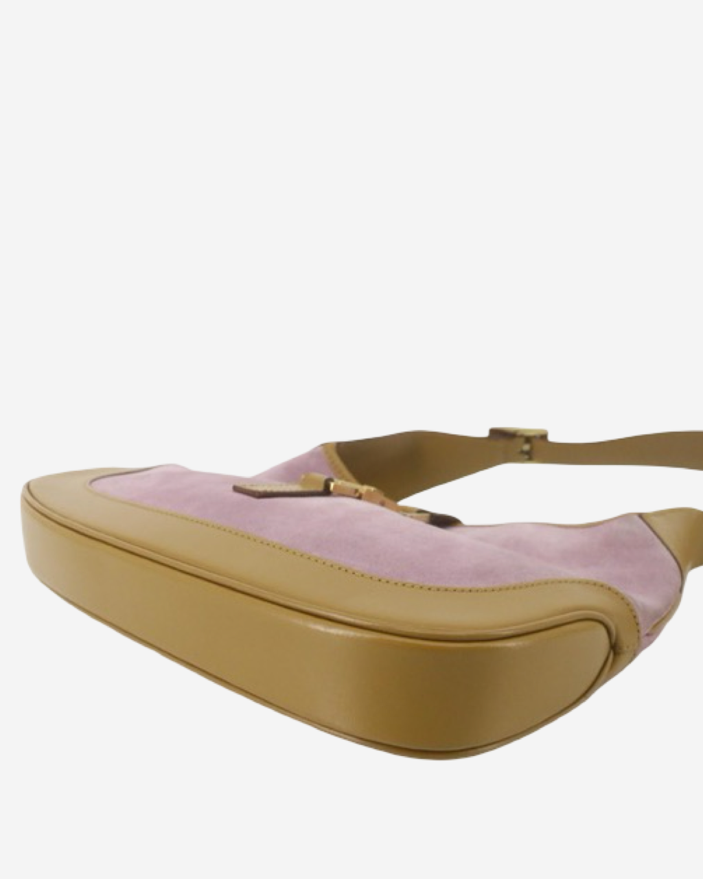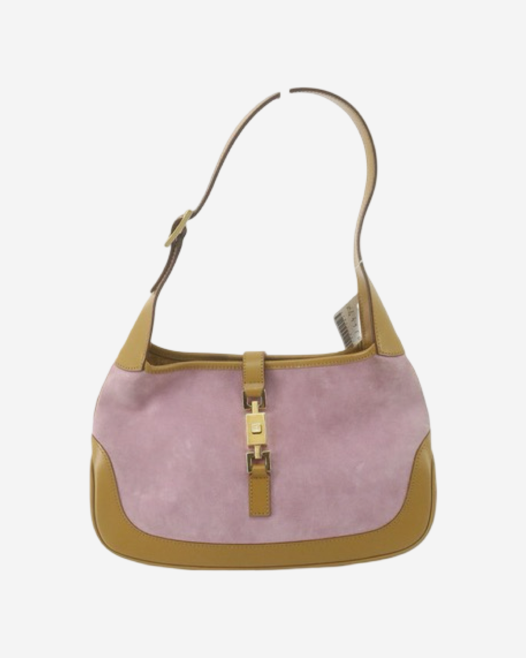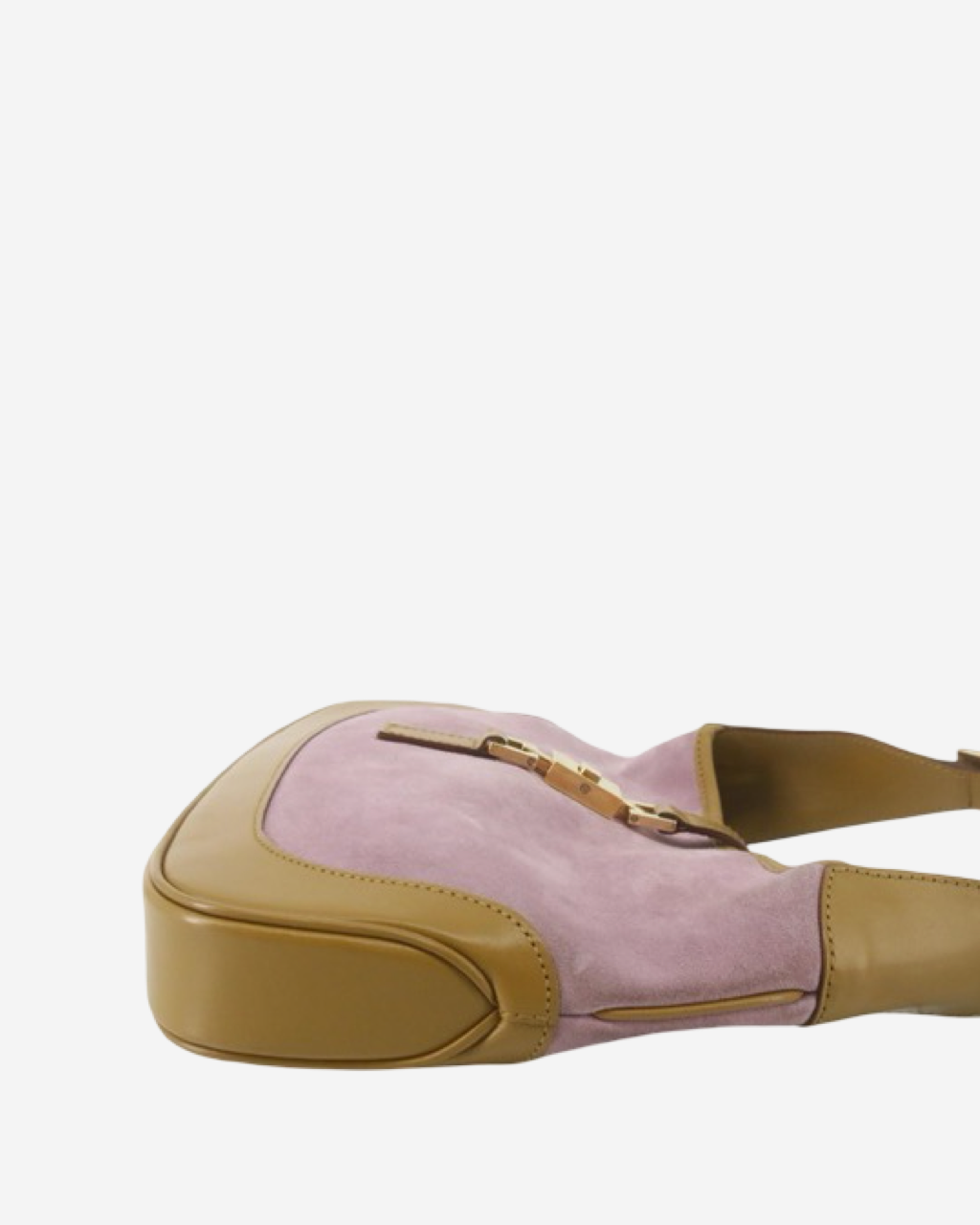 - Descripción: Bolsa de hombro en gamuza con terminaciones en piel, asa fija al tope, abertura con broche frontal, forro interior textil, hardware en tono plateado