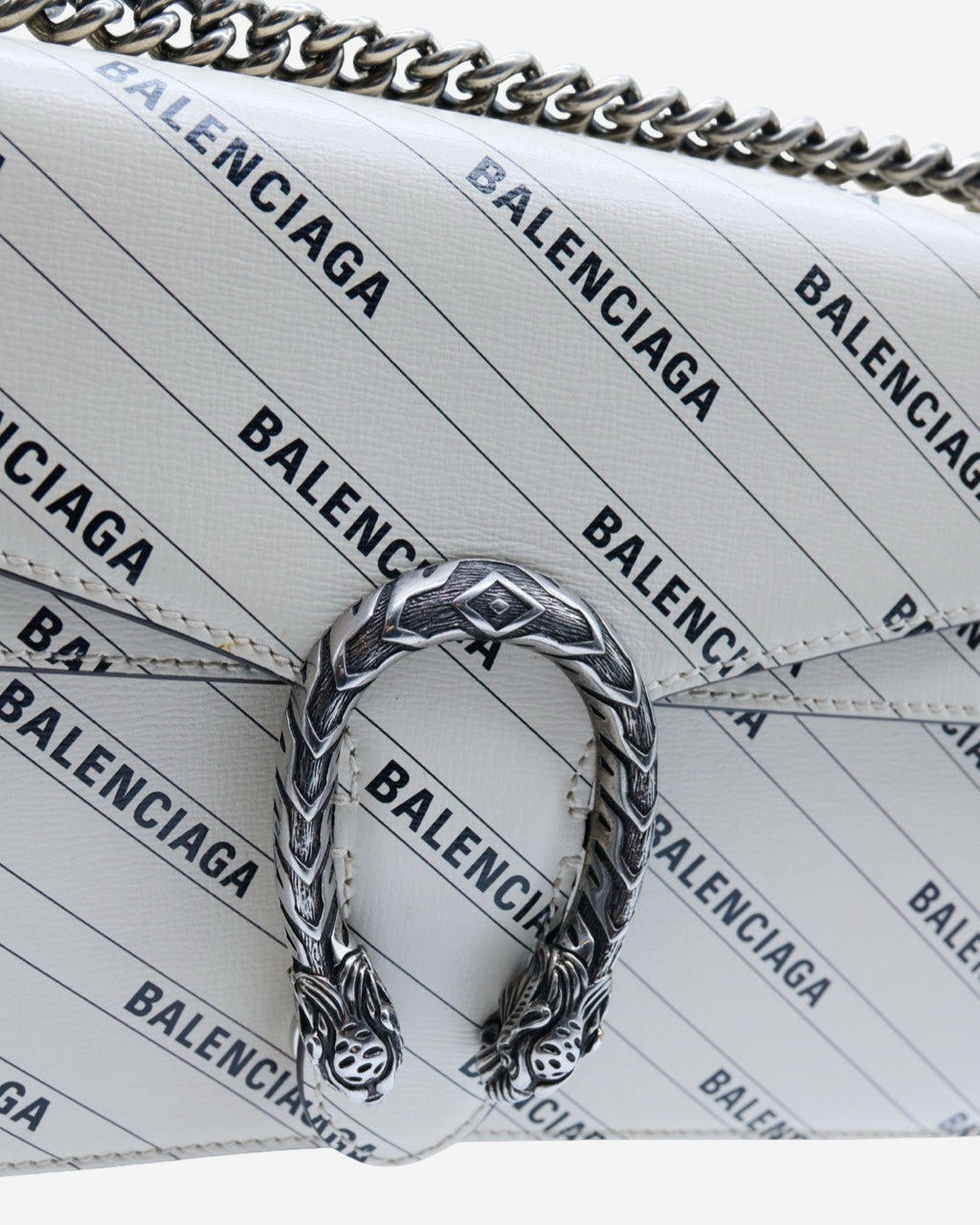 - Descripción: Bolsa cruzada Gucci en piel color beige con motivo de print en color negro, herradura frontal, abertura principal con solapa y broche metálico, asa larga de cadena movible, forro interior textil color beige, hardware en tono plateado