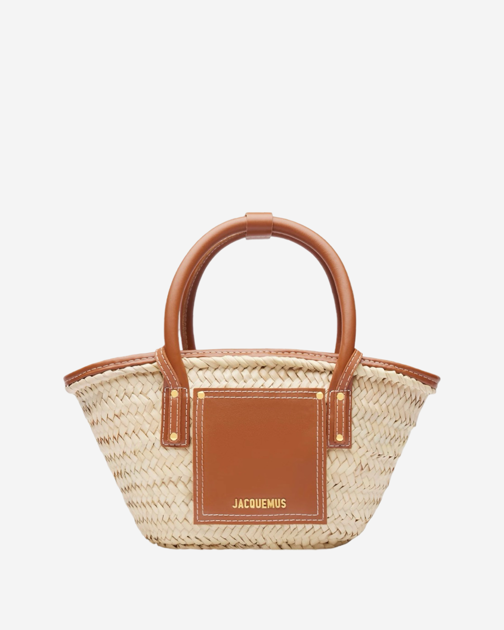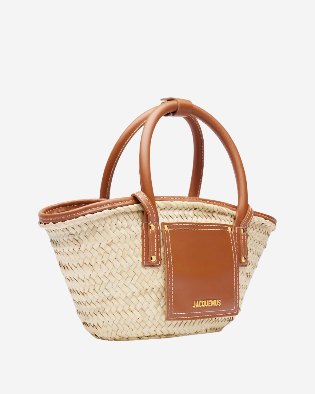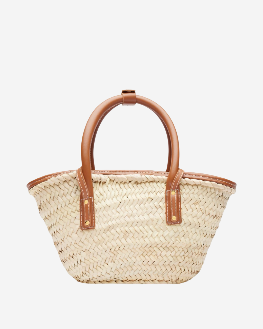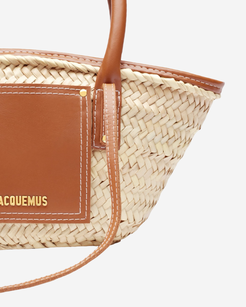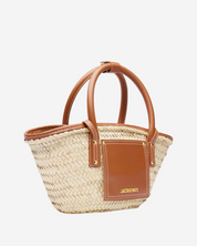 - Descripción: Bolsa de mano con doble asa fija, abertura con broche, detalles en piel color camel, placa característica frontal