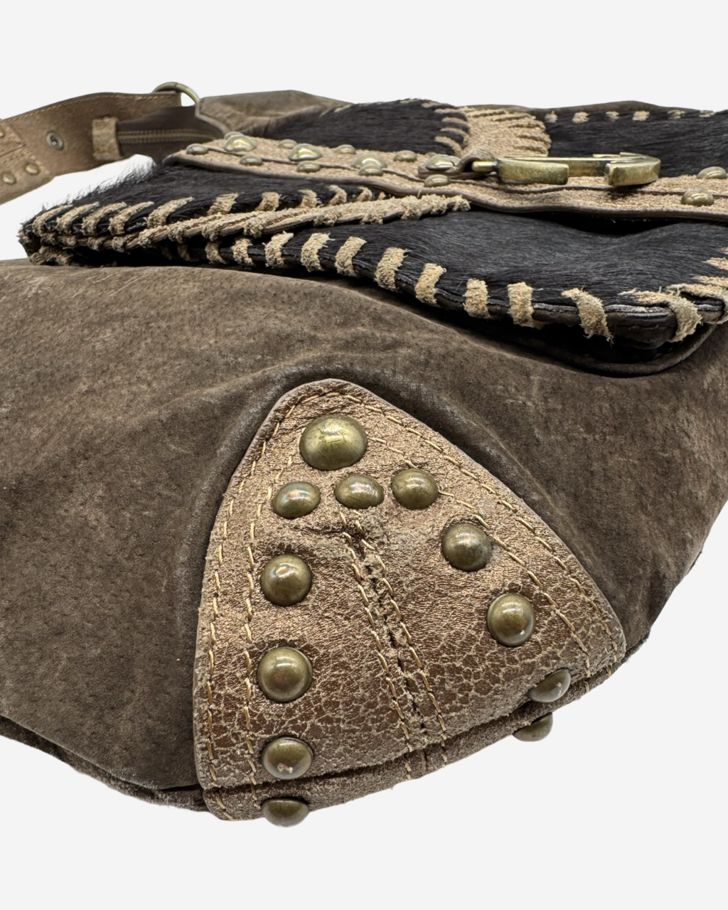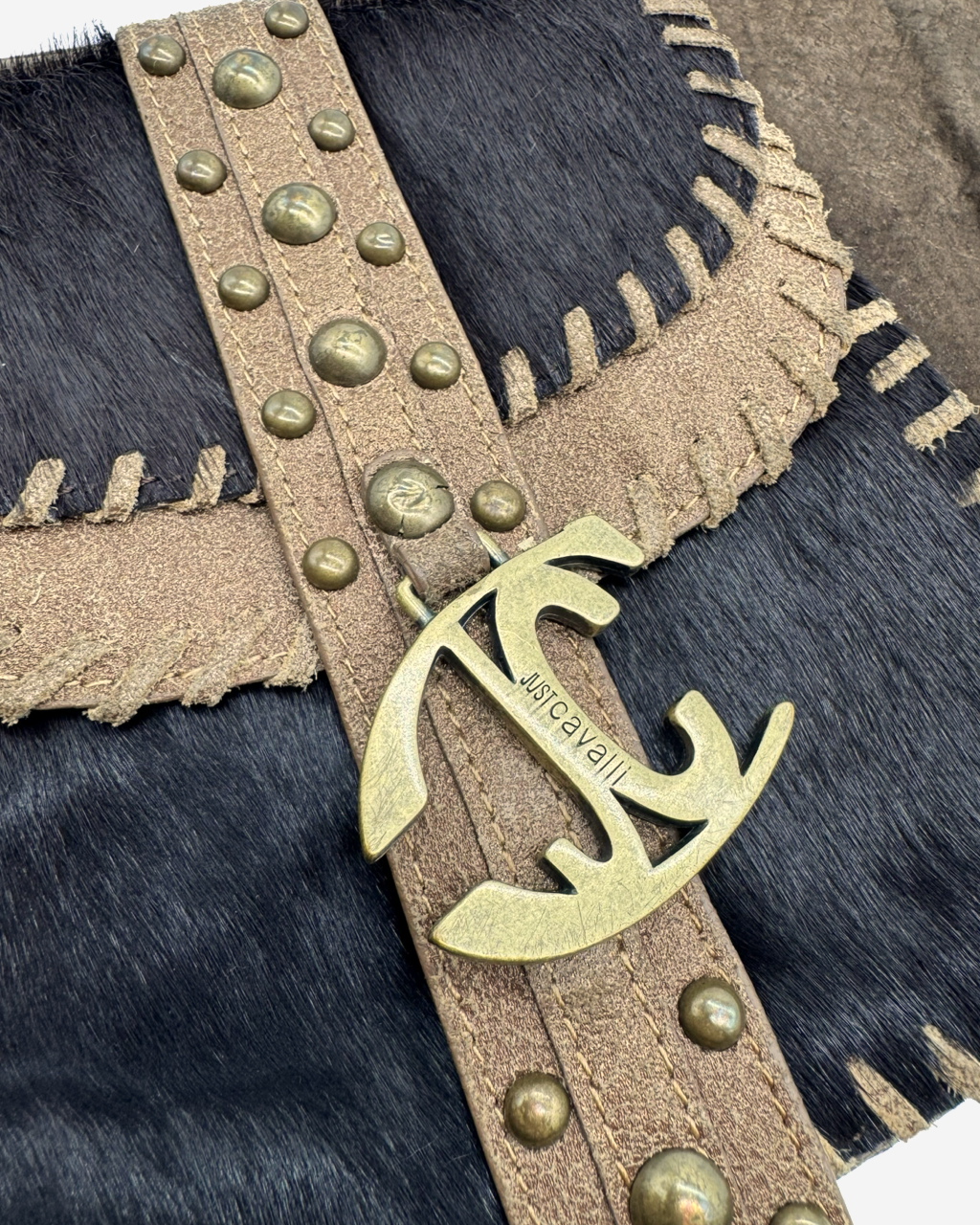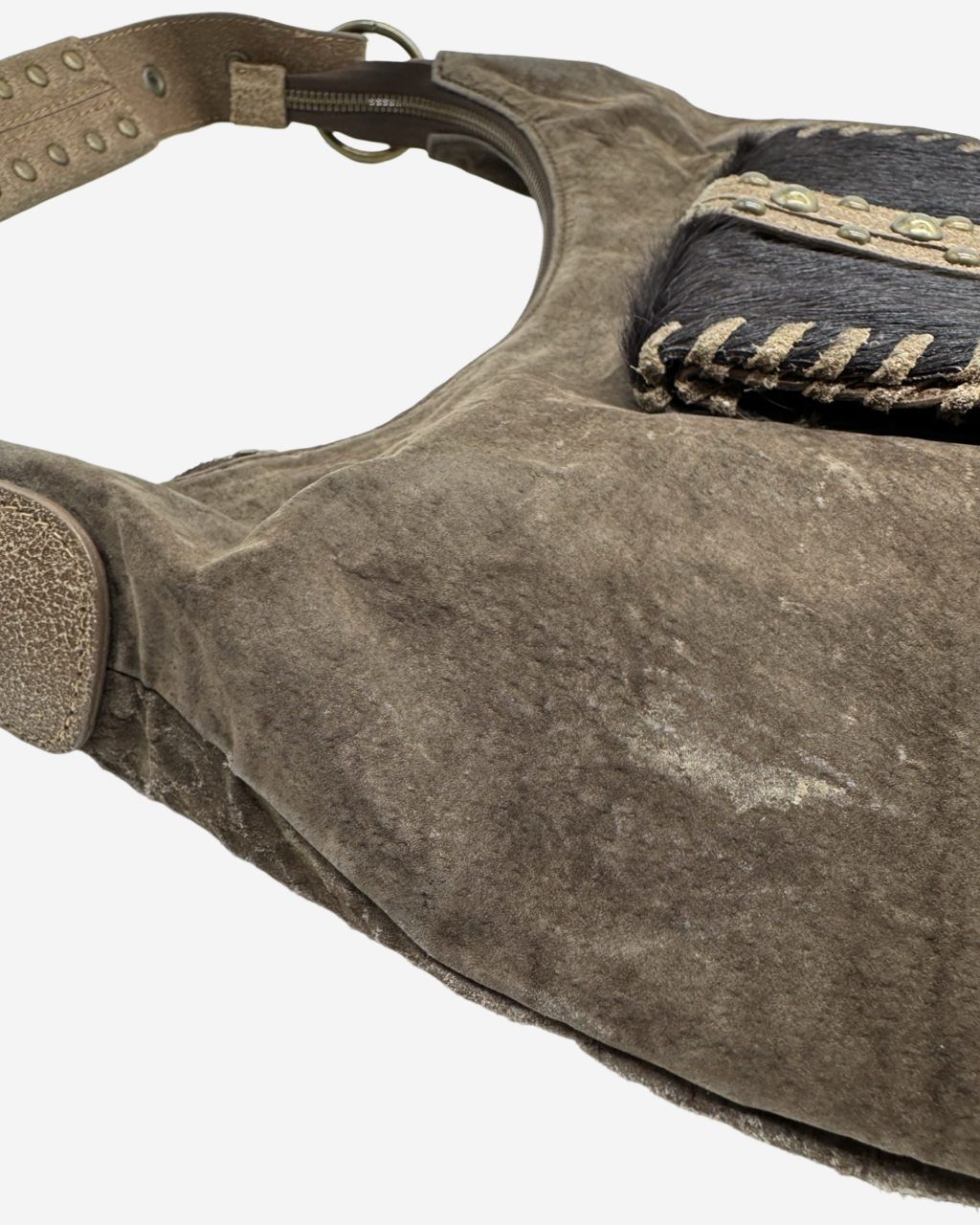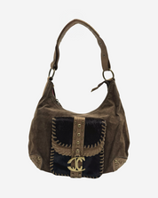 • Descripción: Bolso de hombro en color café, páneles en fur, asa fija, cierre al tope, colgante de logo característico